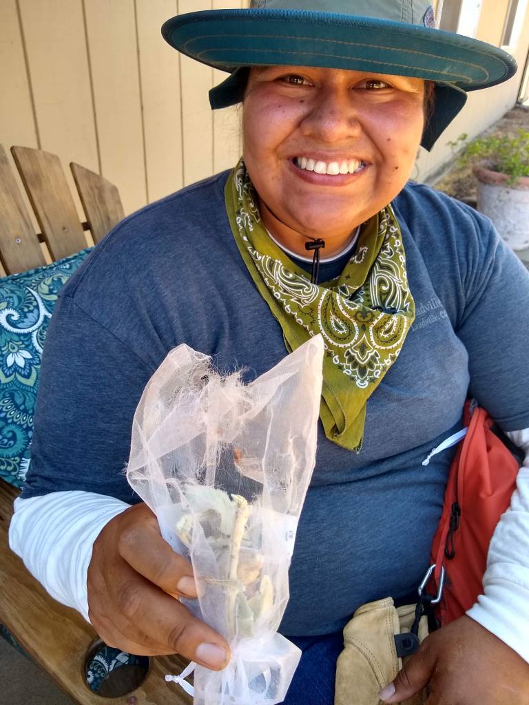 Deedee Soto, from Xerces Society, came to the ranch to retrieve the seed pods from the A. Californica. In the previous post a month ago, I discussed how Deedee came to the rescue and hiked to all the plants to place mesh bags over the pods. The idea was to keep the seeds from being destroyed by the grasshoppers. It worked! I monitored the bags every day, morning and night, looking for signs of breech. Finally, in early July, I let Deedee know that the pods were ready. She came up on July 9 to collect them…and not a moment too soon. Some of the bags had holes in them from grasshoppers. The seeds, however, were still there and looked great. Thank you to Deedee, as always, for her passion and commitment to pollinators. We let some seeds fall to the ground. She took some for propagation, and I kept some to plant over the next few years. Deedee told me that scientists have been finding that aged A. Californica seeds appear to have a higher percent of propagation success when they are older. I have a paper bag of them in my pantry now!