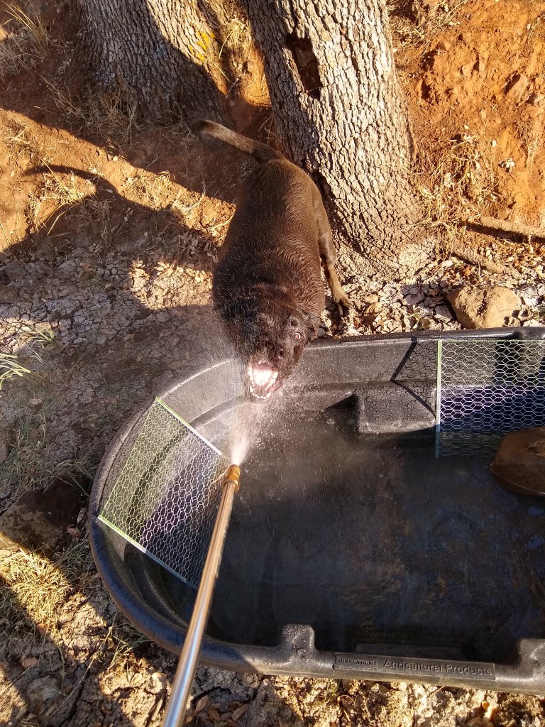 During the hottest days, which was most of July, I had only 45 minutes to get the watering chores done. This meant I was having to be as quick and efficient as possible to get all done before nightfall. Every day for two weeks, I would return after sunset. Fortunately, my neighbor’s Polaris has good headlights. One major drawback of this is that the animals are beginning to come out too. They have been hold-up conserving energy during the heat of day. In one unfortunate occurrence, Millie crossed paths with a skunk. I heard barking, then running through grass. All of the sudden, Millie appeared in the headlights, eyes squinted and pushing her face into the mud of the creek bed. Then the smell hit. Millie had taken a shot right to the face. I rinsed her face with the water I had on the Polaris, then made the trek home to wash her. Needless to say, I kept the dogs in the house when I knew I would be staying out after dark. For those interested, I used a skunk wash recipe, which included an entire bottle of hydrogen peroxide, a cup of baking soda and a teaspoon of dish soap. It really helped, but she has a light stench, and it is a month later.