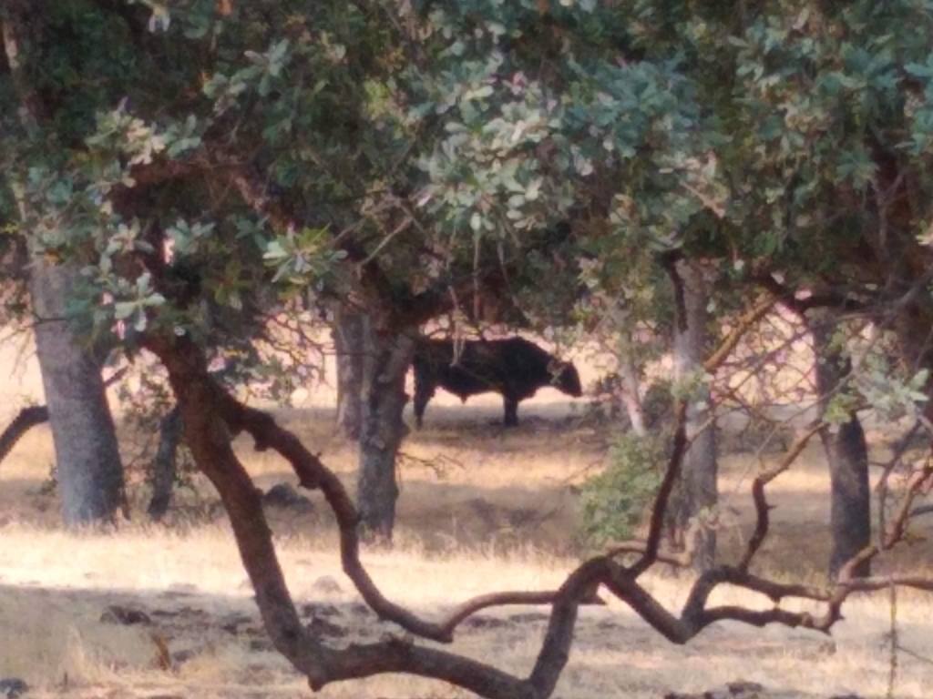 In order to help the animals, I moved a water trough to the location where the pool dried-up. I have been providing about 15 gallons of water as needed to the trough. Monitoring it, I found bird droppings, a feather and witnessed dragonflies, bees and flies using it. I even saw a native bee the other day! Each day I came to the site there was a large owl that I disturbed. It has clearly been useful for my relations. One day, coming to water Site 8, I noticed the trough was completely dry. We have not had cows on the property for over a month, and I had not seen any of the three bulls that were left on the approximately 740 acres of ranch they had access to. I assumed they were hanging close to the larger spring at the mid section of the north ranch, or down by the one pond with water on the south section of the ranch. Well, I turned to look down stream into the forested area, and saw some handsome guys lounging in the shade. The bulls drank it all. Oh well…they need water too. Because I am running low on rainwater, I will wait until they move on to fill the trough again. The wildlife will need to wait just a little longer for these big guys to mosey along.