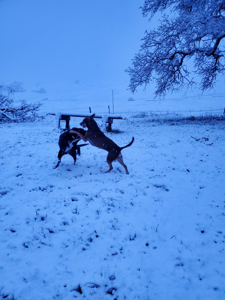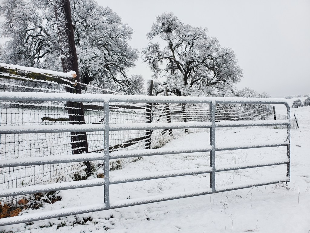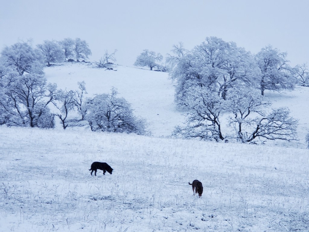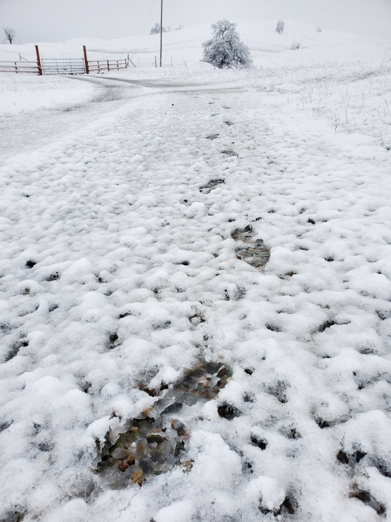 Hornitos is not in the snow belt of the Sierras. When we first moved to the ranch twenty years ago, we would receive a few centimeters, maybe 1/4″, a few times a year. For the past nine or so years, we’ve had perhaps three or four days of snow. In all of those days, the snow would be fully melted by mid morning. Not Saturday (2/25). Like a sci-fi film with time machines, pods or shapeshifters, I went back in time and was inhabited by the joy I felt as a child. Acknowledging that the snow has been a major crisis for many people in my community whose electricity has been out or who have been trapped in their homes for days, at my elevation, it has been a different experience. It moved me to write this essay on snow days.