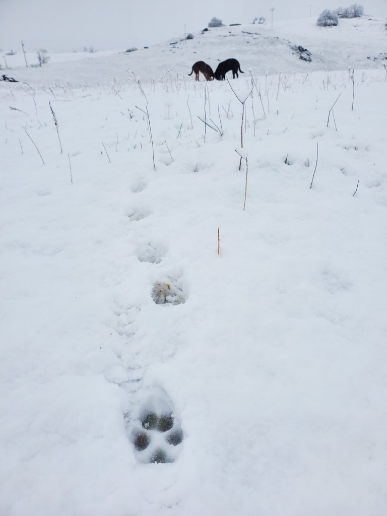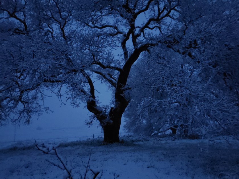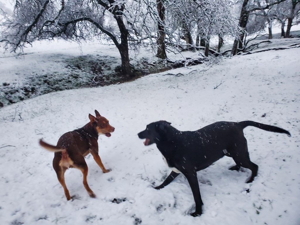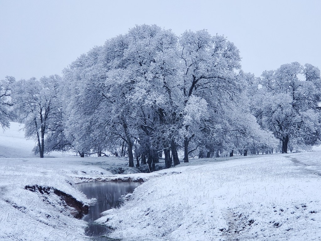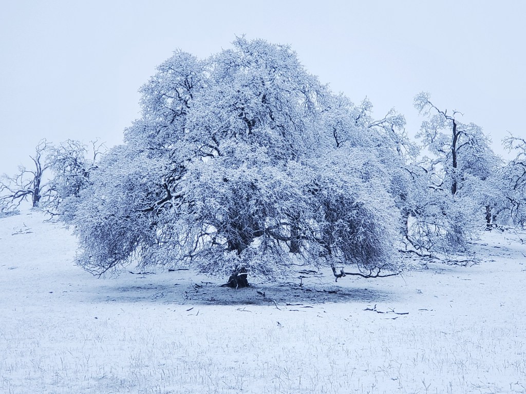 Hornitos is not in the snow belt of the Sierras. When we first moved to the ranch twenty years ago, we would receive a few centimeters, maybe 1/4″, a few times a year. For the past nine or so years, we’ve had perhaps three or four days of snow. In all of those days, the snow would be fully melted by mid morning. Not Saturday (2/25). Like a sci-fi film with time machines, pods or shapeshifters, I went back in time and was inhabited by the joy I felt as a child. Acknowledging that the snow has been a major crisis for many people in my community whose electricity has been out or who have been trapped in their homes for days, at my elevation, it has been a different experience. It moved me to write this essay on snow days.