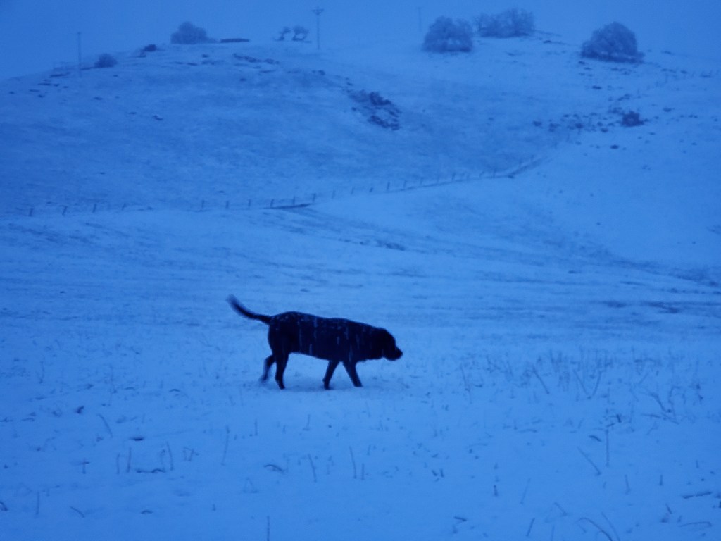 Fortunately, I slept in something warm – a holey cashmere sweater and old exercise pants – because I went straight out the door. I didn’t have time for boots. I pulled on my gray sheepskin slippers, dogs at heels, brain fuzzy with joy. It was snowing and cold…and I did not care. The dogs immediately began running and playing. They too know how remarkable it is to feel the fluff of frozen water, snowflakes delicately stacked one on top of the other.