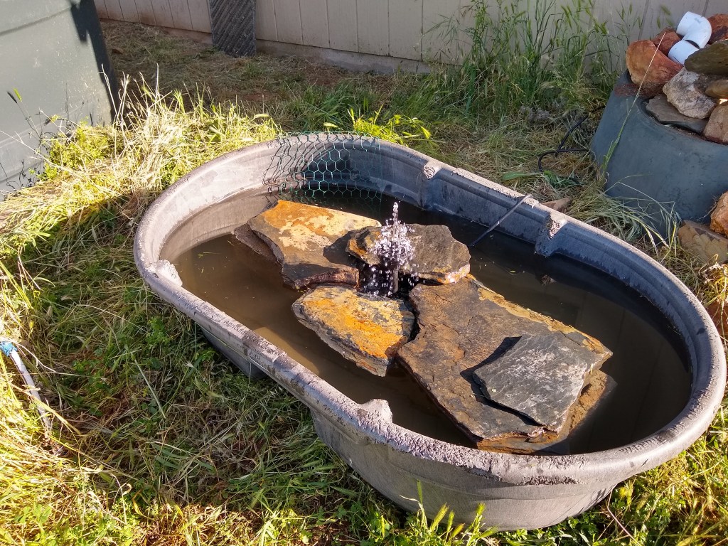 I also made a do it yourself fountain. It isn’t pretty, but I am hoping the pollinators will approve of it. It is supplied by clean, clear rain water and has multiple depths of water including having the spray just moisten the surface of a piece of slate. I have seen butterflies, dragonflies and bees just skirt or land on wet rock or my moist patio after watering potted plants. I used an old stock trough, slate found in the creek, cinder blocks laying around that were from some long forgotten project, and a large fountain kit from Lowe’s. The cinder blocks were used to raise the slate to the surface as well as hold the pump firmly in place. Finally, I included some firm coated chicken wire so that if any bats or other creatures get caught in the deeper water, they can get out.