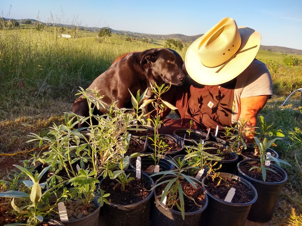 Heather, with fur friends, hauls water from the rainwater barrel in the truck to Site 8 and the deer grass site.