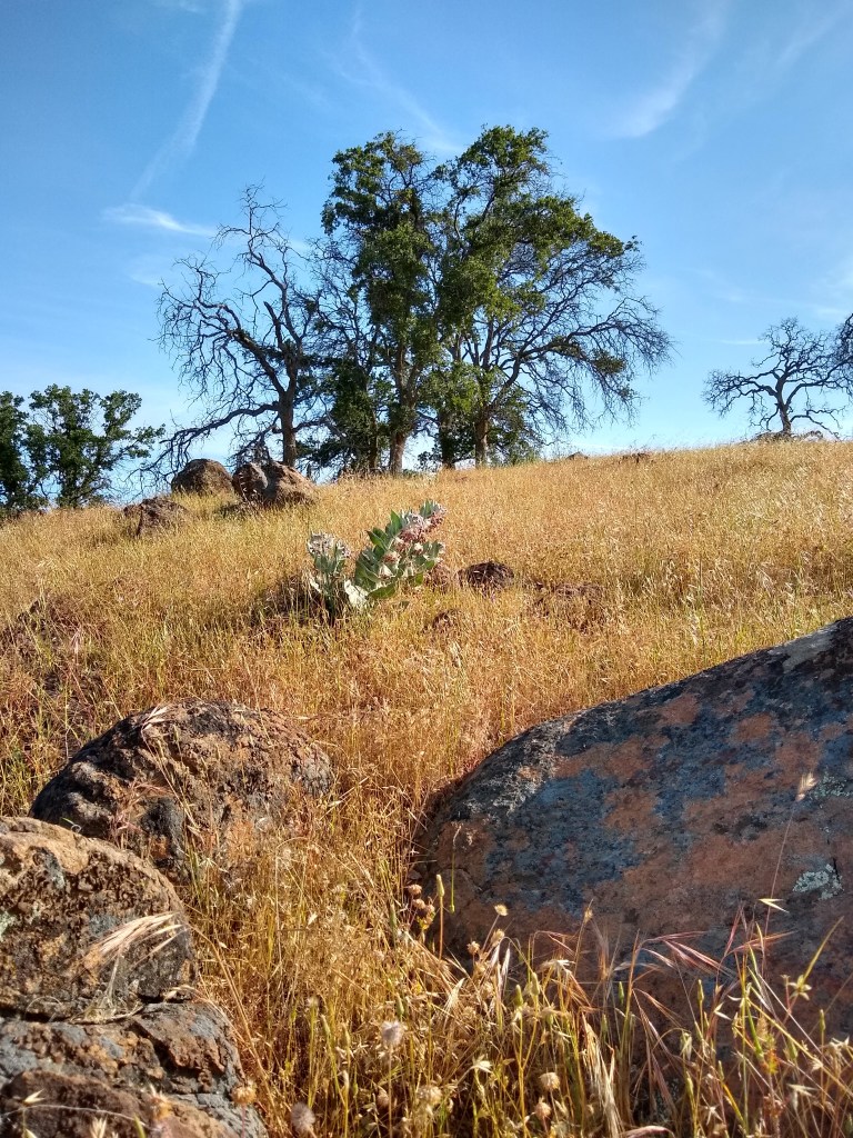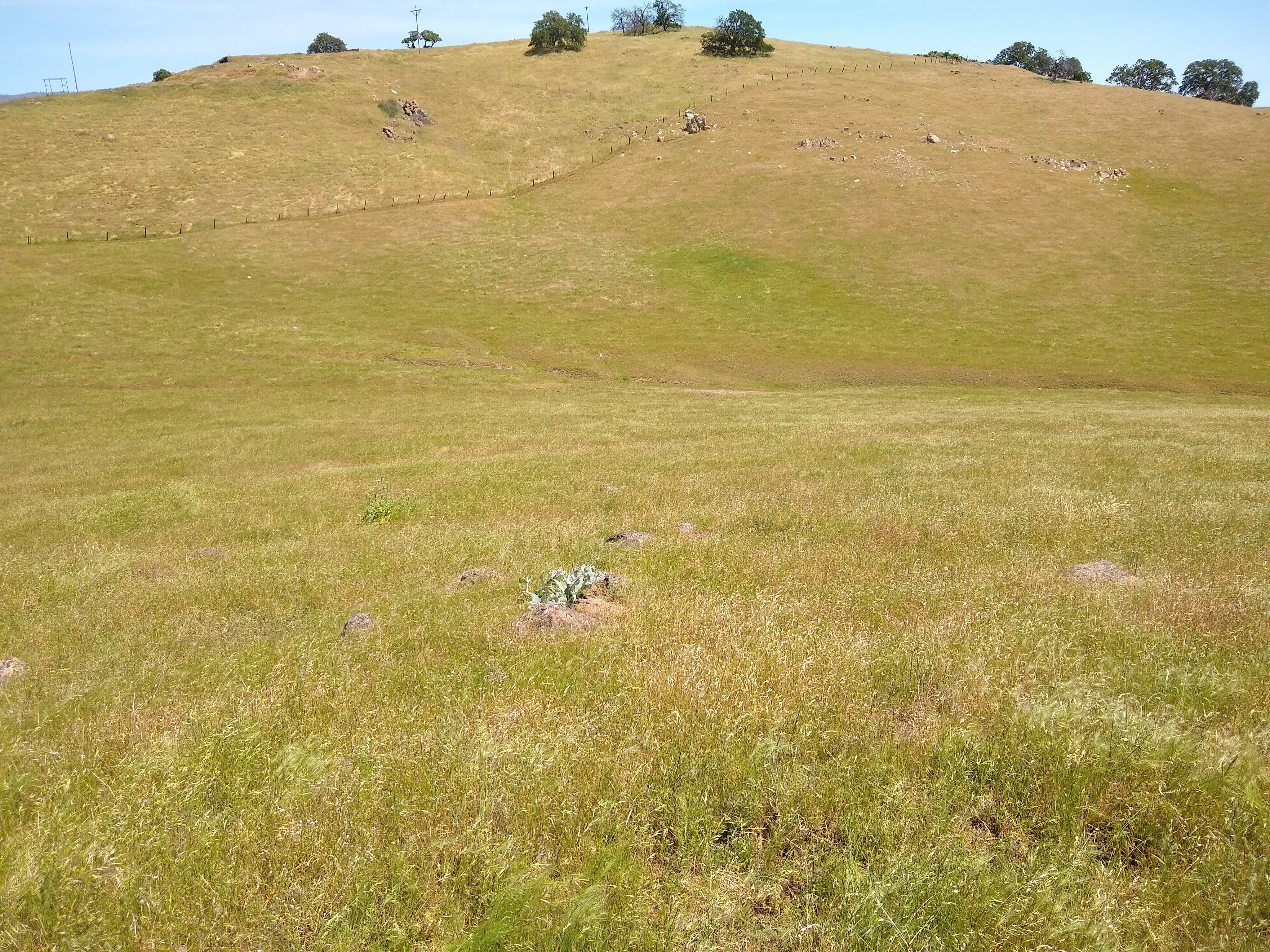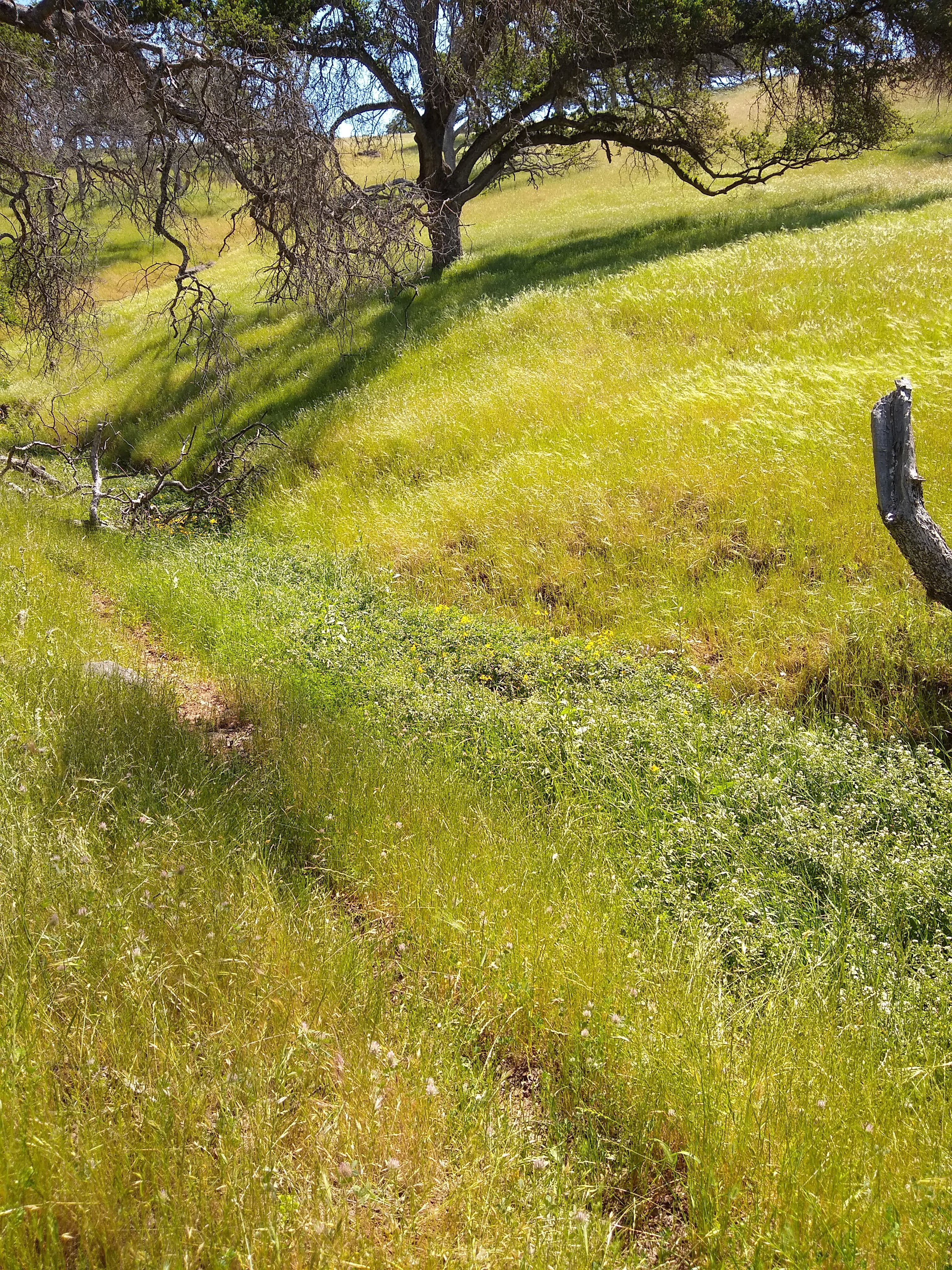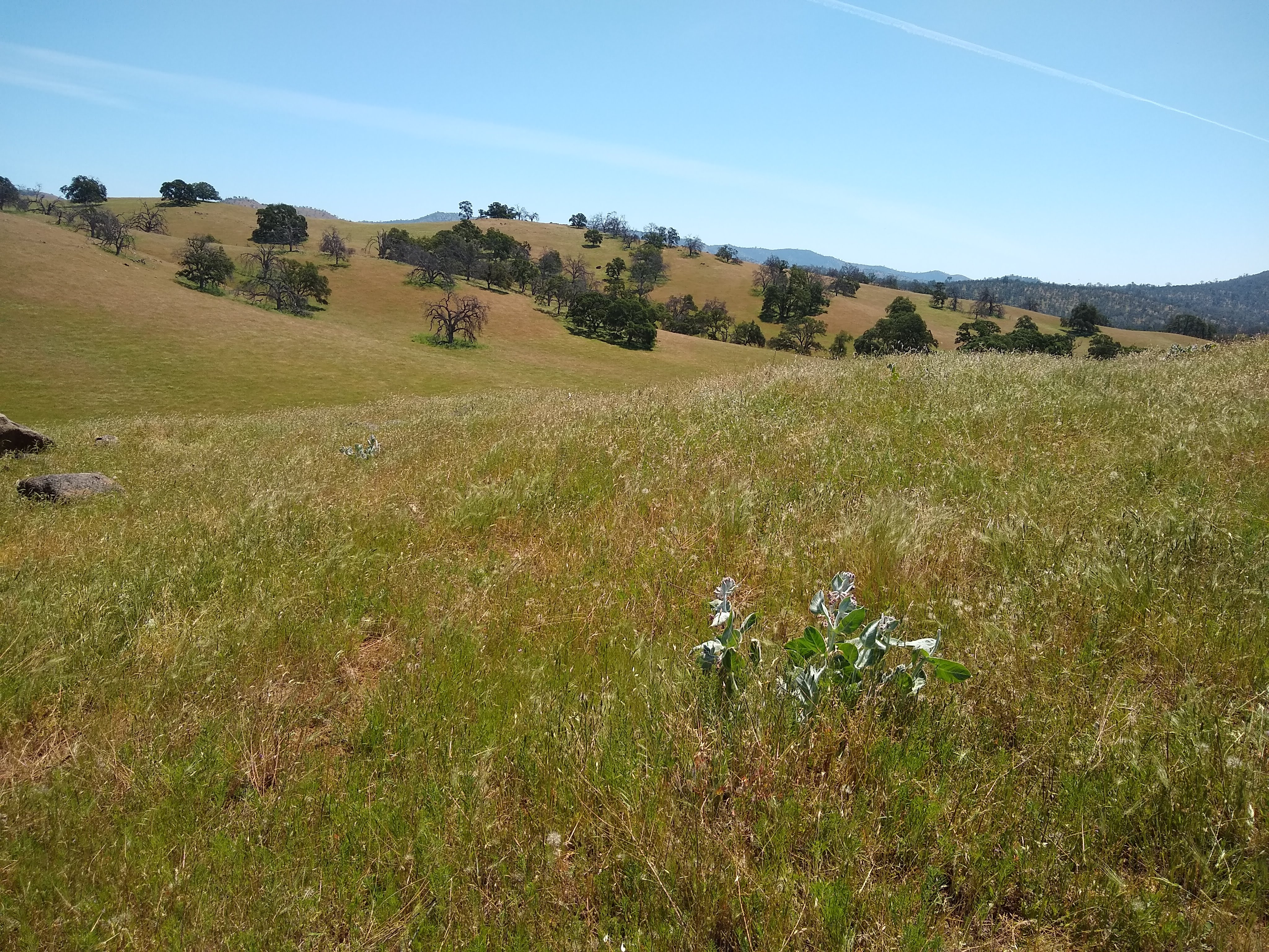 Millie and I set off for the mid part of the ranch. We got distracted by the south facing section of the hill that had a. californica on the west slope. We hiked up about 1000 feet, and did not see any. This put us on a different path than anticipated. We had intended to visit a hill on the east side of Odom Creek. We continued down the east slope of the hill toward our destination. Although we started our adventure at 6:30am when the sky was filled with moist clouds, by 7:30am, the clouds had broken up and the sun was out. The temperature was beginning to get hot. We made it to the base of the hill and decided not to climb it. I did look at the rocky areas for signs of the silvery large leaves, but did not see any. We will need to return and investigate more fully. We also have another hill on the neighbor’s side of the ranch that might be conducive to a. californica tastes. We will explore there too. Millie and I returned home “empty handed” but better for the extraordinarily beautiful, if not rigorous, walk.