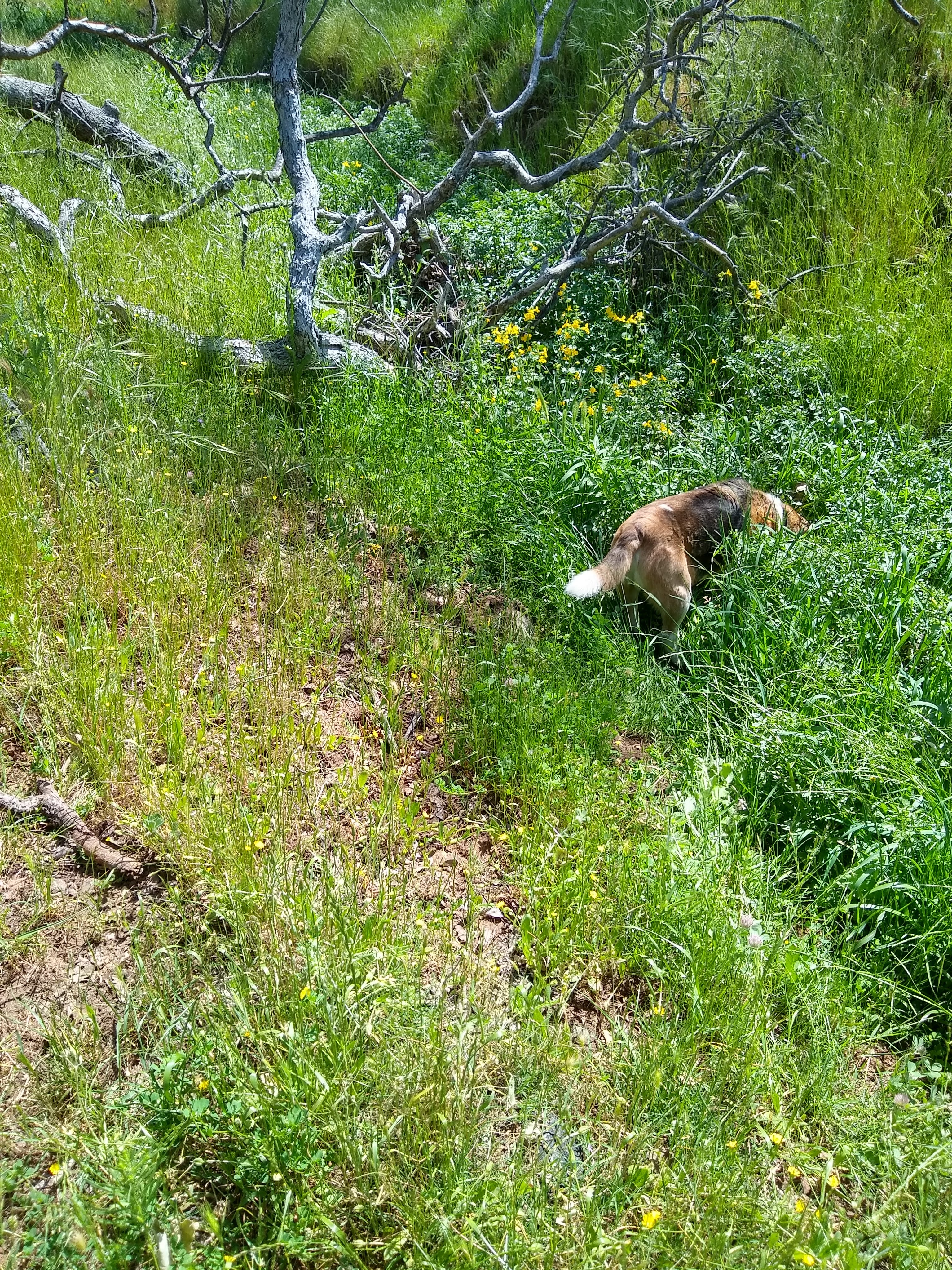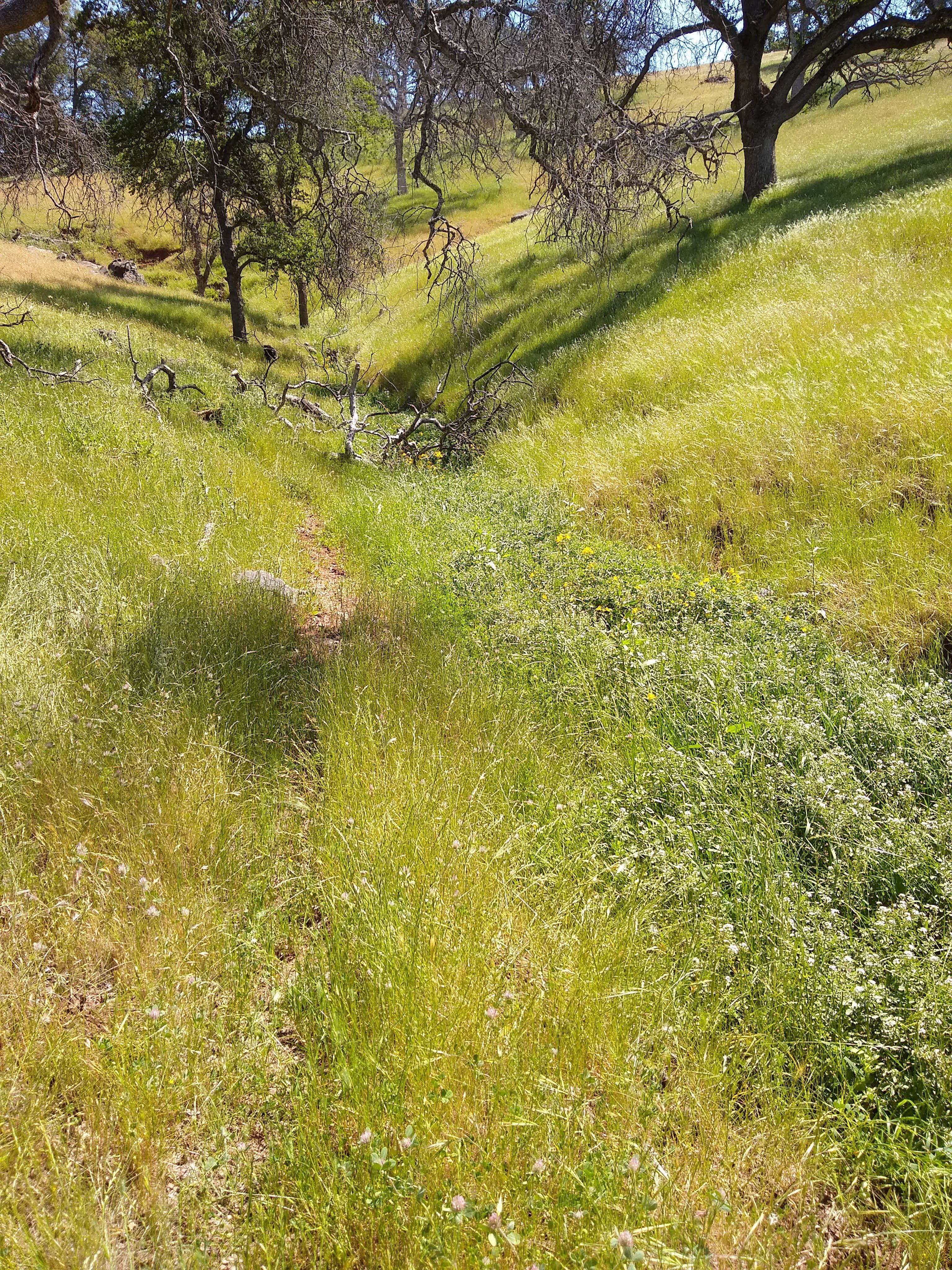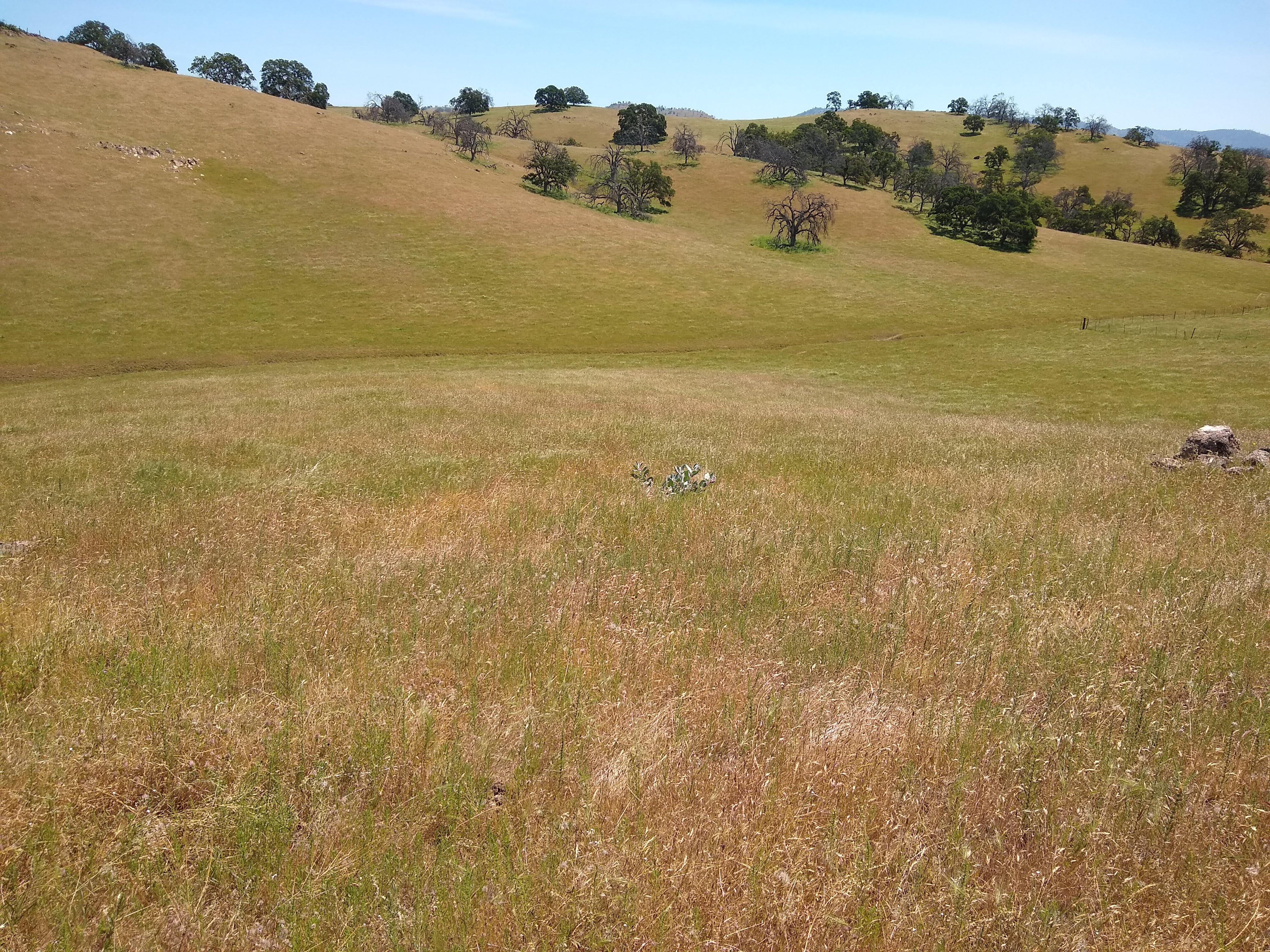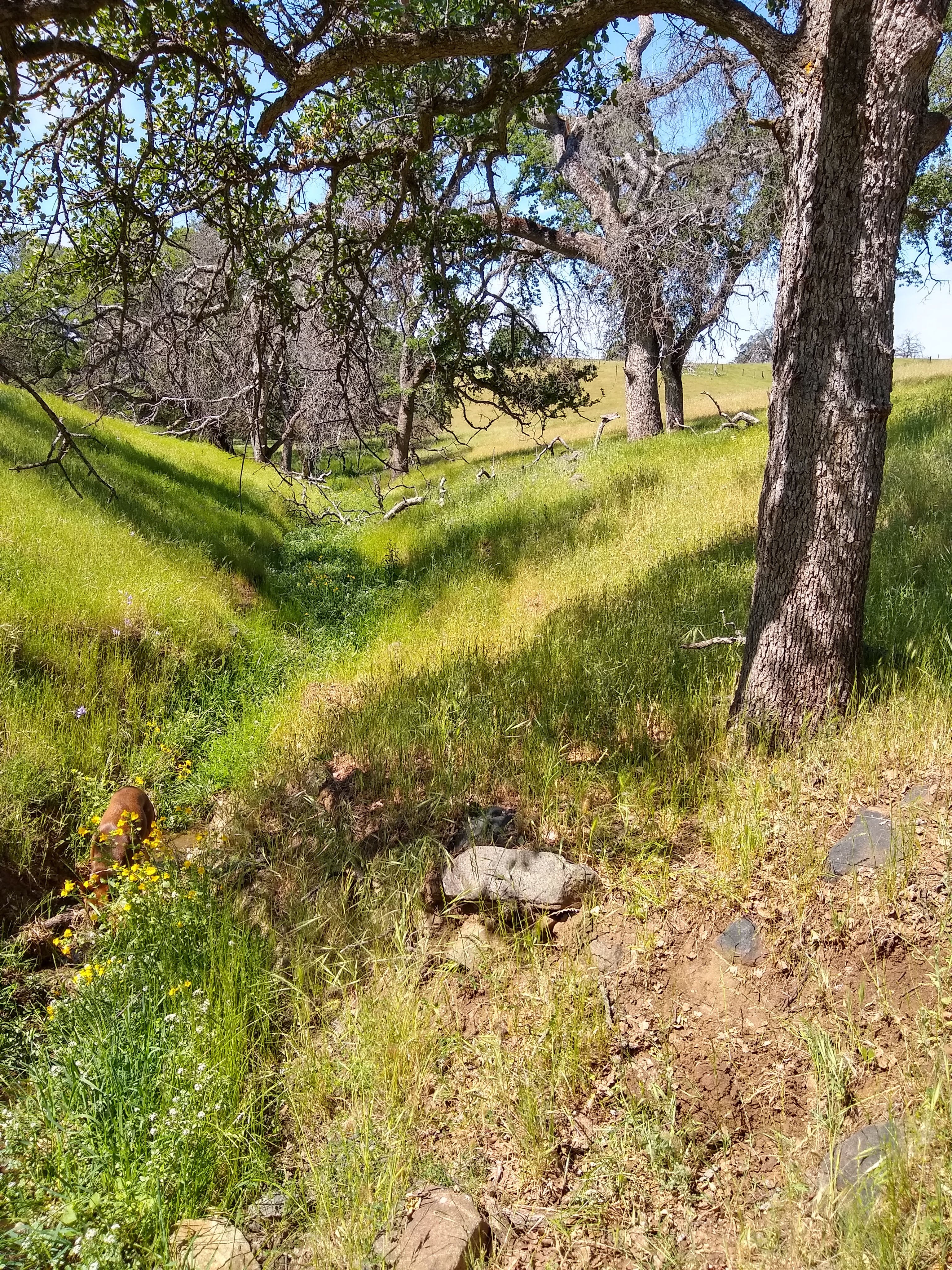 Millie and I set off for the mid part of the ranch. We got distracted by the south facing section of the hill that had a. californica on the west slope. We hiked up about 1000 feet, and did not see any. This put us on a different path than anticipated. We had intended to visit a hill on the east side of Odom Creek. We continued down the east slope of the hill toward our destination. Although we started our adventure at 6:30am when the sky was filled with moist clouds, by 7:30am, the clouds had broken up and the sun was out. The temperature was beginning to get hot. We made it to the base of the hill and decided not to climb it. I did look at the rocky areas for signs of the silvery large leaves, but did not see any. We will need to return and investigate more fully. We also have another hill on the neighbor’s side of the ranch that might be conducive to a. californica tastes. We will explore there too. Millie and I returned home “empty handed” but better for the extraordinarily beautiful, if not rigorous, walk.