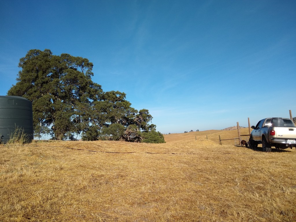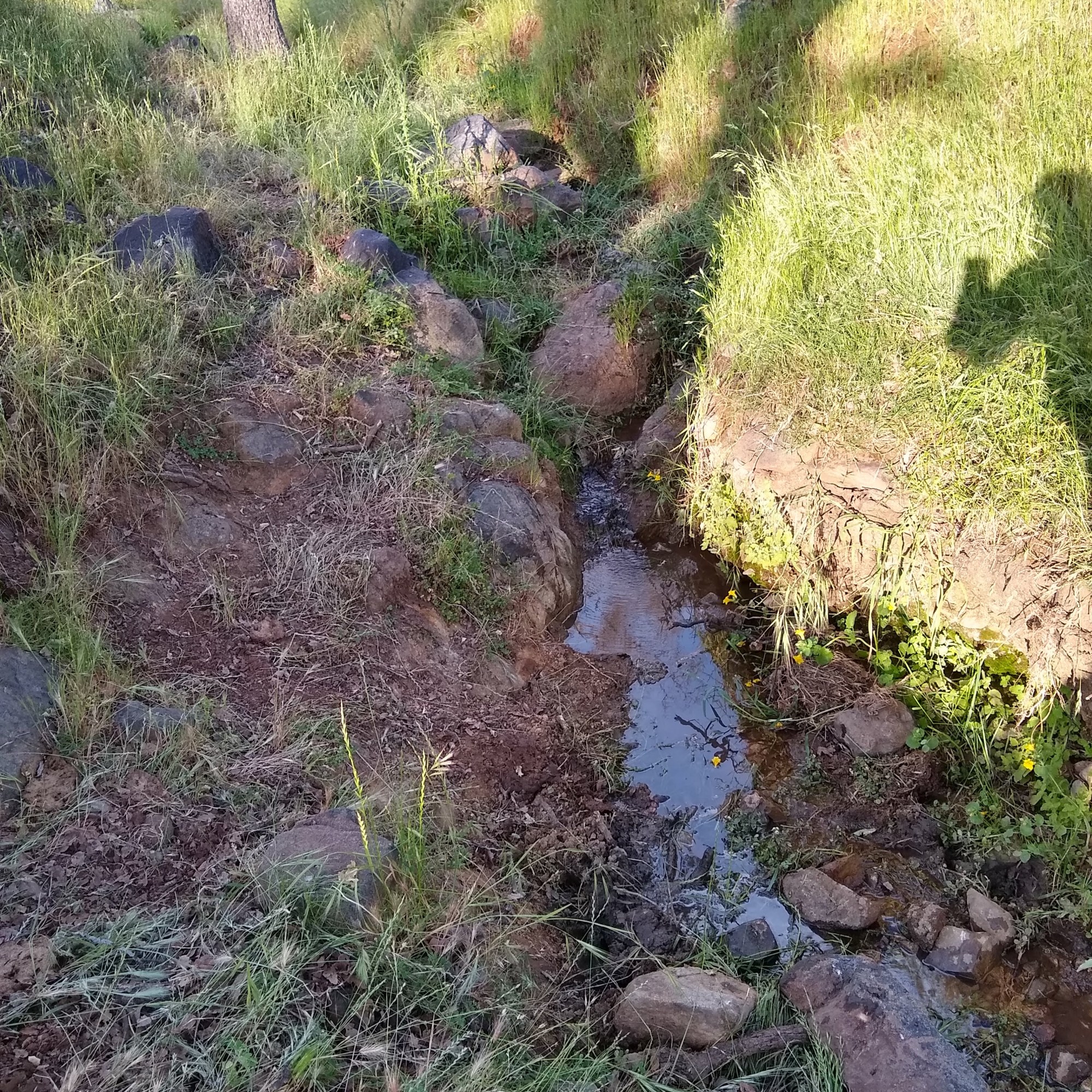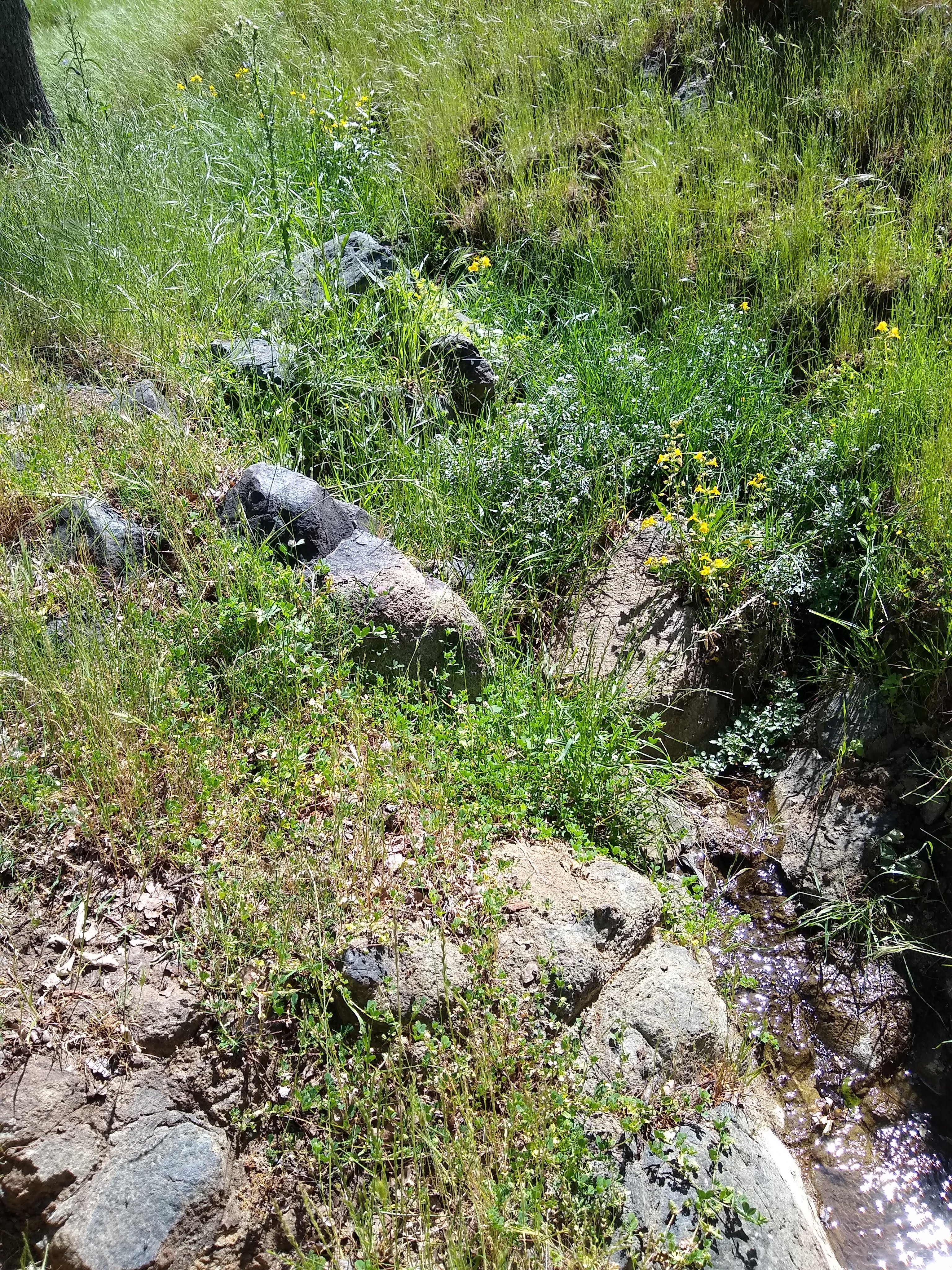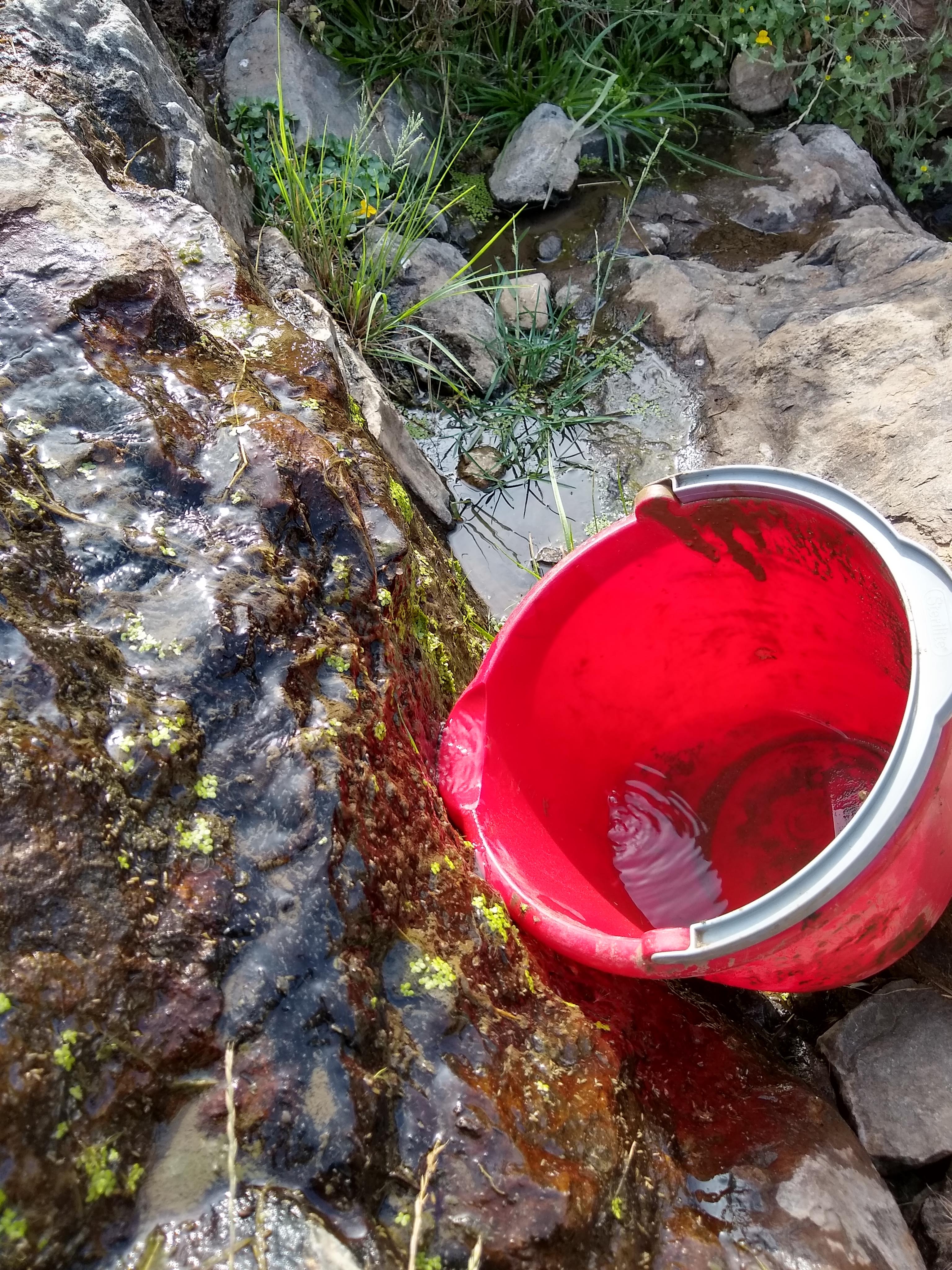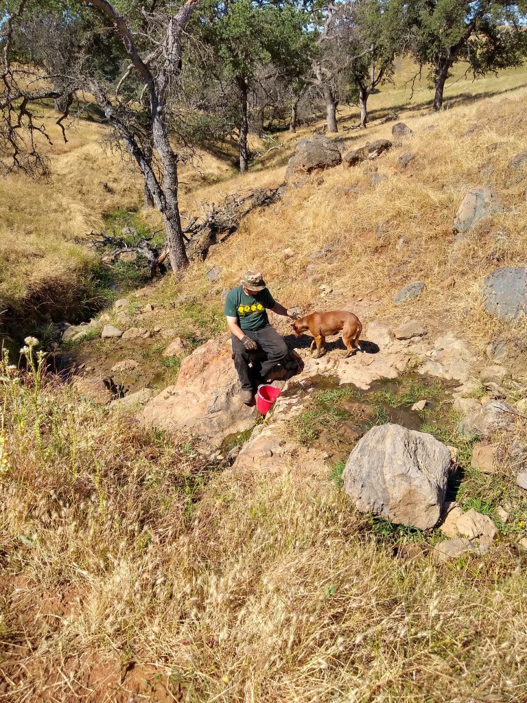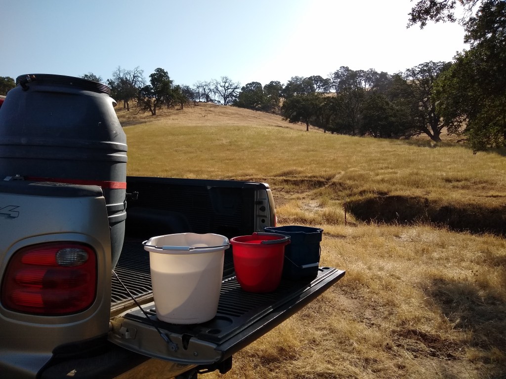Using the truck to transport the water may not be reliable throughout the summer. Here in the Sierras – really anywhere – we need to be mindful of wildfire danger. Any hot piece of a vehicle can ignite dry grass. Timing, wind, and length of grass all need to be considered when driving the truck off road on the ranch. In this instance, we carefully evaluated the height of the grass, height of rocks in the arroyo where we would need to cross and weather. We’ve had very cool nights recently. I prepped the vehicle the day before, and David (my helper and husband) drove with me early in the morning when the air and soil were still cool, and there was no wind, as close as possible to Site 8. I looked closely for any sign of ignition as David drove. We brought an extra bucket for soaking any potential hot spot. We were also mindful of where existing tracks were. You don’t want to compact the soil and damage the grass. Besides, if there is already a track where the ground is adulterated, use it. It is the same concept as in the National and State Parks when signs and rangers tell you to “stay on the trail”. In doing this, we contain the damage to a limited amount of space, which allows all of us, including our plant and animal relations, to live healthfully.