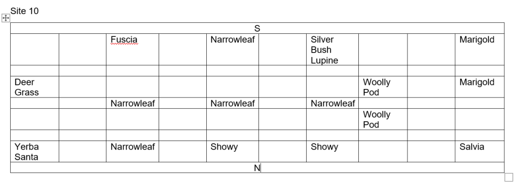 Originally, I planted sites 9 and 10 last year – the North and South plots respectively. Those were the test plots. The Second piece of good news is that I have now found that two milkweed plants returned in the North Plot (10 on the map above). Recall, both plots were decimated by gophers despite being planted in chicken wire baskets. I am hoping others will have survived, but I am not finding any others yet.