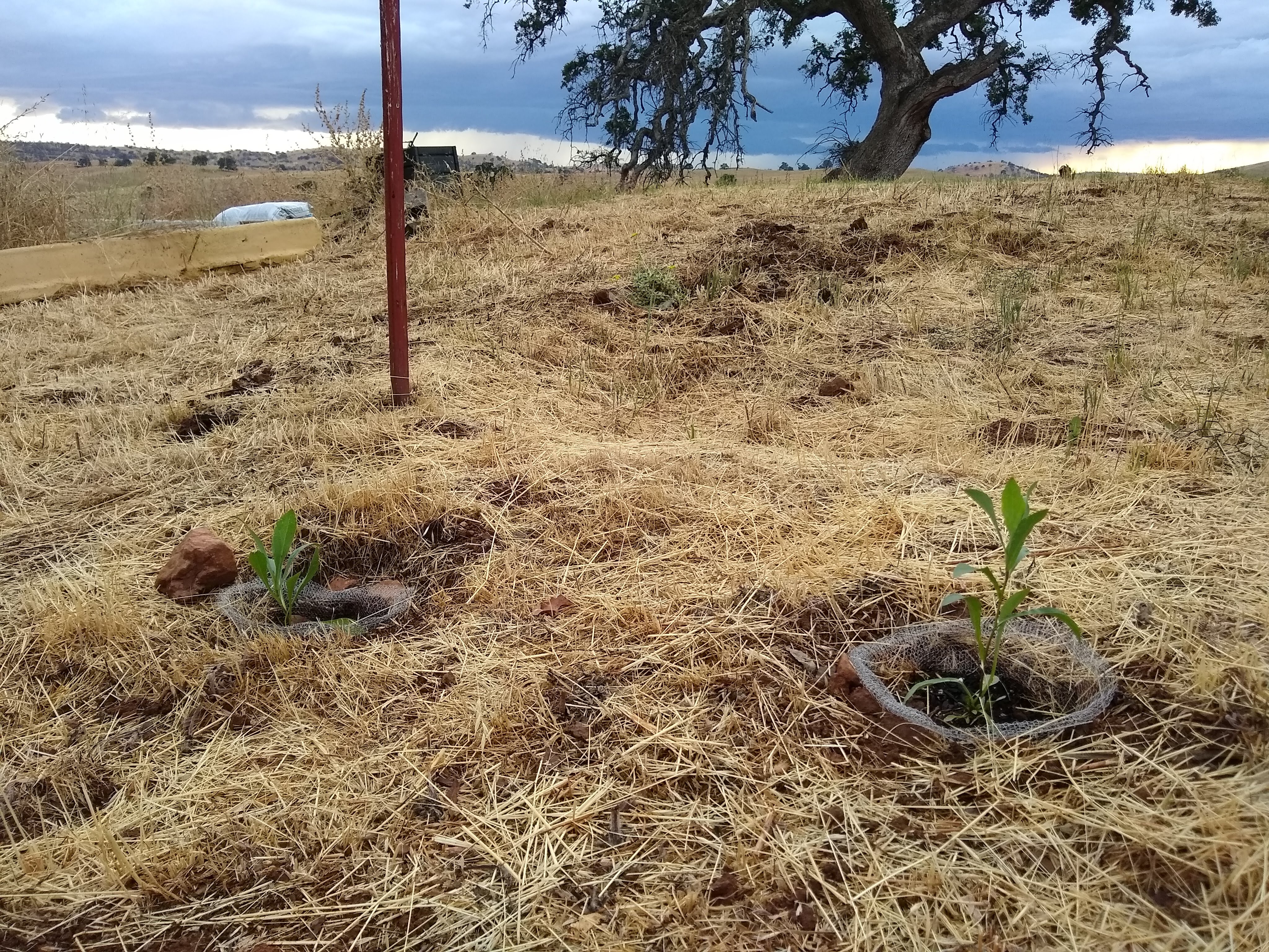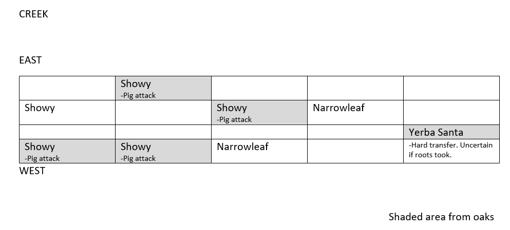 Site #8 is complete with two narrowleafs, five showy milkweeds and one yerba santa