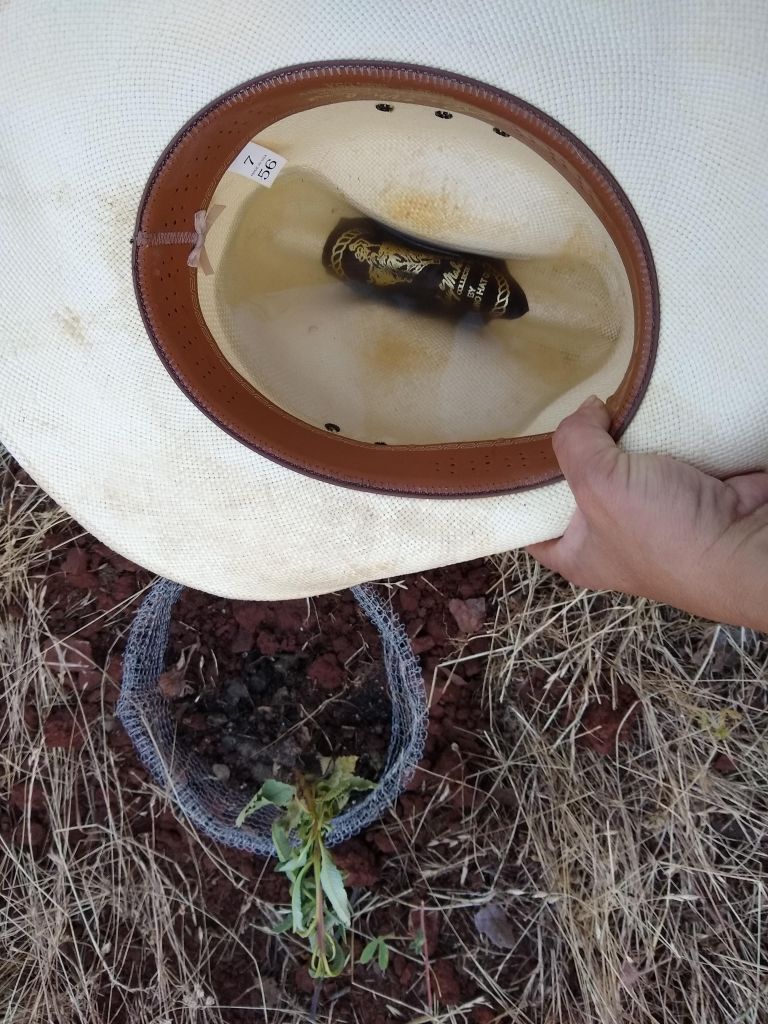 I did not bring a bucket with me for watering. Fortunately, I had my tightly woven work hat on. It was able to hold water that I pulled from the creek. There is a small trickle of water still flowing, and when placed underneath the waterfall, it can fill a vessel without too much silt or debris.