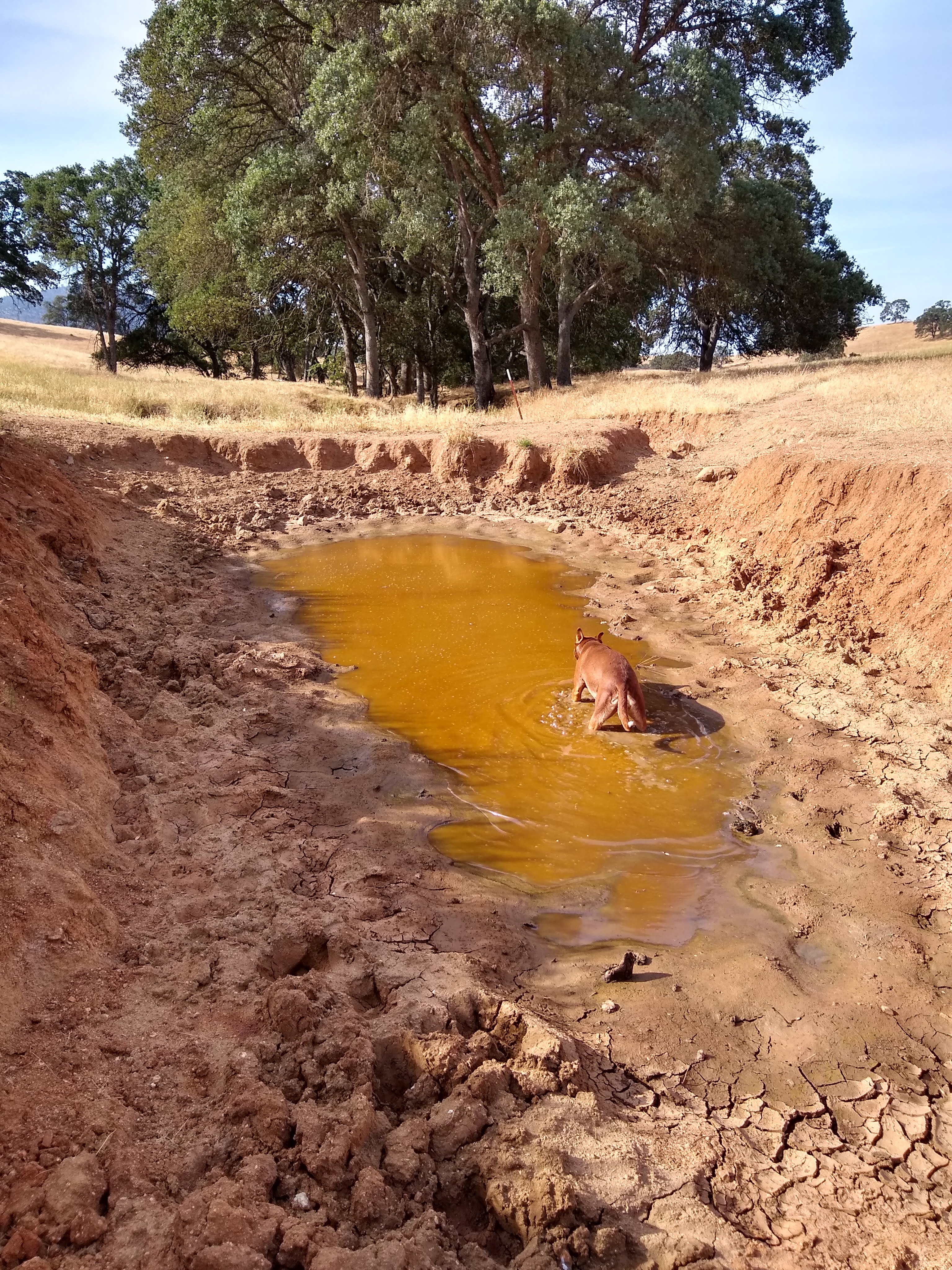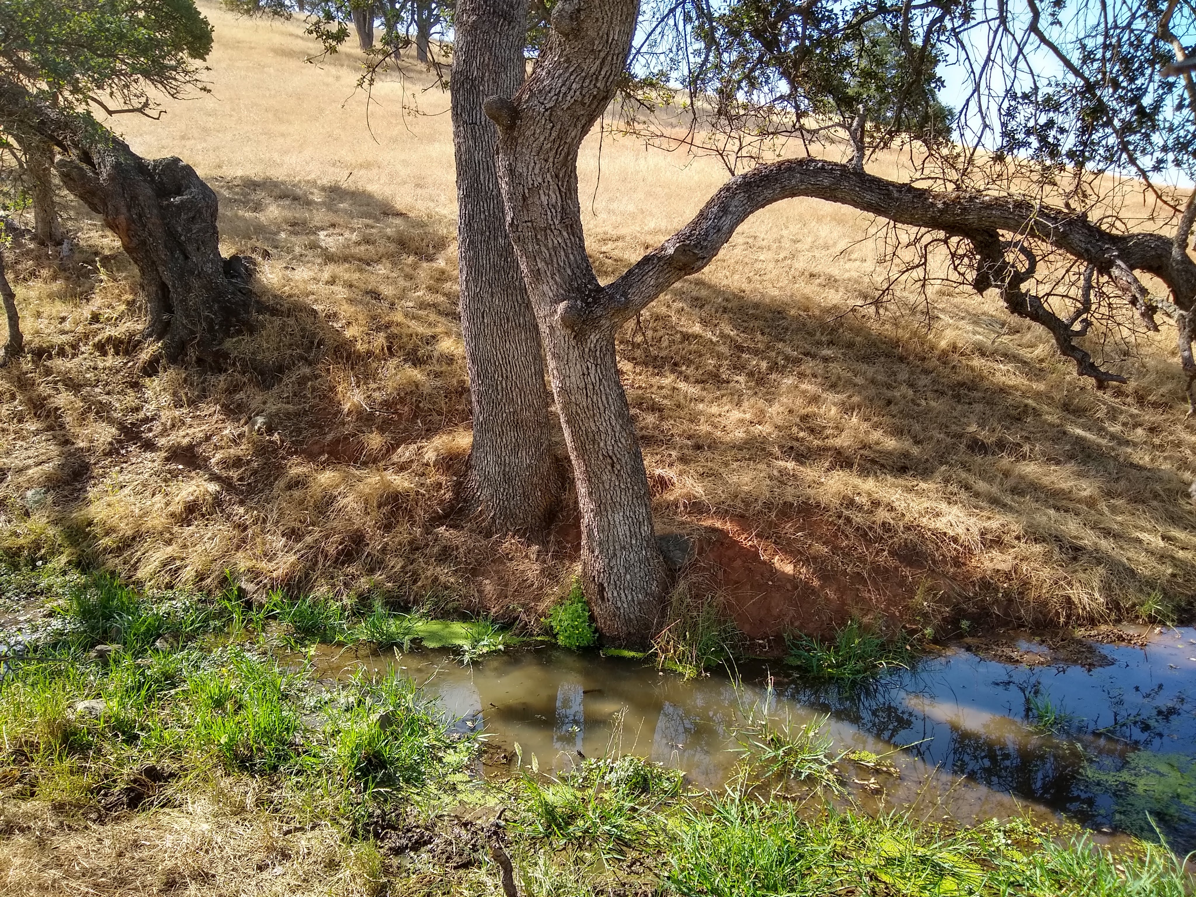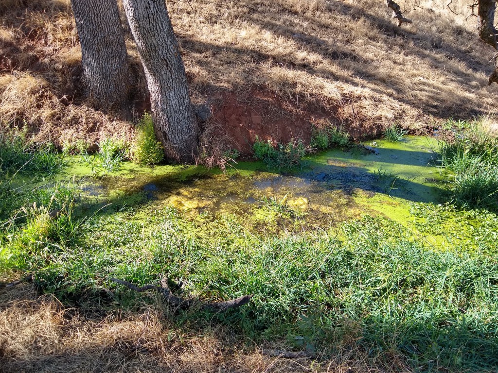 Last week was the final day I pulled water from the spring along the creek. It was running very lightly, and I knew I would need to pivot to Plan B for water sourcing. I have been checking on the plants in Site 8 since the pig attack and was visually monitoring the water flow. The flow has stopped. The small pond has algae on its surface now (see photo below) – a sign of low water movement.