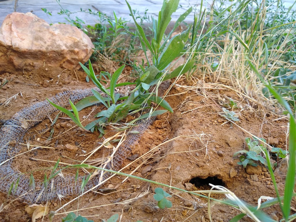 Second, I noted that of the Showy milkweed plants that had been rooted out and tossed away, they ALL were still in tact in their stainless steel baskets. This is another example of their tremendous utility. You could see, however, that their roots had already pushed past the mesh. While this is a great thing, again, showing how effective those baskets are as a tool, it also meant that the roots had been torn out of the ground. As mentioned previously in this blog, milkweeds are very picky plants. They do not seem to transfer well and do not like much disturbance. As quickly as possible, I grabbed each ball of basket, soil and plant, and placed them back into their holes. I clawed at the dirt around each hole to tuck soil around the open areas and then pushed to pack it in tightly. Finally, I gave them a deep watering. I don’t know if they will survive. I will check on them this evening to see how they are doing. Maybe I will allow myself to cry.