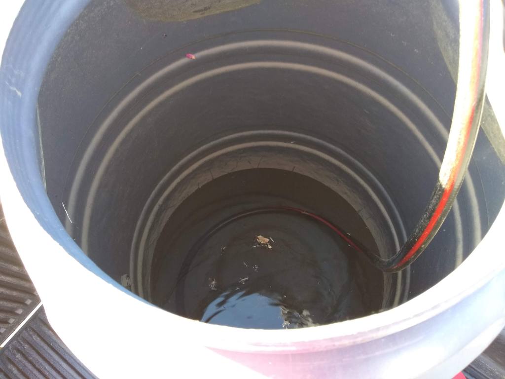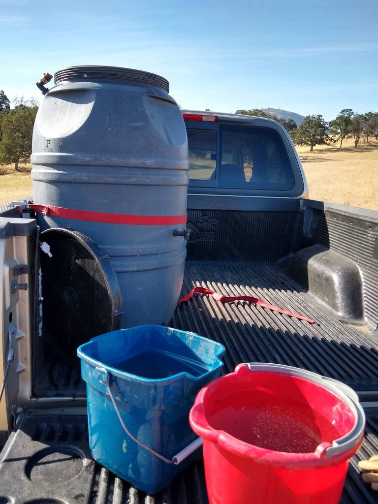Instead of spending money on a potable water bladder for the truck, I decided to use an old rainwater barrel, for now, strapped into the back of the truck to transport the water.
