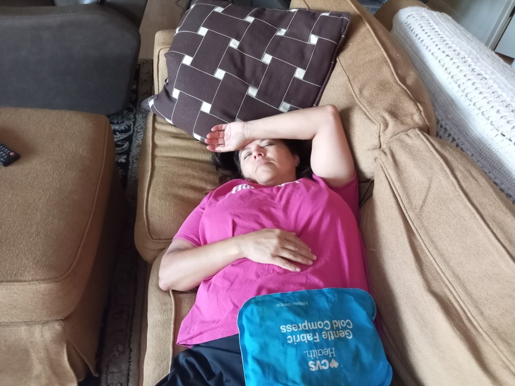Not a flattering photo, but the truth. This work is tough. Icing my abdominal muscle.