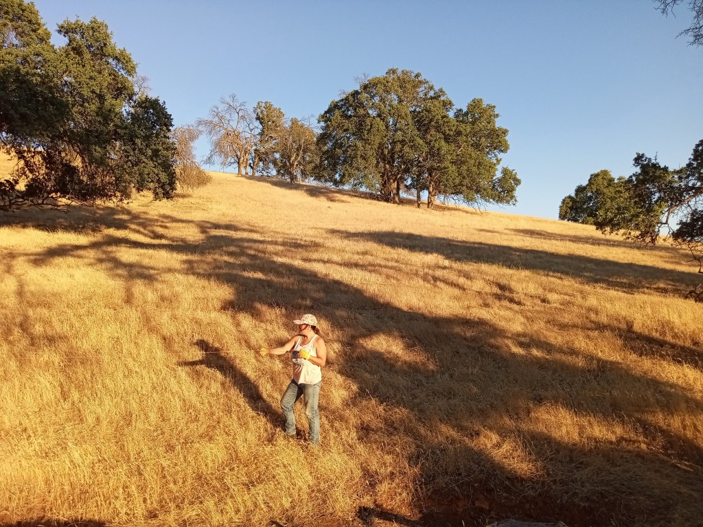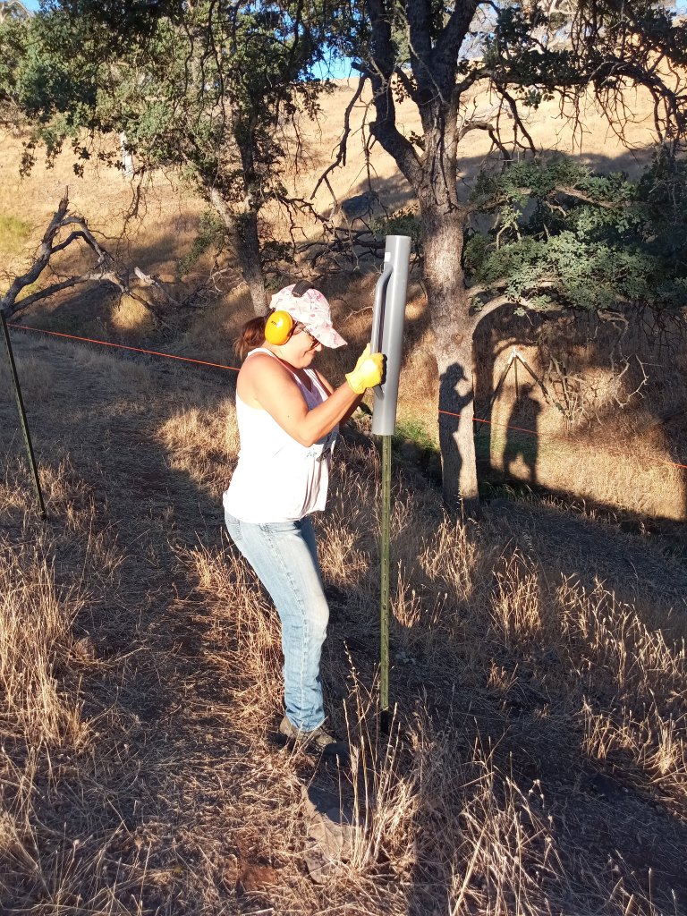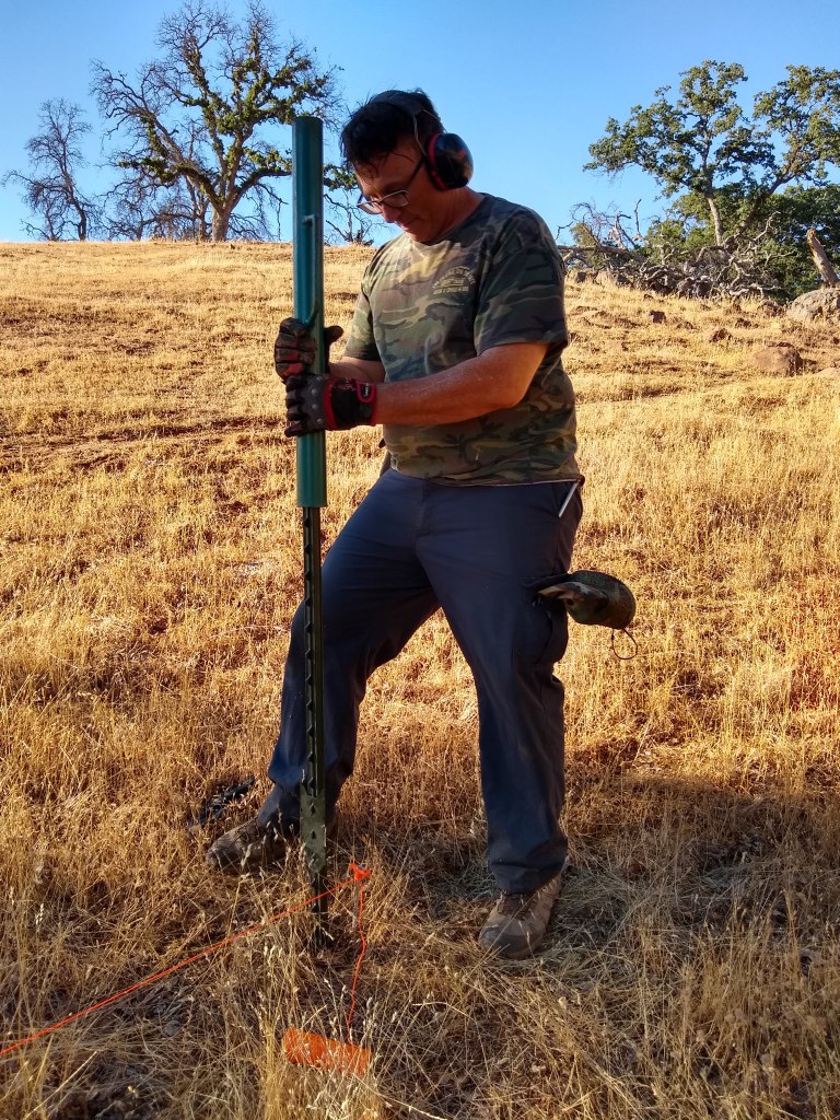 In my last post, I noted that my friend Maggie spotted a little oak seedling while hiking with me on the ranch. We protected it with downed branches to buy me time until I could get to the site and build a cage around it. Three weekends ago I was able to do so. It took much effort however. Since the ground was still wet from a recent storm, I did not want to disturb the soils with my quad by sliding up and down the hillsides. Instead, I loaded the quad with fencing materials and parked in a flat spot well away from the hillside site and hauled all the material to the site. For those that are not aware, t-posts are solid steel. The roll of no-climb fencing is a thick gauge metal. The t-post pounder itself is weighted steel, about 16.5 lbs. As I trudged across the creek, up hill, then across an arroyo to another hill, then up that hill to the oak seedling site several times with pounder, posts and a huge roll of fencing, I had only one thought in mind…”How am I not a size 6!? Why are my arms not as defined as a body builder?” The only explanation is that I love peanut butter too much.