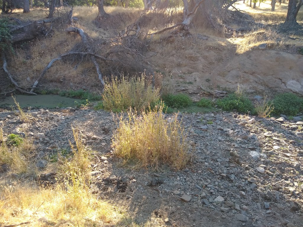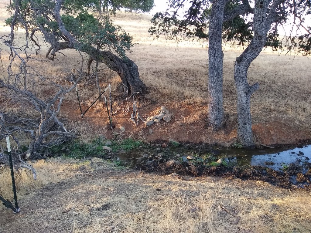 Site 9: This is the area with most of the Xerces riparian kits surrounded by a branch fence. I rebuilt the fence last weekend. The mulefat and two wormwoods are all still alive. The pacific aster was eaten as was the golden current and mulefat during the cow break in. A second golden current looks like it has dried out where I hid it under some brush. There is still water in this area of the creek. There is a chance it will come back. The cottonwood is growing suckers, and most of the oak seedlings are surviving hidden under the brush piles I created months ago.