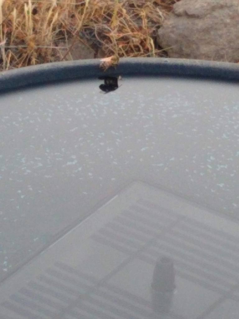 The last of 30 bees leaves the bird bath after drinking.