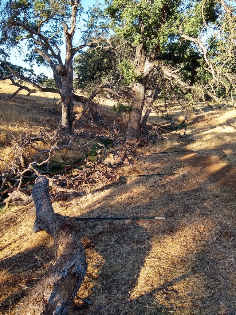 I also put in t-posts around the cottonwood. I needed to do it anyway, and I was going to be nearby. The no-climb fencing still needs to be attached, but I have it ready alongside the driveway to easily pick up when I have the time. At least Maggie’s oak is going to be ok. There are so few young oaks (and so many that died in the last drought), I need to do a better job of protecting the seedlings I find.
