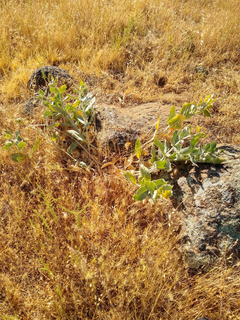 A. Californica sites: It has been a blockbuster year for California milkweed. The two main sites ended up with many more plants. The plant counts in order of closest to the house to furthest: From 7 to 12, From 16 to 21, 1 and 2. They have already set seed pods -except for the youngest ones. They will need to fight the wind, heat and grasshoppers now to complete their cycle. I am grateful for the early bloomers. They have some nice sized pods. Some plants have gopher damage and a few have wind damage. I want as many seeds going into the air and ground as possible.