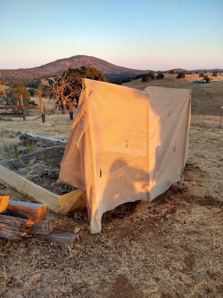 Raised bed is a tough place. Rabbit or gopher still around causing trouble. Three of four milkweeds that were snipped have reemerged. Showy milkweed that was snipped reemerged. All look healthy. Original woolly pod milkweed did not come back. One of two woolly pod transplants is still growing. (Rabbit got the other one). Heartleaf milkweed transplant is still alive but not much growth. Transplanted the two yerba santas and two primrose; all transplants were in gopher shields. Transplanted sunflower starts using gopher shields. Still, rabbit is snipping some of the plants from the top. Sulfur buckwheat and California fuchsia are surviving, but do not look 100%. Installed a t-post windbreak with shade cloth. It is working for now. While installing it, I got hit in the head with the t-post pounder. Fortunately, it was not moving fast. It was all my fault. I walked behind my husband who was pounding in the t-posts. I was cleaning up some broken composter pieces. He turned just at that point, pounder in hand, and my head was at his hand level. Then…well you get the idea. It hurt. 18lbs of steel.