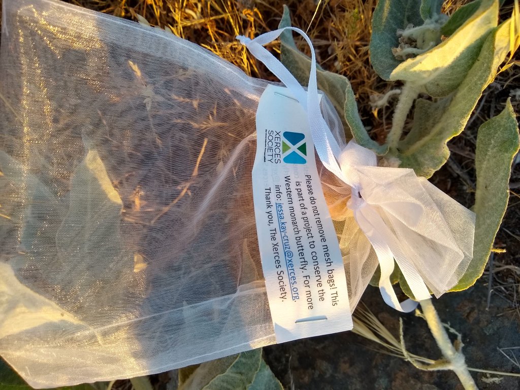 Deedee Soto, the biologist from Xerces, happened to call me the other day asking about the seed pods. Xerces collects them too to help germinate and spread the plants to needed areas. I told her she could have some if they survived the grasshoppers and my early removal of some of the pods. I told her about the infestation, and we discussed what could be done. She came over on a Saturday and installed mesh bags over the seed pods. We know grasshoppers can eat through fabric mesh, but we are gambling that it may slow them down long enough to get just a bit more nutrients before harvesting. Thank you Deedee for being such a committed protector of butterfly habitat! Thank you Xerces Society for everything you do. Your staff, everyone I have worked with, are truly (and I mean it!), truly outstanding.