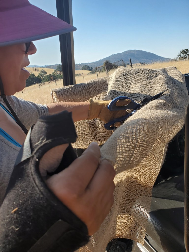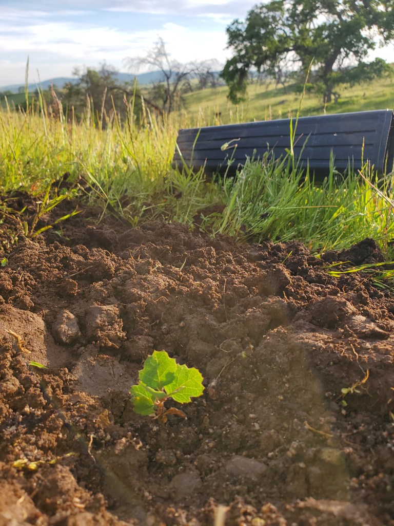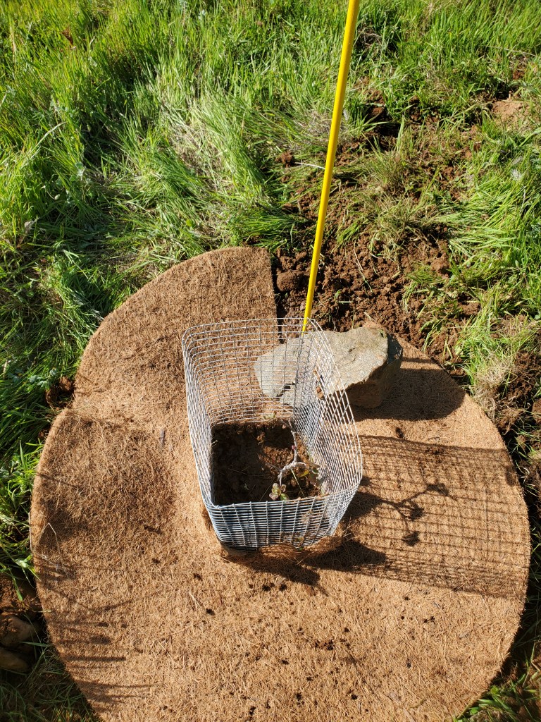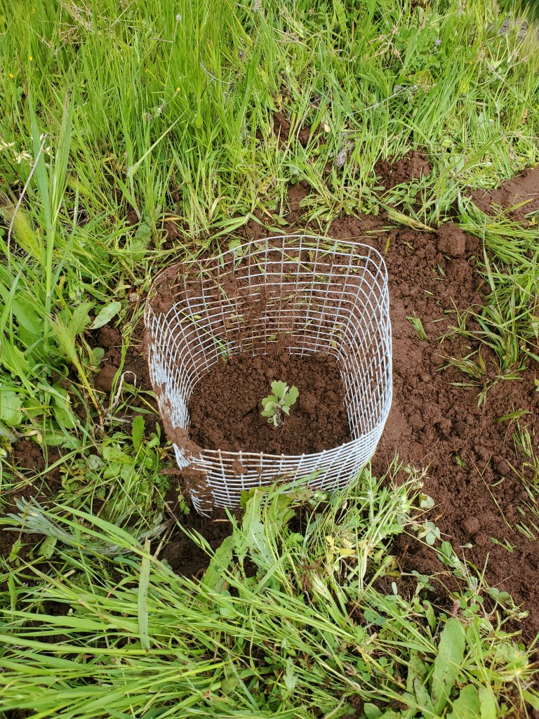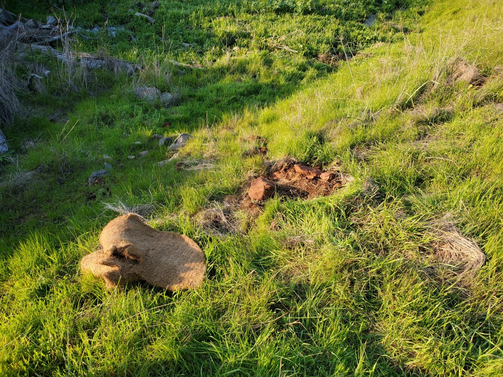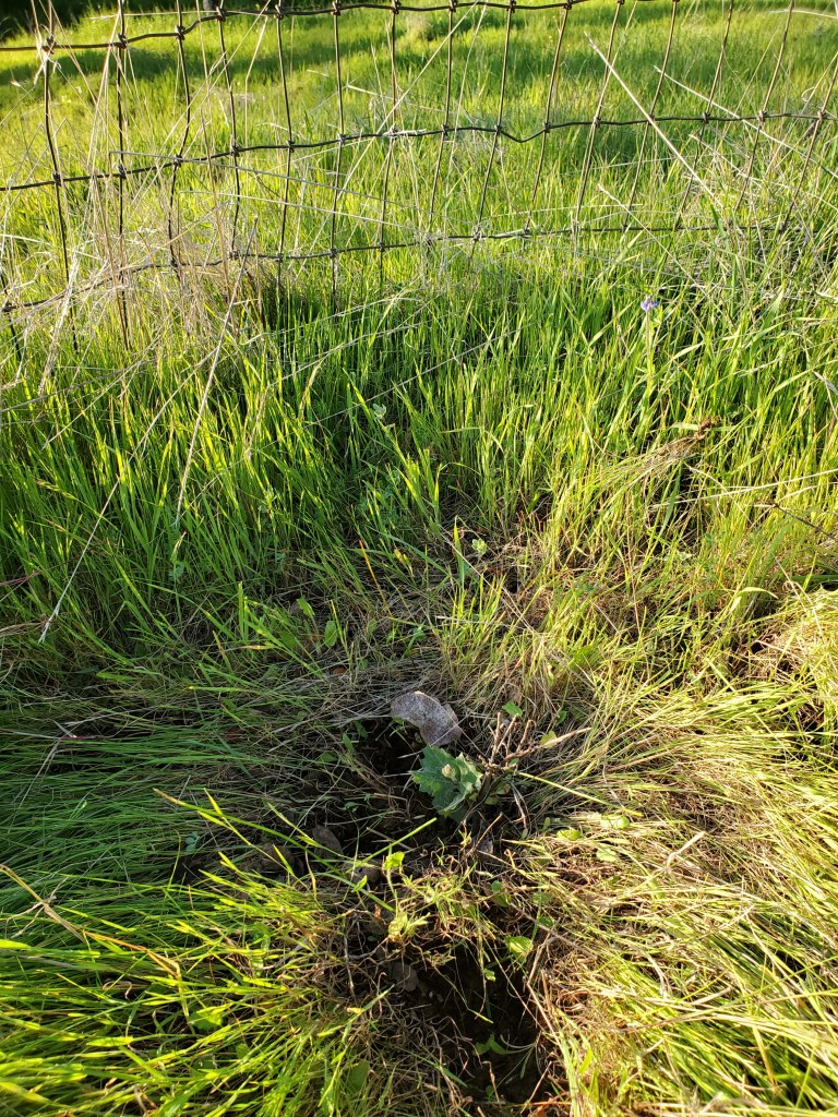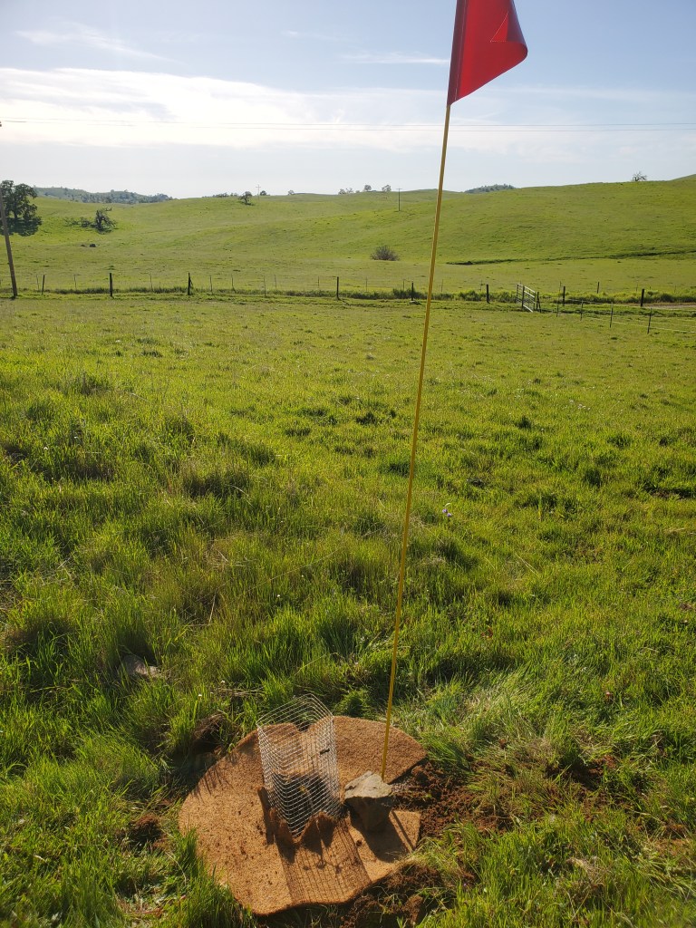With my thumb still busted, wrist, knuckles and ankles still sprained, my job has been copilot, holding the water bucket with my good hand, carefully walking over to the tree, watering and removing the burlap and coir pad. David was doing everything else. As we went to each tree, I held my breath as I lifted the burlap shade cover, hoping I would see the healthy seedlings I had watered just 6 days prior. The two upstream on the Spring Creek…they looked great. I breathed out. The one by the lower pastures planted into the old dead oak, I lifted the cover, mostly eaten. There was one green leaf left. I’ll take it. Watered and screened. The discovery was unsettling. I became nervous for the others.