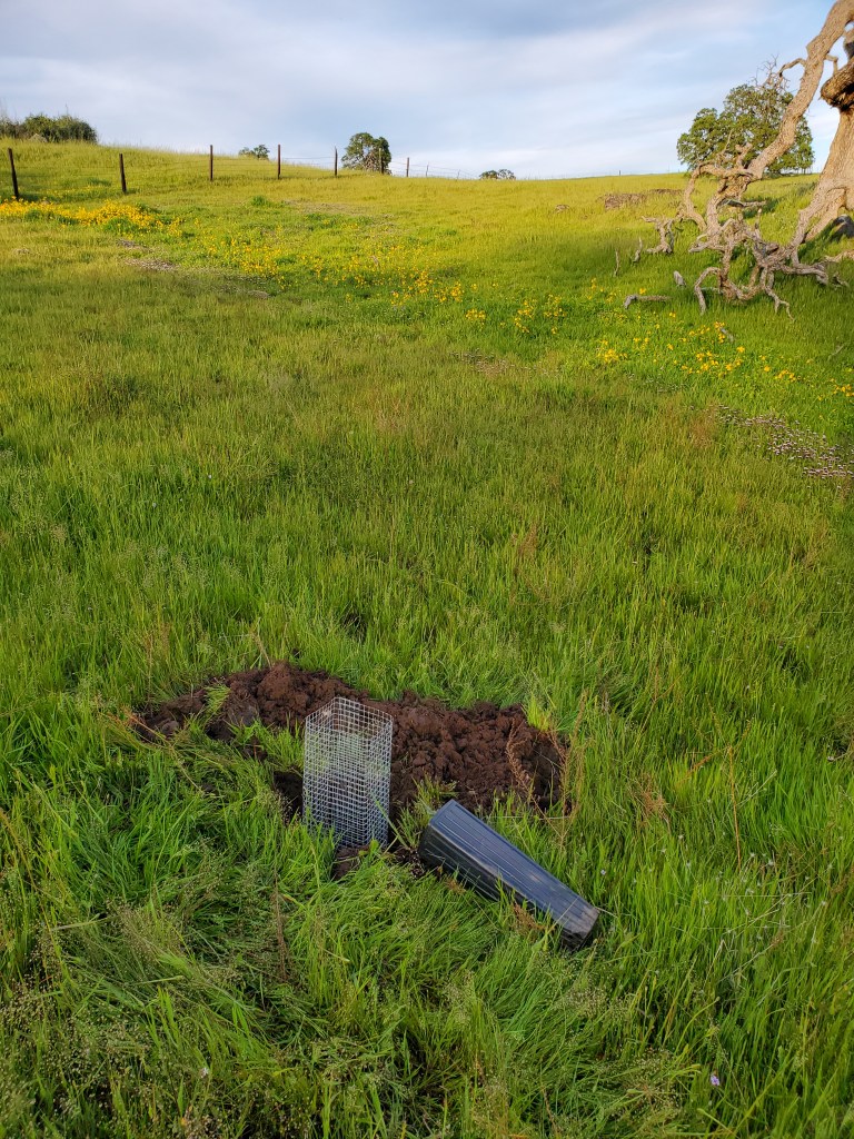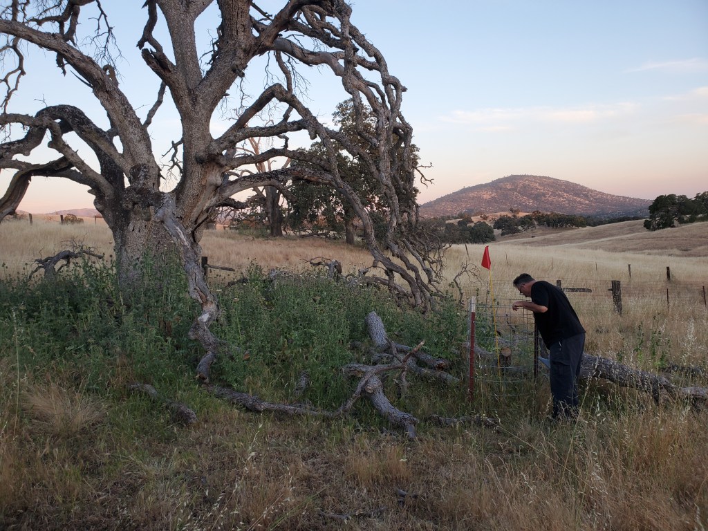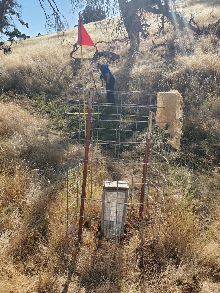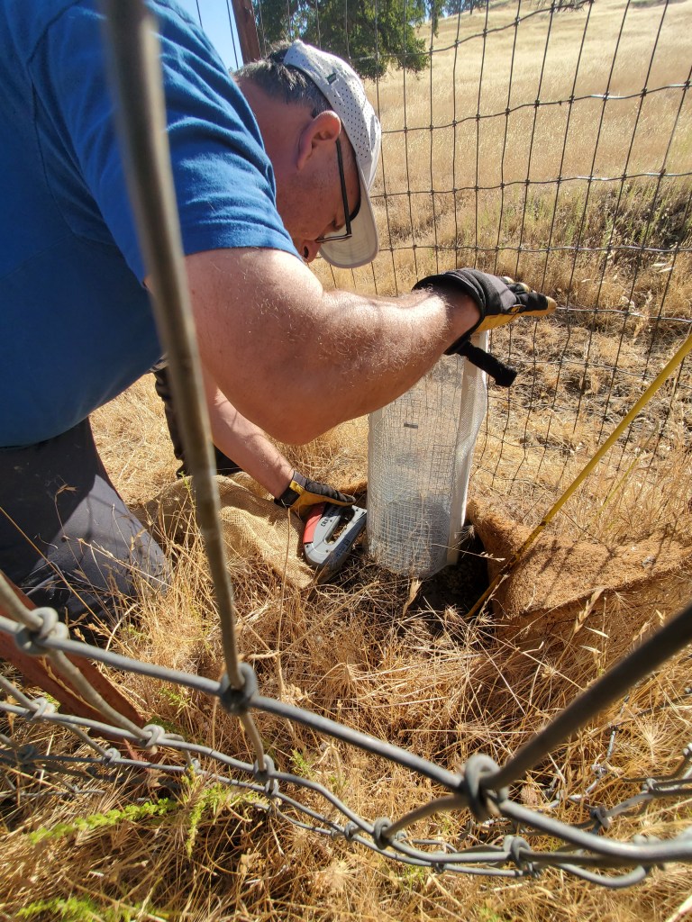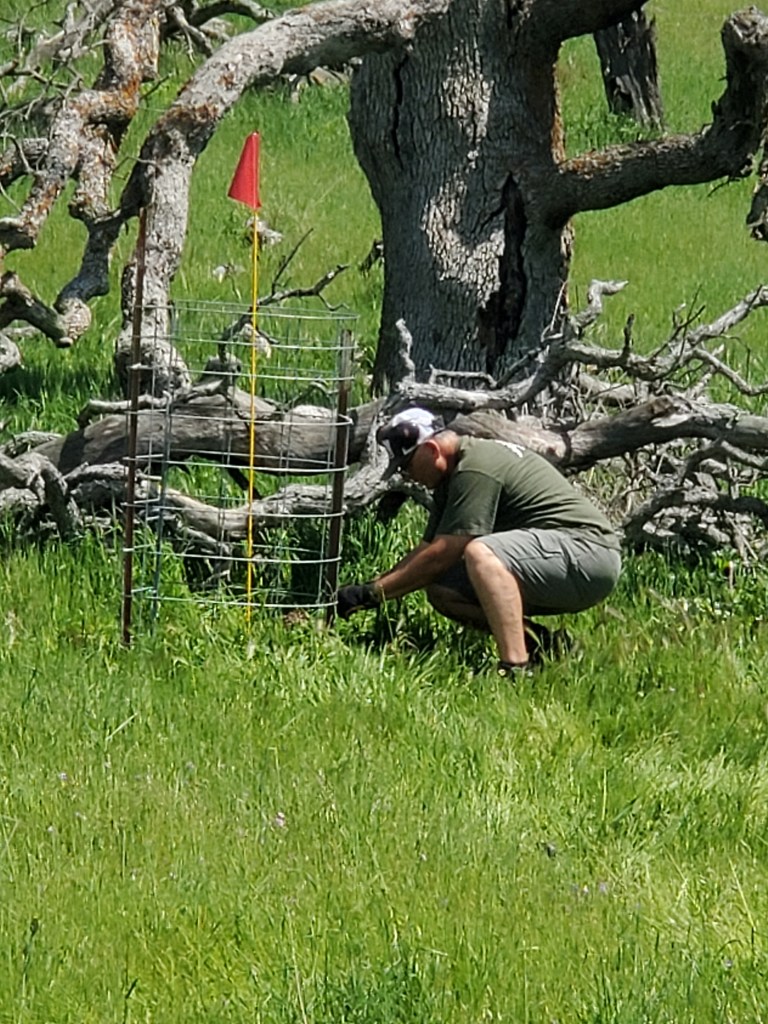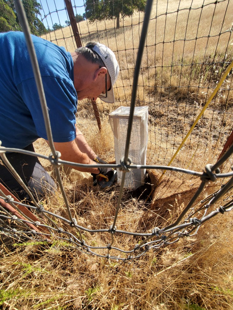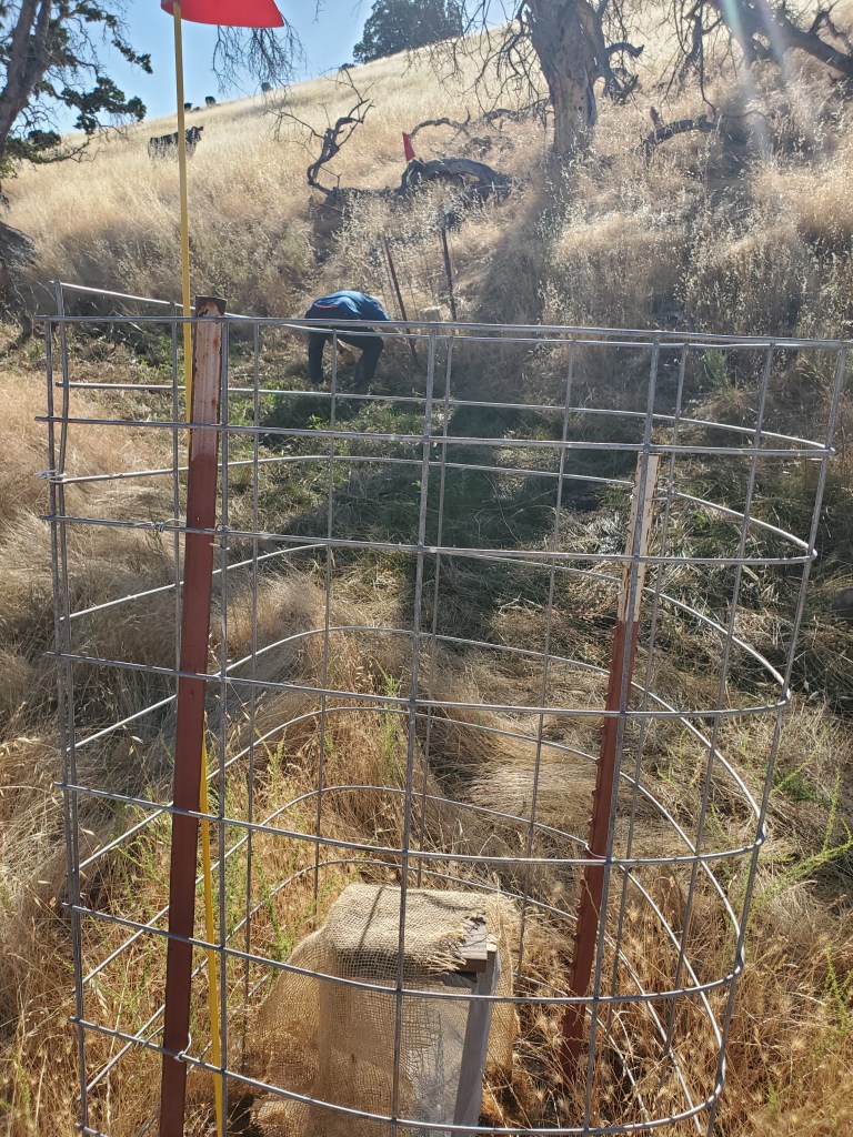 To do this takes time. The trees by the house got their boxes first. Then more needed to be built. Sam worked on the boxes while David and I placed what had been built. David could only work with me in short bursts because of his work schedule. It is laborious and very hand-oriented. You need to load water for the trees, load the boxes, the hammer, buckets and other tools to open cages or fix things. Then, you need to drive the polaris to the locations — no power steering. Next, you unload what you need, pull the huge, heavy tub with water toward the tailgate, unscrew the cap, hold onto the cap despite the pressure of the water in the large container, hold the watering can with the other hand or place on the ground, close the cap just right to prevent leakage (since you must have enough water for all the trees on your route.), haul the water, remove the shade burlap from the gopher cage, and water the tree. You need to pull up the coir pad so the screen box stakes can hit the dirt. Then, you go back to the cart, grab the screen box, lift it over the side of the cage. You need to alternate your hands through the openings in the cage, grabbing the screen box with one hand while placing your next hand through the next level of holes to grab the box, gently lowering it down over the oak in its gopher cage. This takes time. It is a gentle operation because you don’t want to risk dropping the screen box in the cage out of reach or breaking a branch on the seedling. Next, you carefully fit the screen over the gopher cage. They are designed to just fit. You don’t want to be too strong with it or the screen may pull off the staples or wood crack. You pull it over the gopher cage like a condom, then take your hammer and pound the wood stakes into the moist ground with the hammer. You then squish dirt up against the screen so there is no entry point for the hoppers. You place the coir pad back around the blended unit, grab the discarded hammer, walk back to the polaris and do it all again. Ideally, you don’t want to have to open the cage. That takes much more time – so you have to be careful.