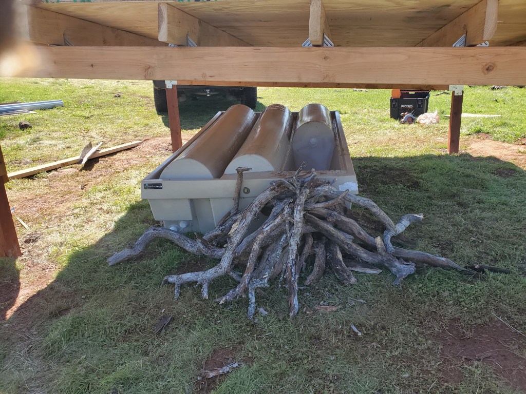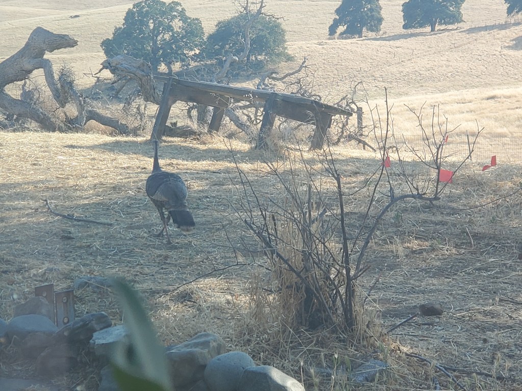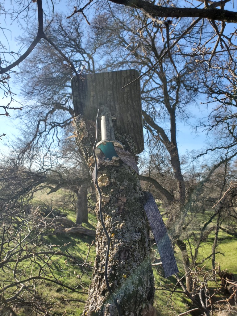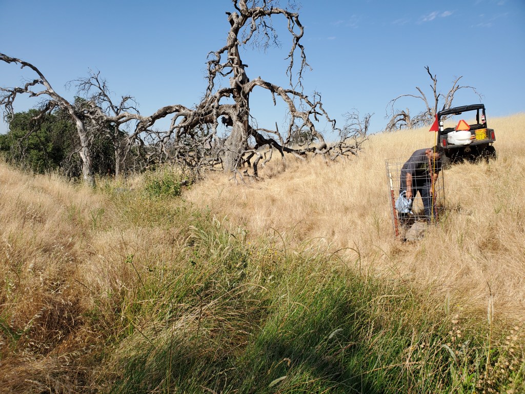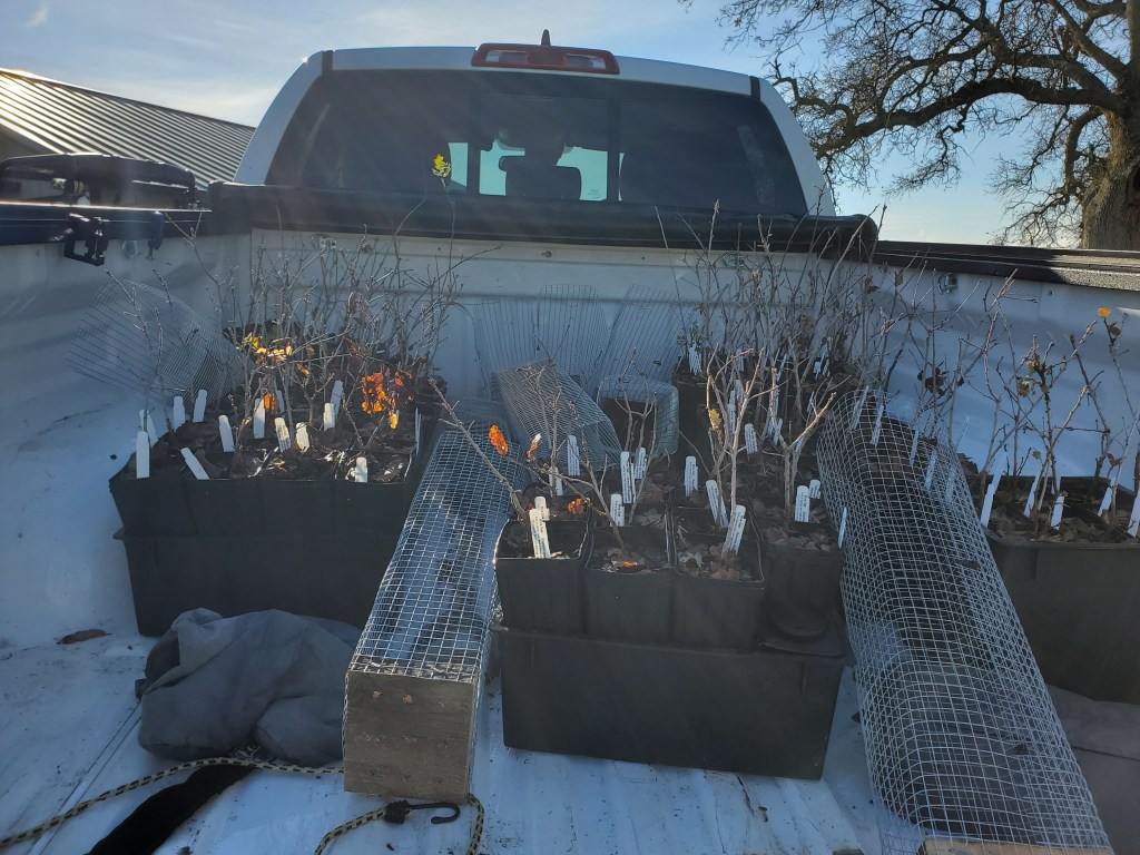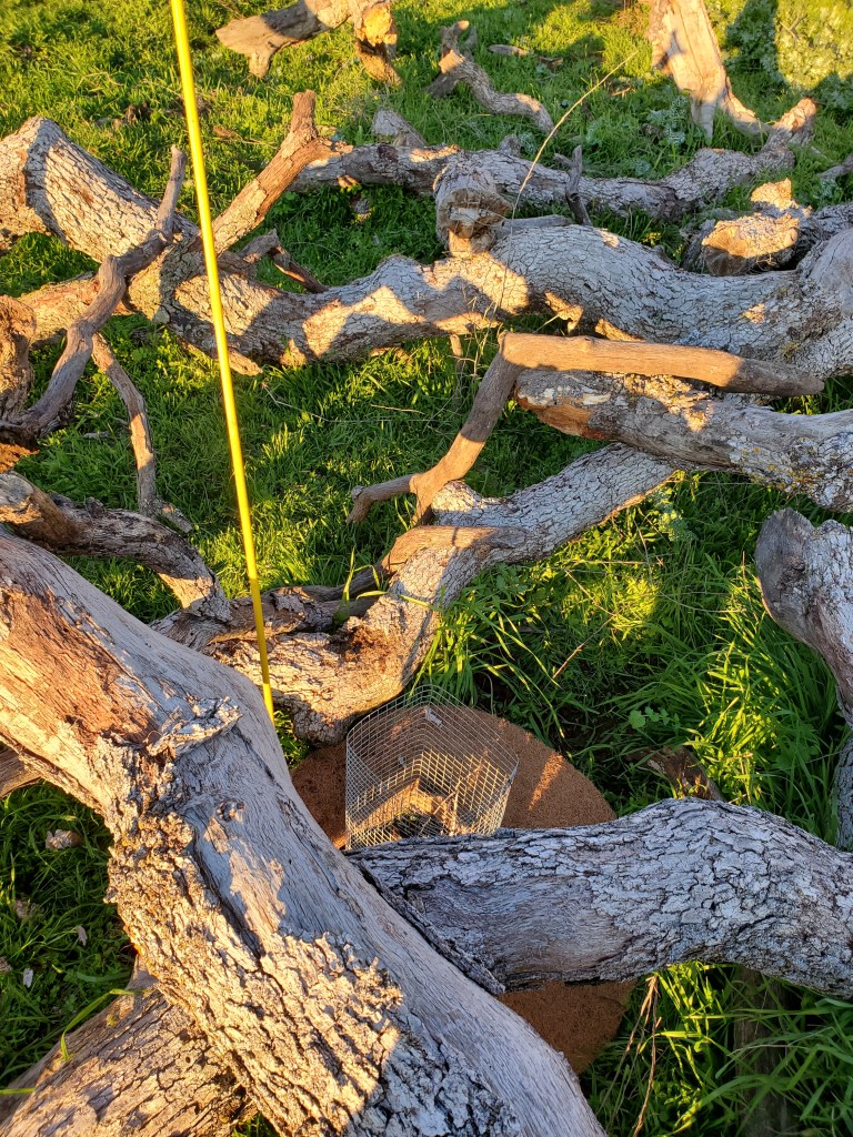 To do this takes time. The trees by the house got their boxes first. Then more needed to be built. Sam worked on the boxes while David and I placed what had been built. David could only work with me in short bursts because of his work schedule. It is laborious and very hand-oriented. You need to load water for the trees, load the boxes, the hammer, buckets and other tools to open cages or fix things. Then, you need to drive the polaris to the locations — no power steering. Next, you unload what you need, pull the huge, heavy tub with water toward the tailgate, unscrew the cap, hold onto the cap despite the pressure of the water in the large container, hold the watering can with the other hand or place on the ground, close the cap just right to prevent leakage (since you must have enough water for all the trees on your route.), haul the water, remove the shade burlap from the gopher cage, and water the tree. You need to pull up the coir pad so the screen box stakes can hit the dirt. Then, you go back to the cart, grab the screen box, lift it over the side of the cage. You need to alternate your hands through the openings in the cage, grabbing the screen box with one hand while placing your next hand through the next level of holes to grab the box, gently lowering it down over the oak in its gopher cage. This takes time. It is a gentle operation because you don’t want to risk dropping the screen box in the cage out of reach or breaking a branch on the seedling. Next, you carefully fit the screen over the gopher cage. They are designed to just fit. You don’t want to be too strong with it or the screen may pull off the staples or wood crack. You pull it over the gopher cage like a condom, then take your hammer and pound the wood stakes into the moist ground with the hammer. You then squish dirt up against the screen so there is no entry point for the hoppers. You place the coir pad back around the blended unit, grab the discarded hammer, walk back to the polaris and do it all again. Ideally, you don’t want to have to open the cage. That takes much more time – so you have to be careful.