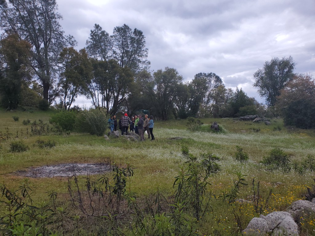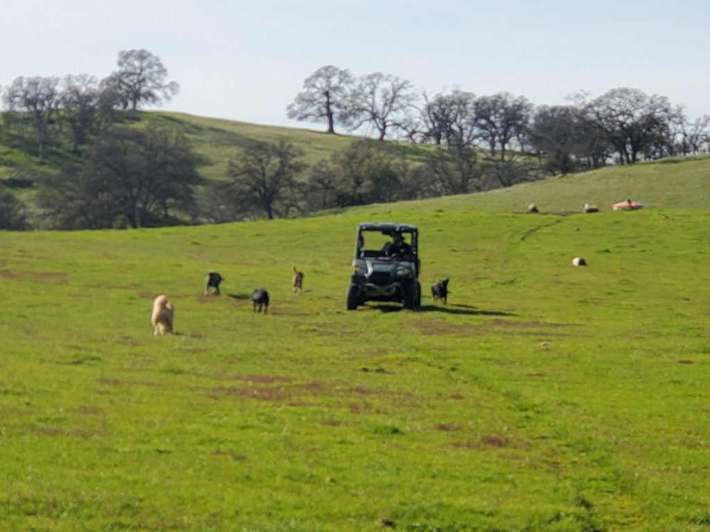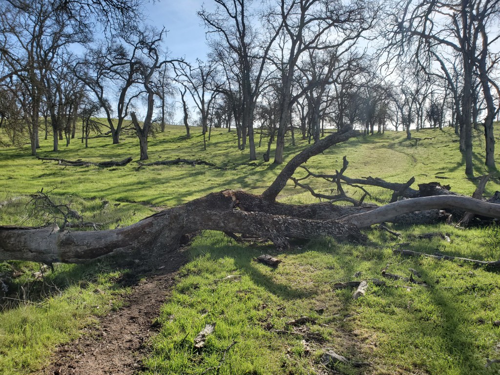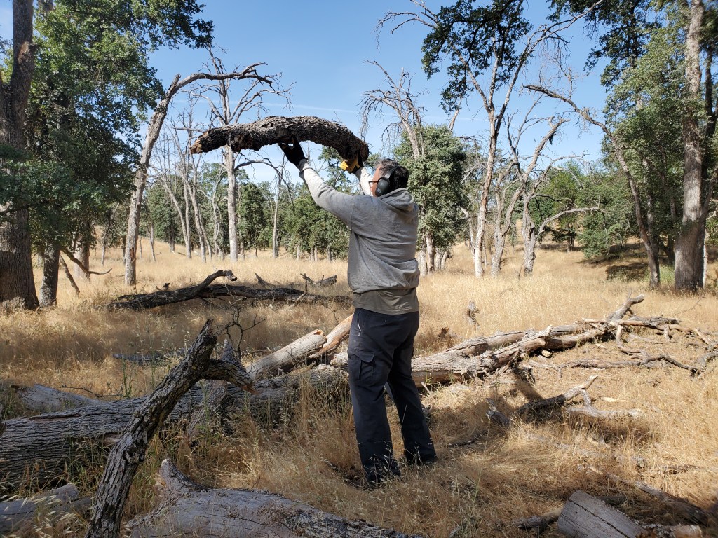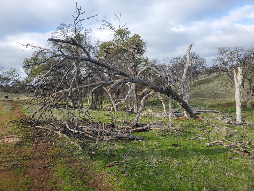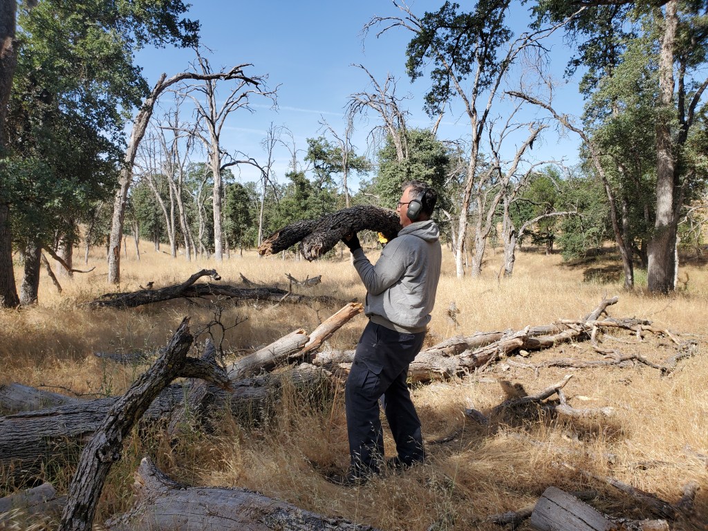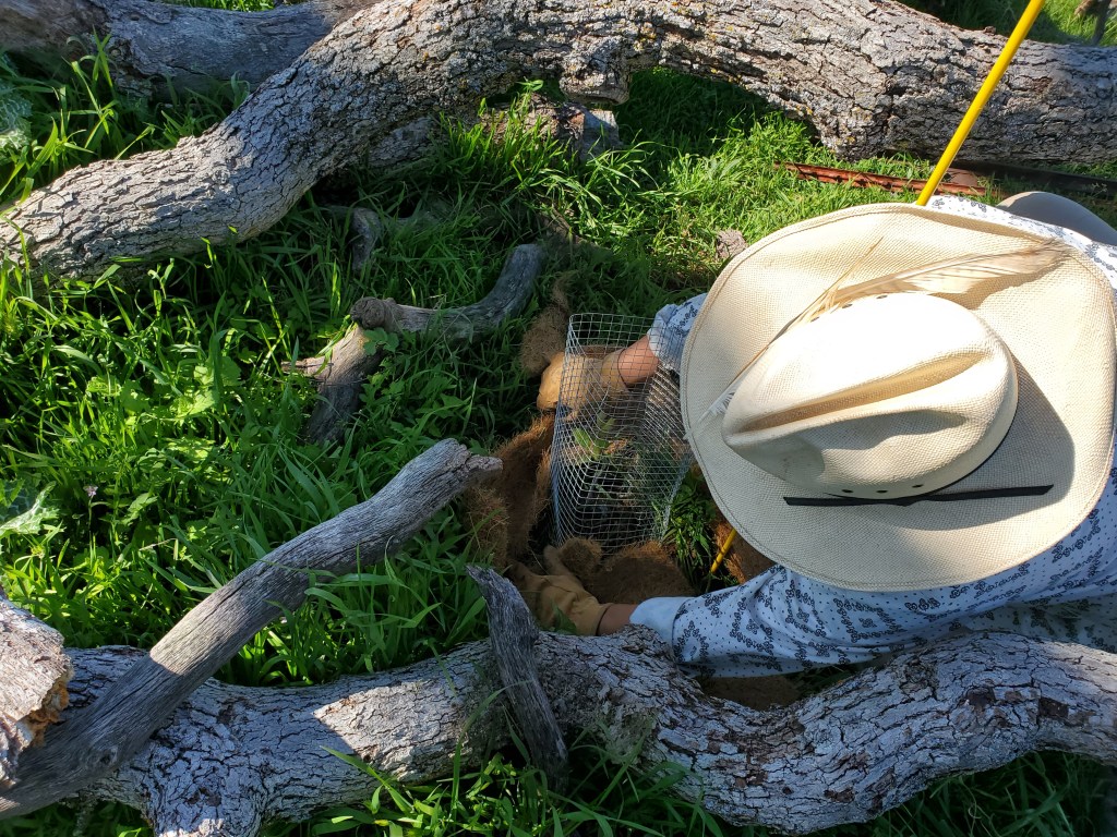 To do this takes time. The trees by the house got their boxes first. Then more needed to be built. Sam worked on the boxes while David and I placed what had been built. David could only work with me in short bursts because of his work schedule. It is laborious and very hand-oriented. You need to load water for the trees, load the boxes, the hammer, buckets and other tools to open cages or fix things. Then, you need to drive the polaris to the locations — no power steering. Next, you unload what you need, pull the huge, heavy tub with water toward the tailgate, unscrew the cap, hold onto the cap despite the pressure of the water in the large container, hold the watering can with the other hand or place on the ground, close the cap just right to prevent leakage (since you must have enough water for all the trees on your route.), haul the water, remove the shade burlap from the gopher cage, and water the tree. You need to pull up the coir pad so the screen box stakes can hit the dirt. Then, you go back to the cart, grab the screen box, lift it over the side of the cage. You need to alternate your hands through the openings in the cage, grabbing the screen box with one hand while placing your next hand through the next level of holes to grab the box, gently lowering it down over the oak in its gopher cage. This takes time. It is a gentle operation because you don’t want to risk dropping the screen box in the cage out of reach or breaking a branch on the seedling. Next, you carefully fit the screen over the gopher cage. They are designed to just fit. You don’t want to be too strong with it or the screen may pull off the staples or wood crack. You pull it over the gopher cage like a condom, then take your hammer and pound the wood stakes into the moist ground with the hammer. You then squish dirt up against the screen so there is no entry point for the hoppers. You place the coir pad back around the blended unit, grab the discarded hammer, walk back to the polaris and do it all again. Ideally, you don’t want to have to open the cage. That takes much more time – so you have to be careful.