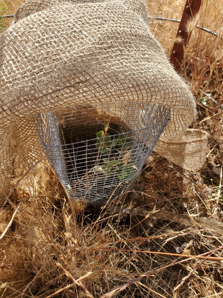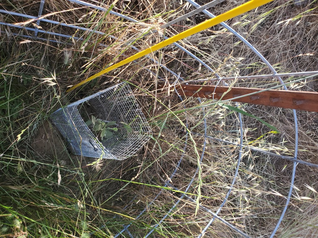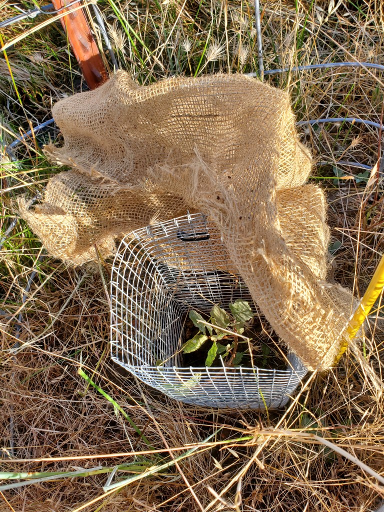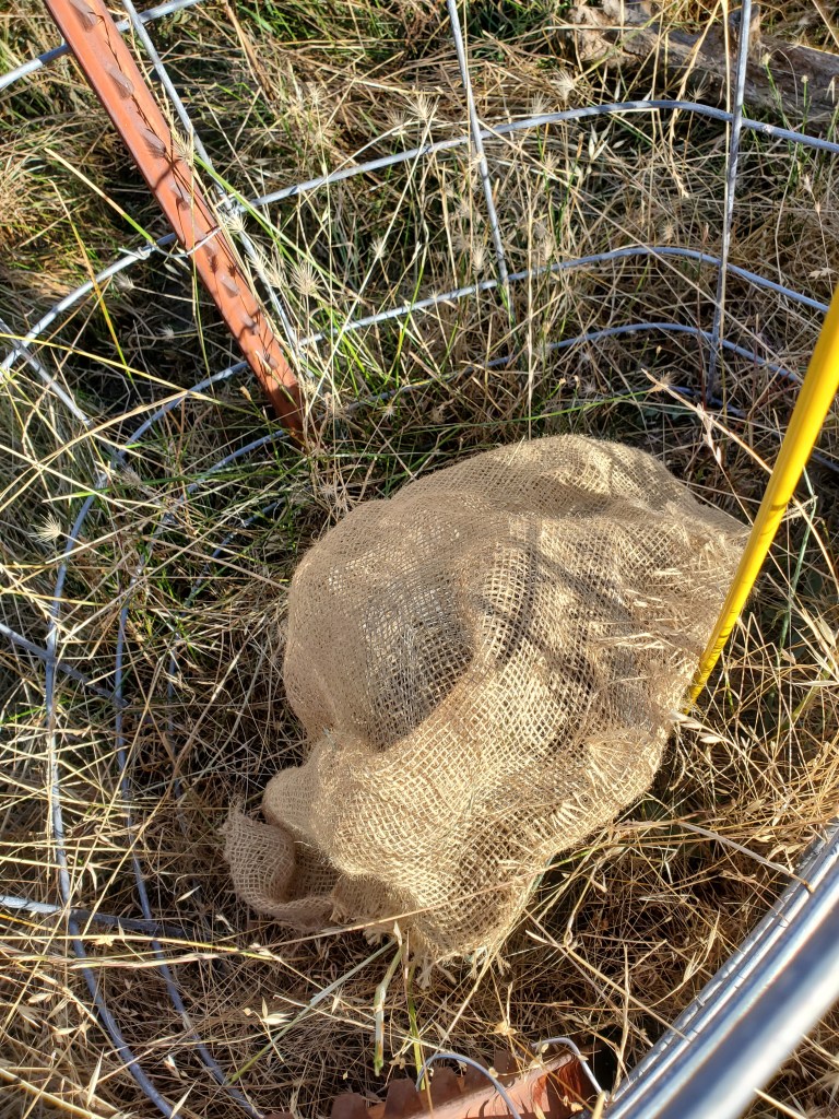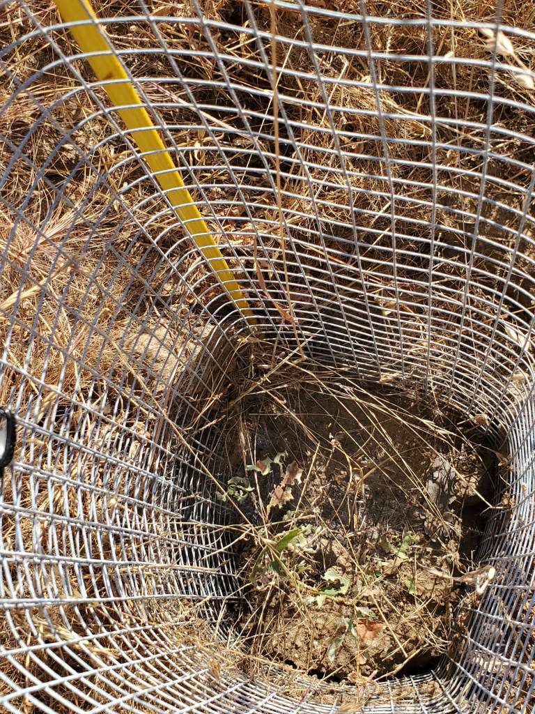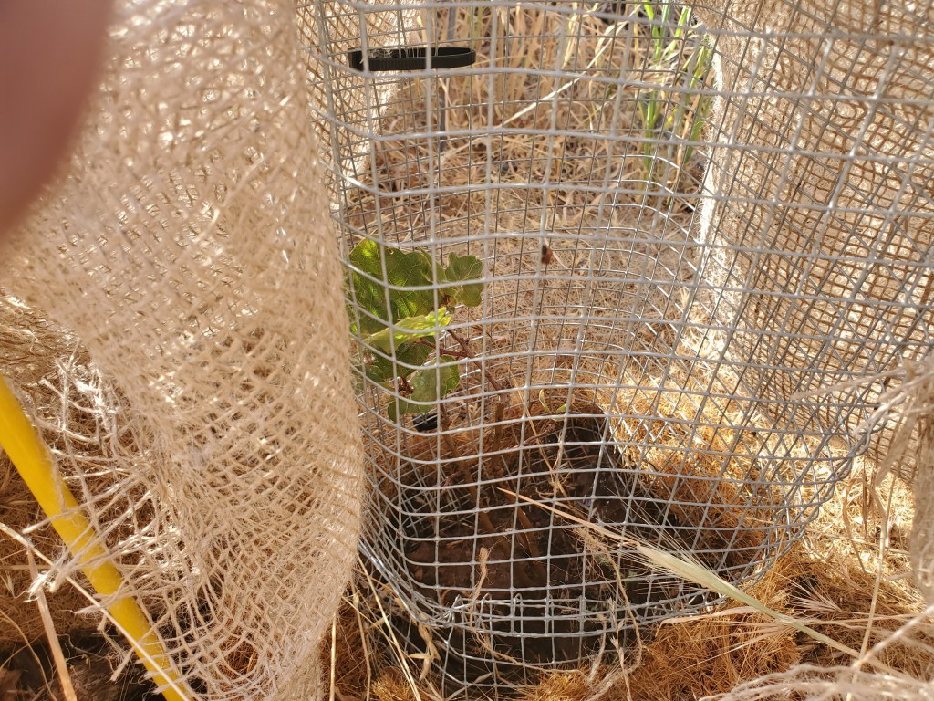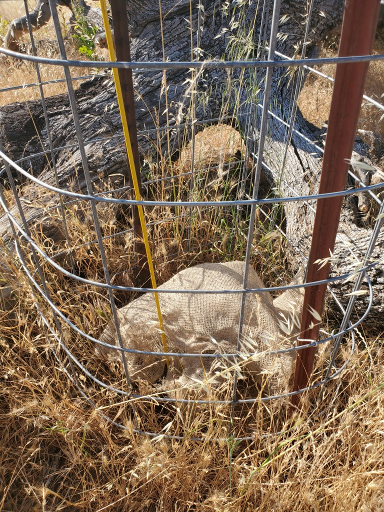 Just like in the movies, I will now take you to a flashback two weeks before the hoppers ramped up. David and I have been maintaining a strict watering schedule of every 5 days for the oaks. In anticipation of the mini heatwave, we also cut sections of burlap to lay over the gopher cages to shade the oaks. Sadly, two oaks appear to not have made it through the heat, the one in the exclosure and one of the driveway oaks. We continue to water them just in case the roots are still alive.