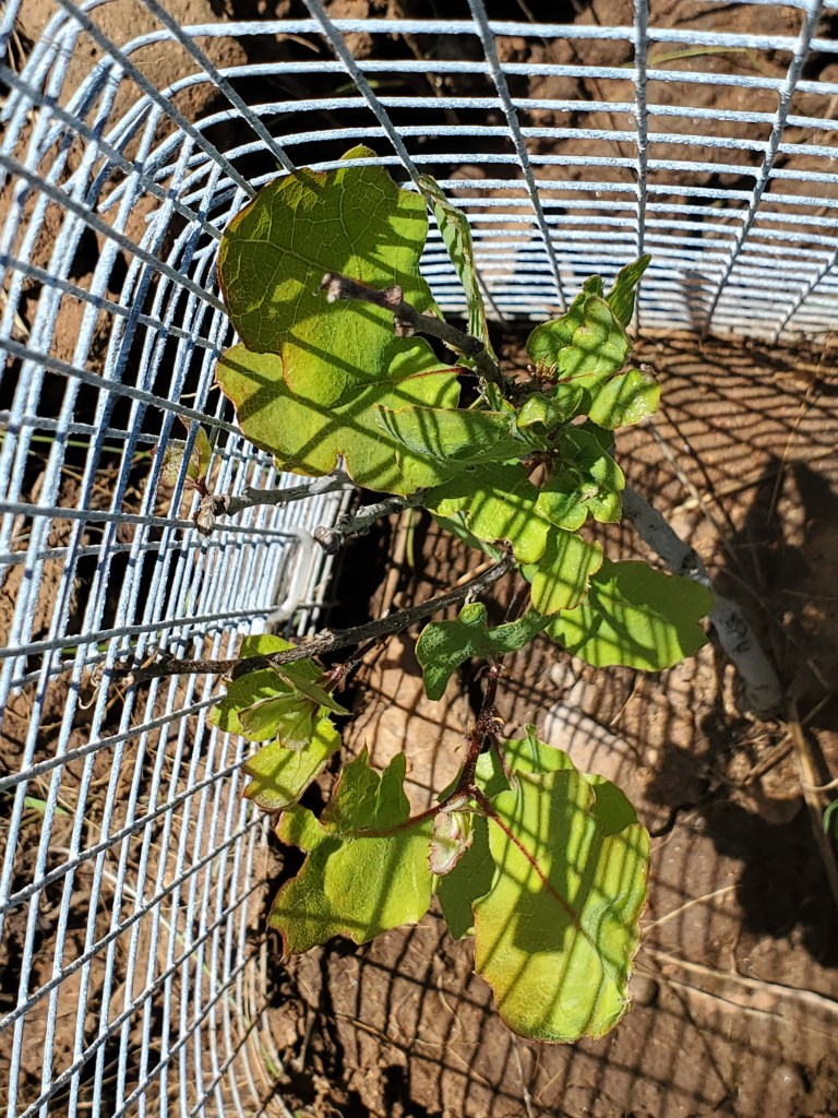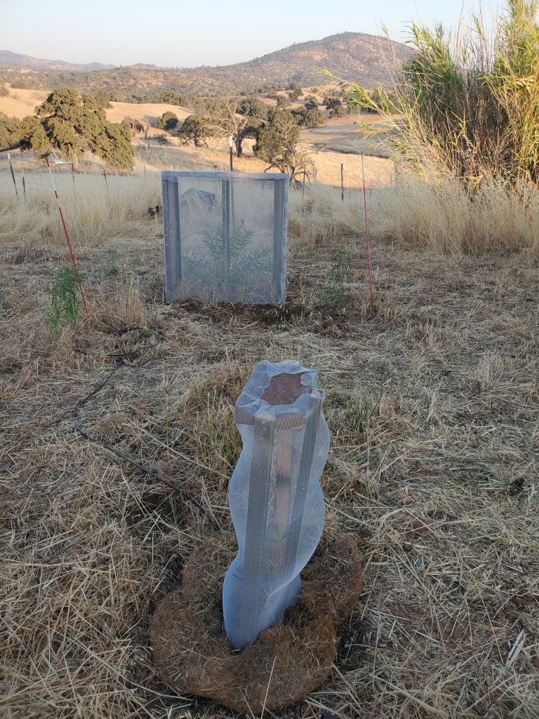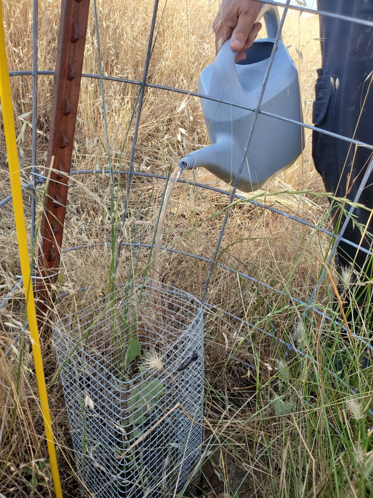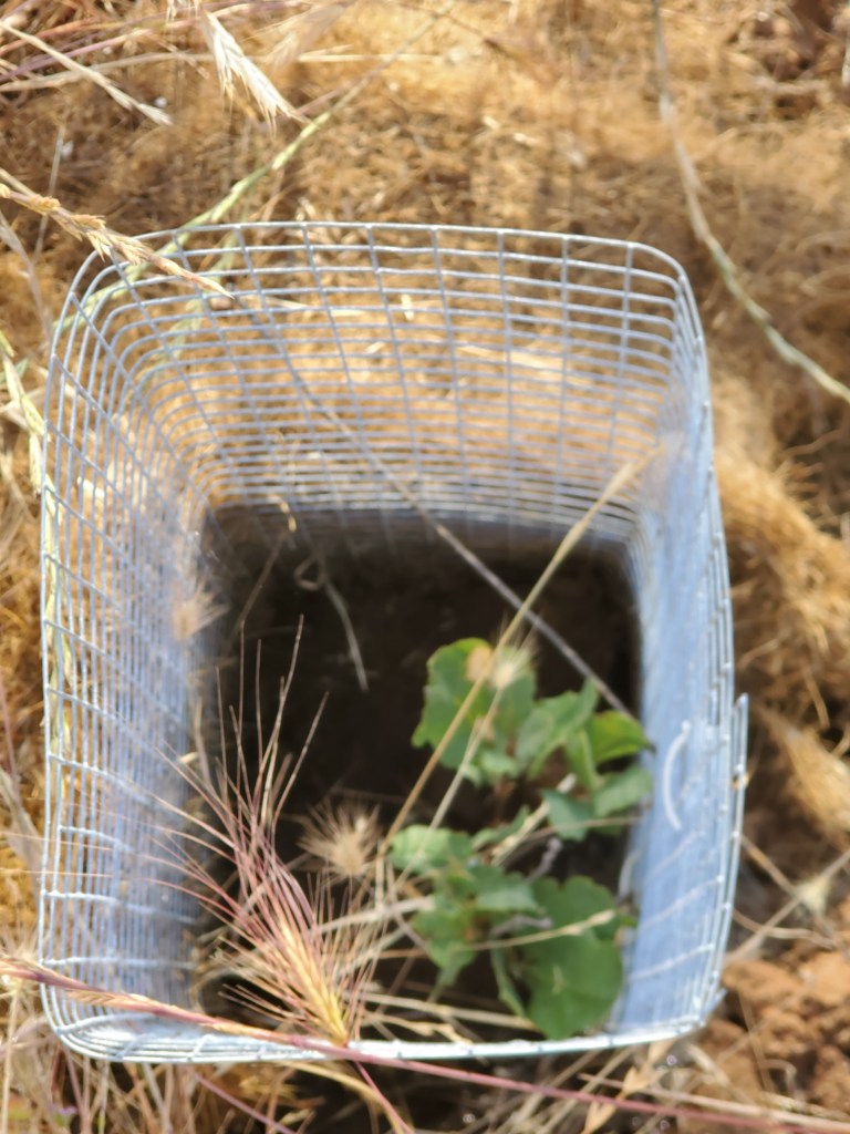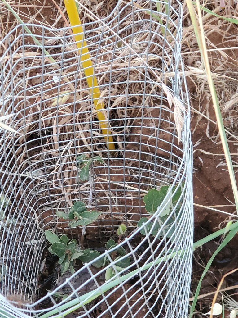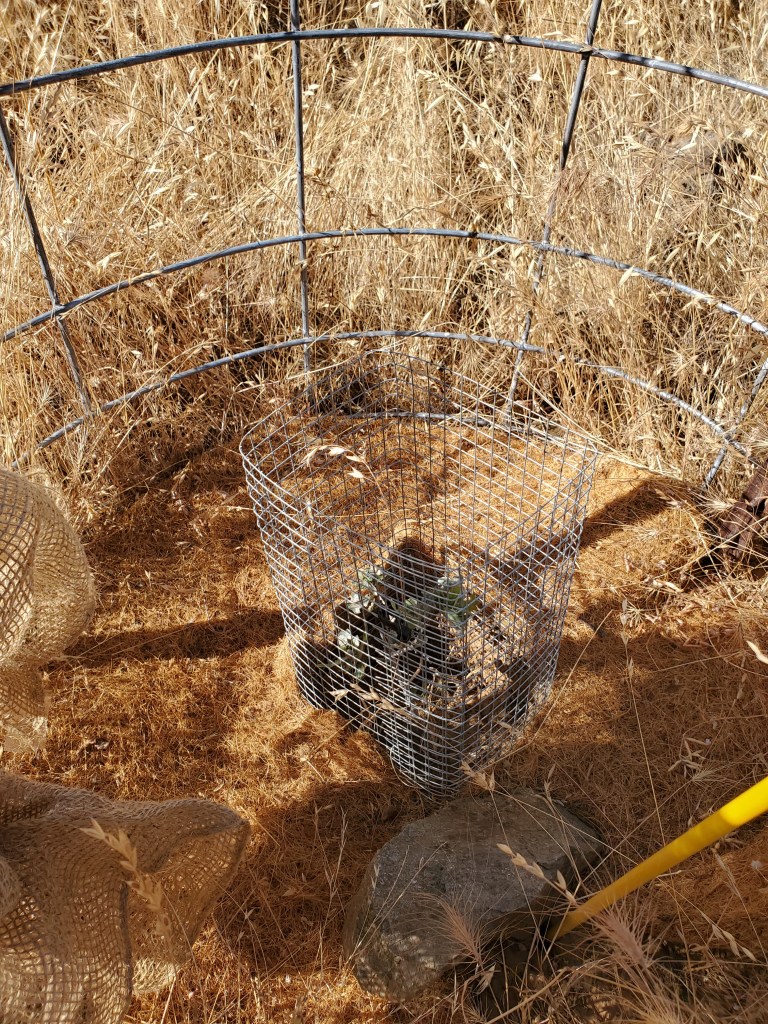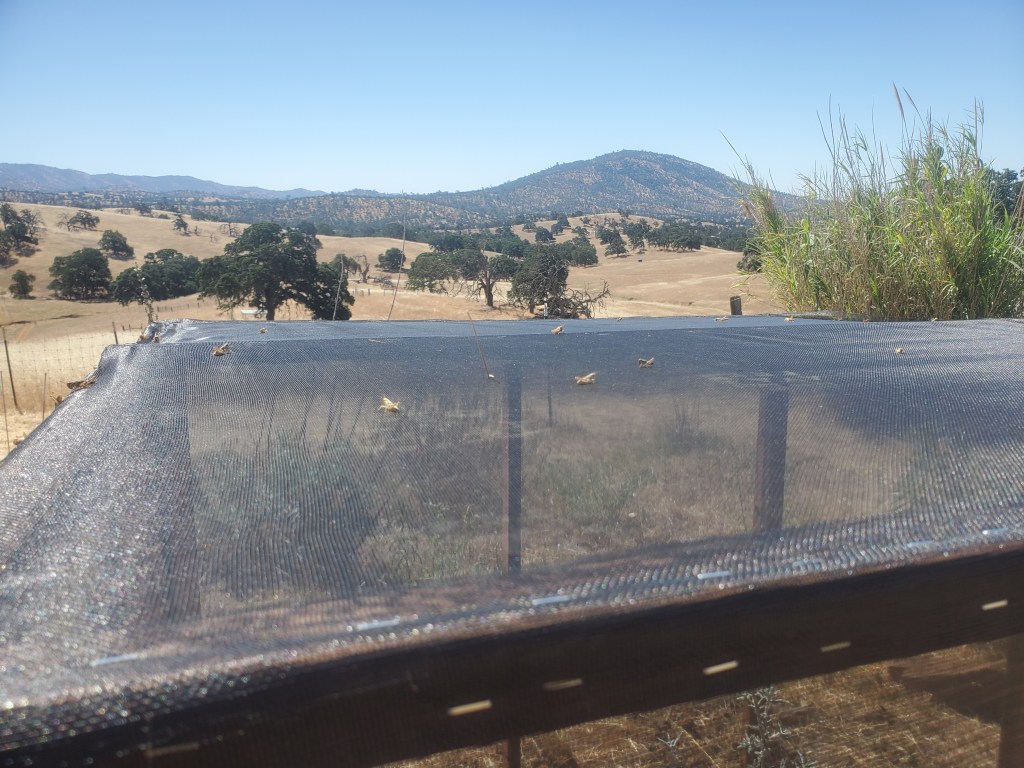Just like in the movies, I will now take you to a flashback two weeks before the hoppers ramped up. David and I have been maintaining a strict watering schedule of every 5 days for the oaks. In anticipation of the mini heatwave, we also cut sections of burlap to lay over the gopher cages to shade the oaks. Sadly, two oaks appear to not have made it through the heat, the one in the exclosure and one of the driveway oaks. We continue to water them just in case the roots are still alive.