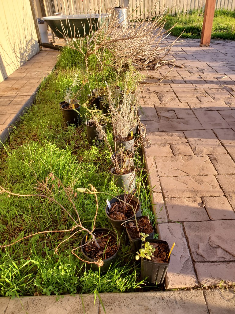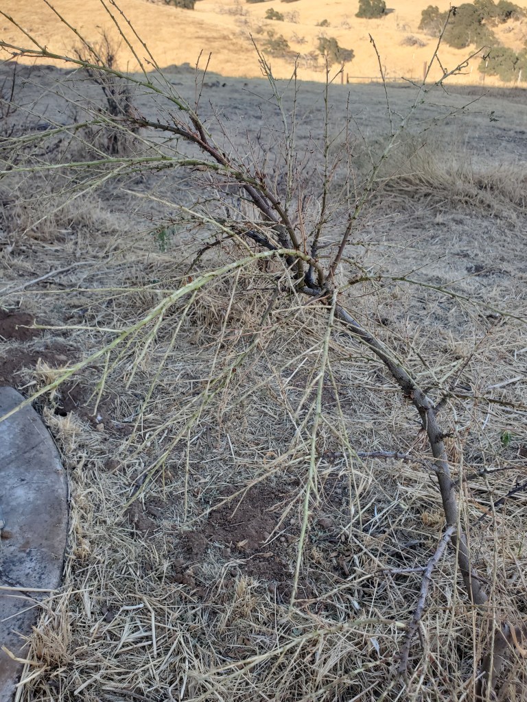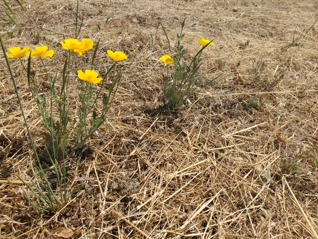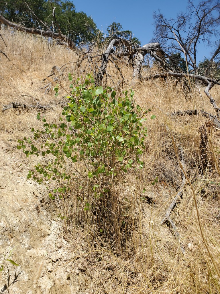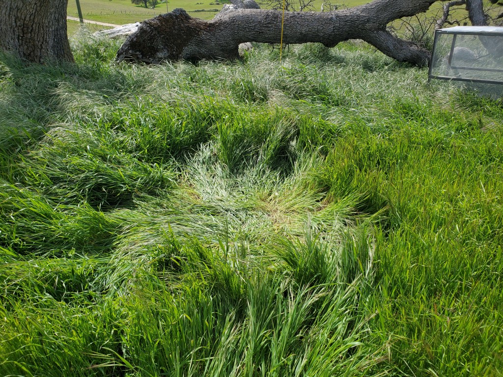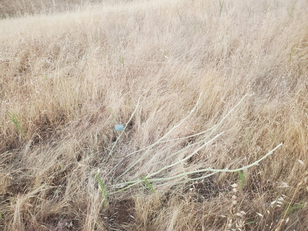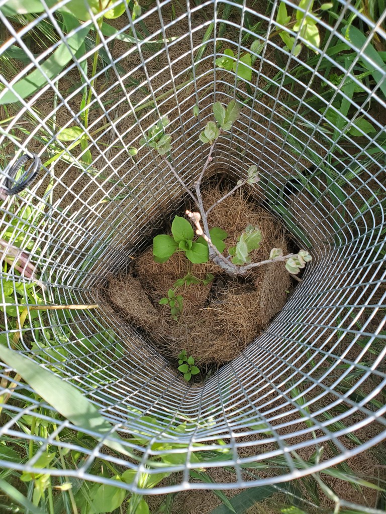 Just like in the movies, I will now take you to a flashback two weeks before the hoppers ramped up. David and I have been maintaining a strict watering schedule of every 5 days for the oaks. In anticipation of the mini heatwave, we also cut sections of burlap to lay over the gopher cages to shade the oaks. Sadly, two oaks appear to not have made it through the heat, the one in the exclosure and one of the driveway oaks. We continue to water them just in case the roots are still alive.