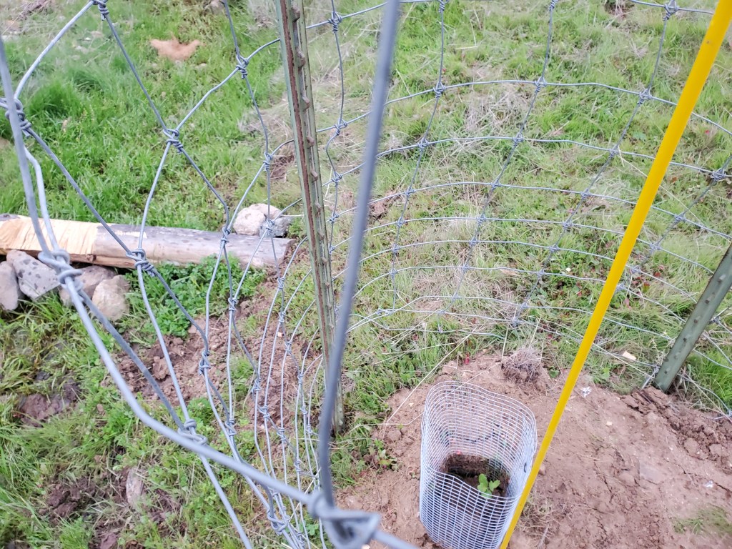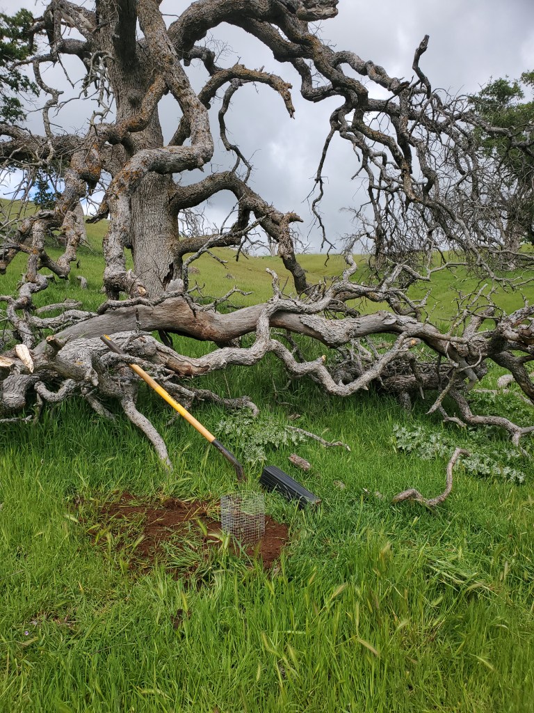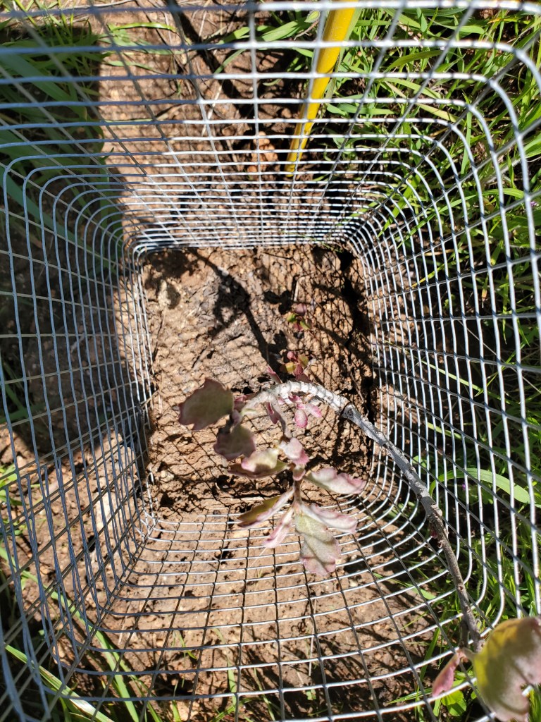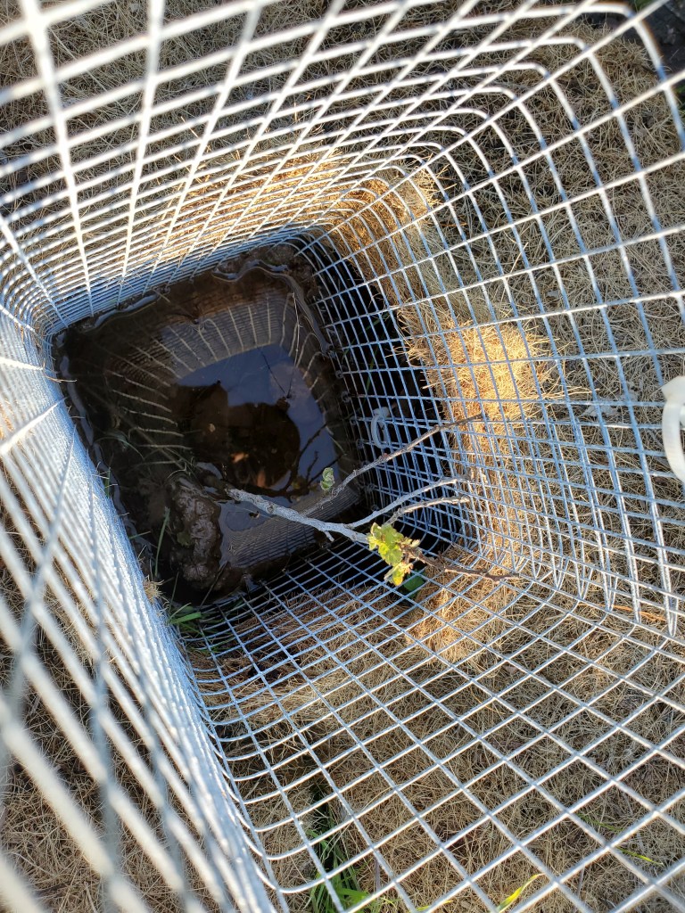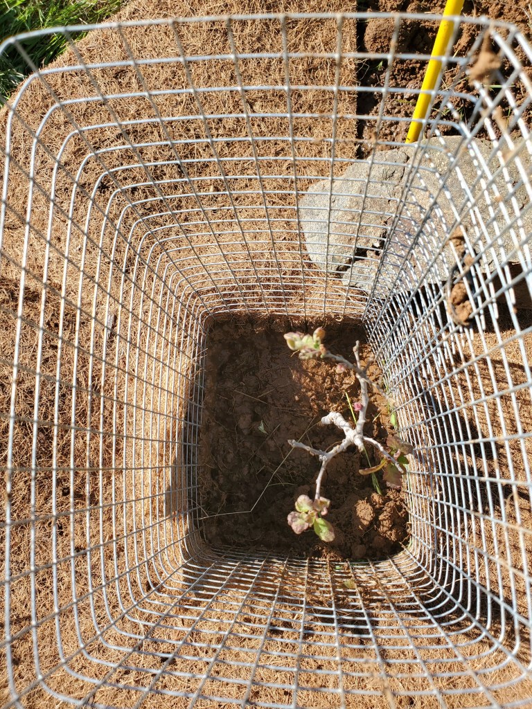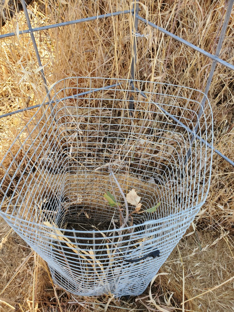 The first tree was the oak by the guzzler. Hopefully, I lifted the burlap. She was gone. I went to my knees, gripping the cage, lay my head on the fencing and let out a scream and started to cry. Another one so healthy just days ago –gone. I pulled it together, and with renewed determination, I set about doing what David did, slowly and steadily. I was able to use my right arm, instead of the hand, as a bolster to hold things against my body and my left hand to do everything else. It was not ideal, but it was the only tool I had.