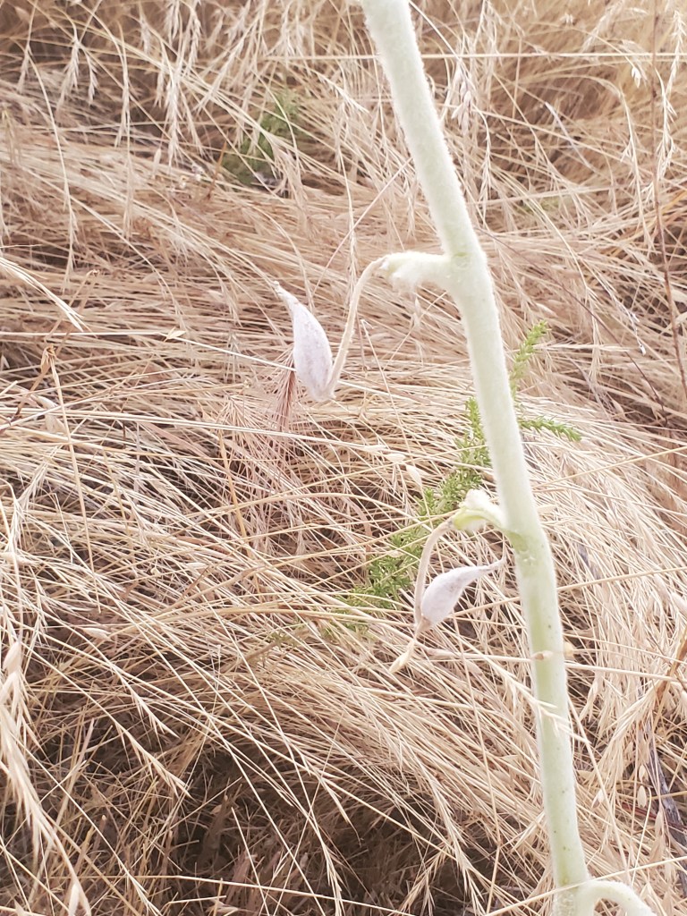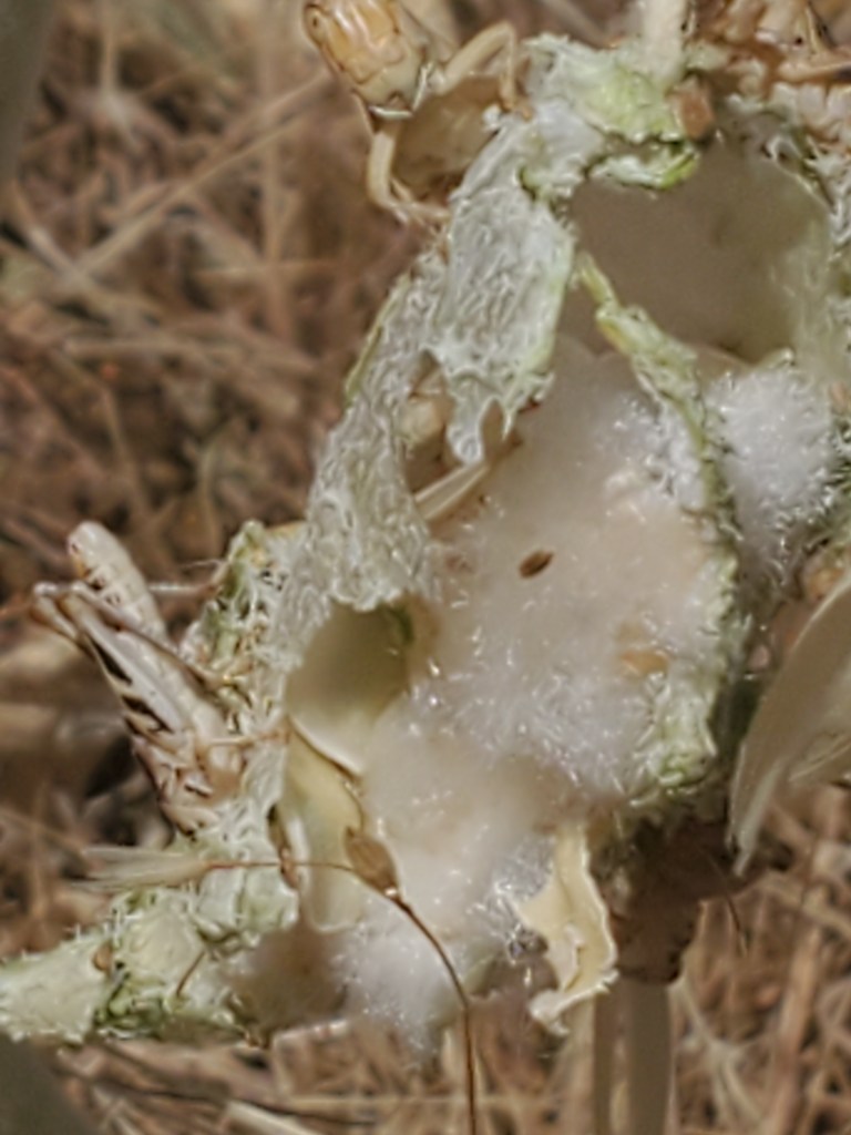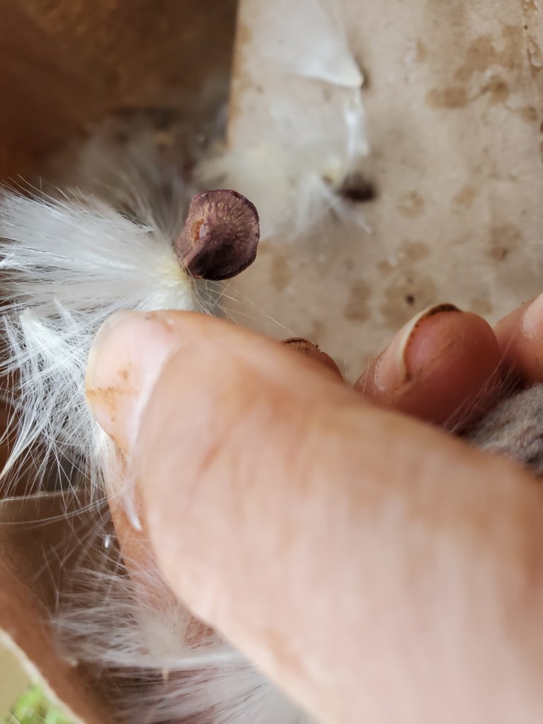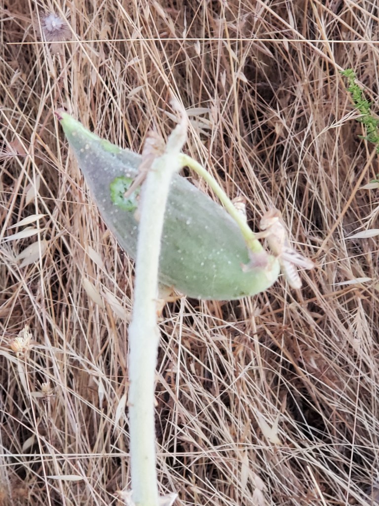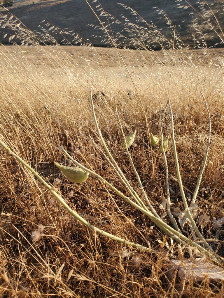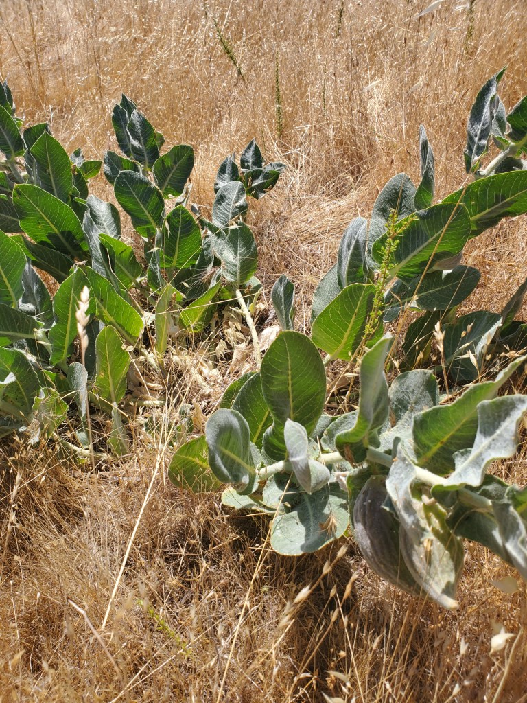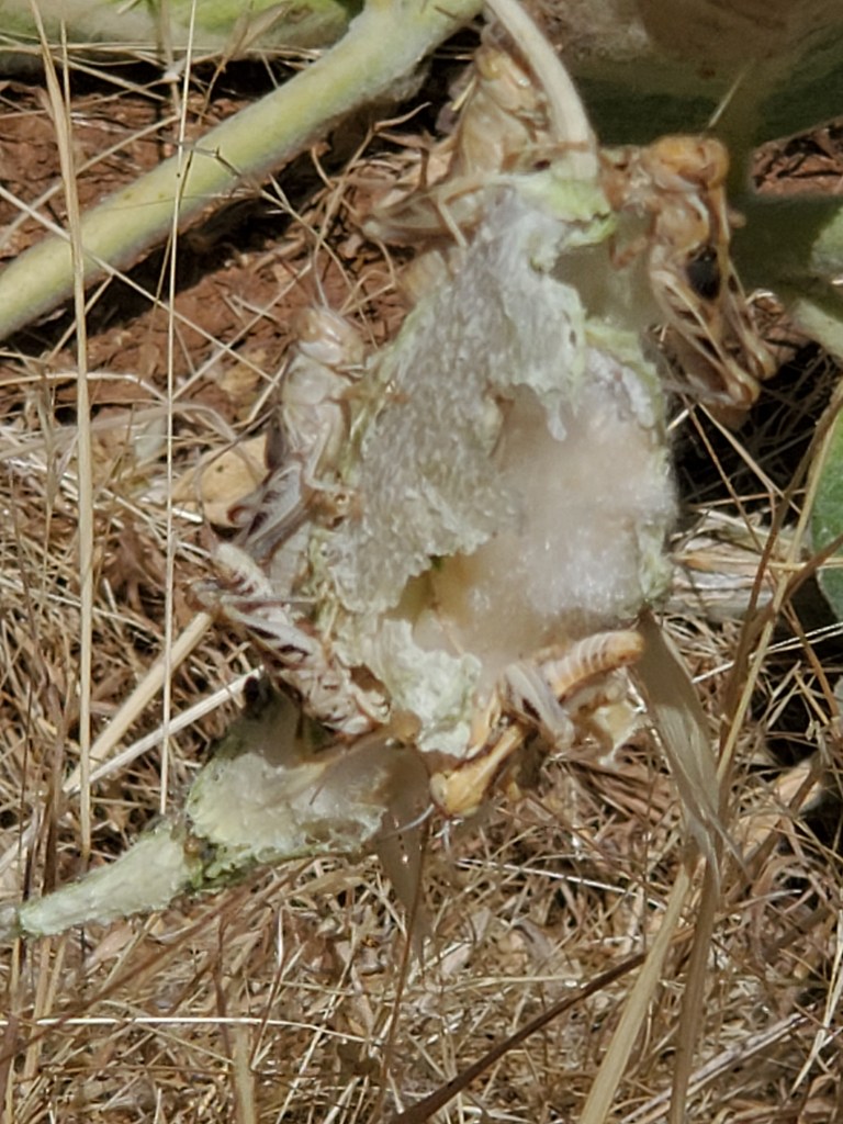 With no bag, I placed them in my pockets, held a bunch in my arm and finally, made a pouch with my tee shirt. Several branches, with seedpods still attached, had been dismembered from the plant by the hoppers. I used those as a base for piling on the loose pods. It worked. I was able to slowly navigate back across the hills, pregnant with A. Californica seed, to the patio without dropping a pod. After the danger has passed, I will release these seeds back into the areas from which I harvested them – probably September.