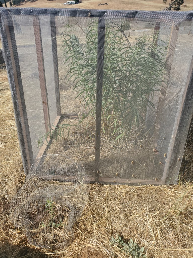 Except…this year, I am more ready – busted thumb and limpy leg and all. As soon as I saw some bites in the oak seedlings by the creek. I had David purchase aluminum screen. He began to make little screen houses to go over the gopher cages in which the oak seedlings were planted as well as other screen boxes for my pollinator plants. The poor guy. He is doing so much. I am getting better, little by little, but still cannot perform most of the ranch work I need to get done. David also has his paid work to do, which has been extremely busy of late. To enable us to get what we need done in the timeframe it needs to be done, I decided to hire someone to help us on the ranch, and to give poor David a break.
