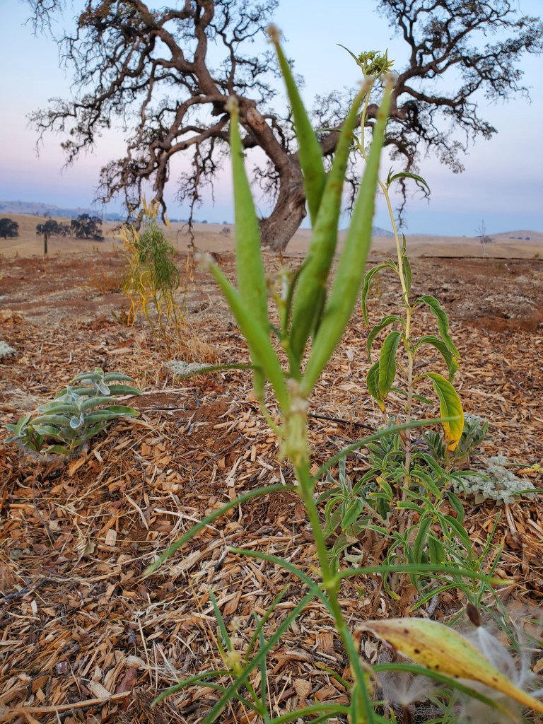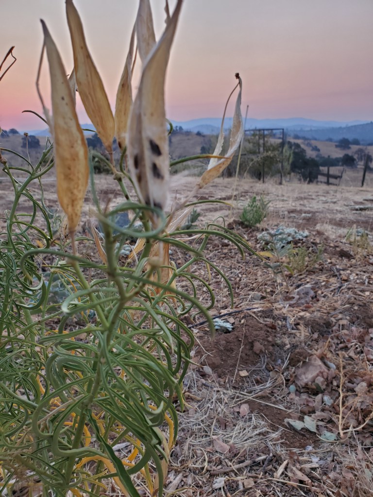 I shuttered with delight as I walked out into the cold air, overalls on, before the sun came up and with all intent to finish planting before the rain began. At a time in the past, one of the biologists told me that there was some evidence that 2 to 3 year old California milkweed seed had higher germination rates. In 2023 and 2024, the seed pods I saved from the ravages of the grasshoppers were intended for planting a year or two or three later. The 2023’s were maintained in a cool, dry, dark place for a nearly 2 years. The 2024’s were were maintained the same, but for just two seasons. I brought them both with me, including my trusty small rake.
