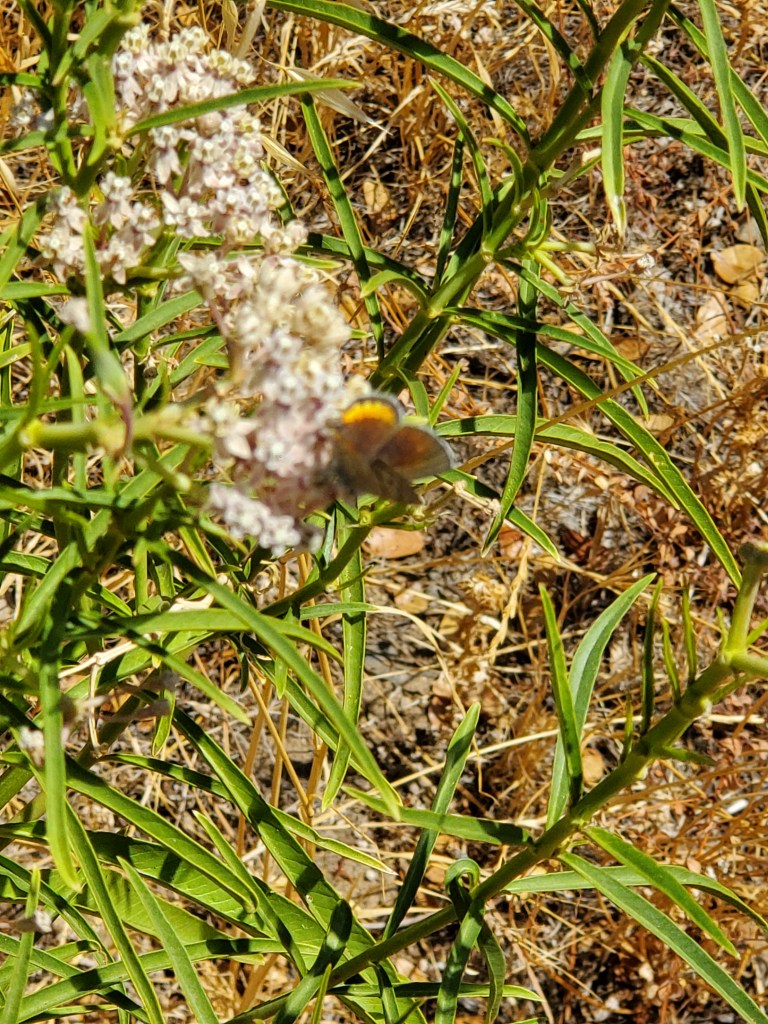 I am now able to identify narrow leaf milkweed in the wild and have seen several plants in my creek bed and on the side of the road around the county. It is very interesting that they often appear alone or quite a distance from one another. I wonder if that has to do with years of grazing and pesticide use (on the major highways). On a monitoring excursion to Odom Creek last week, I found two or three milkweeds in bloom in the creek bed. There were several California Hairstreak butterflies around each plant. I saw a buttery yellow cabbage or sulfur butterfly and one buckeye butterfly.