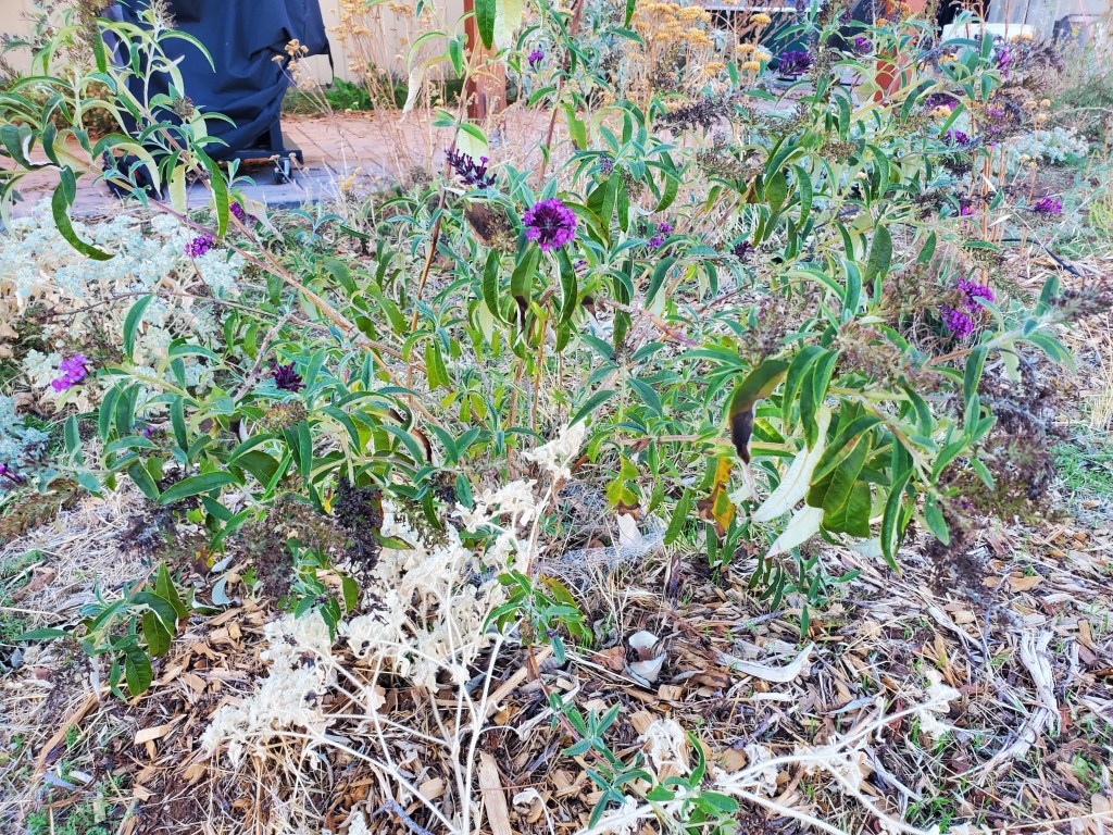 As planned, we have plants in bloom from the beginning of Spring throughout Fall. In bloom currently are California fuchsia, goldenrod (just opening), marigold, sunflower (still going!), pacific aster, a few gum weed and Mexican sunflower blooms, buddleia, vinegarweed (lots of these plants this year), and tarweed. There are even several herbs and onions blooming. There are many options for the pollinators to choose from.