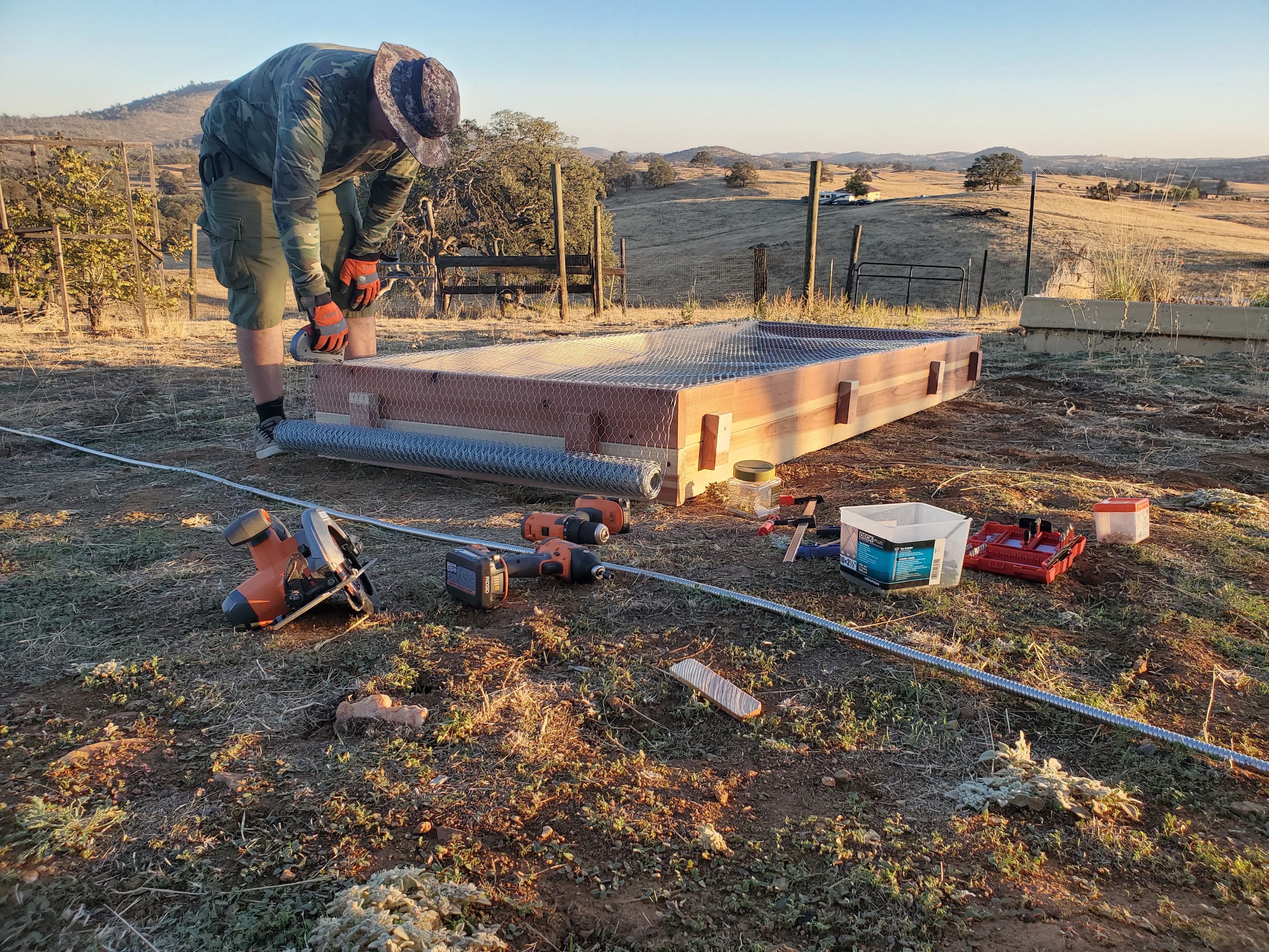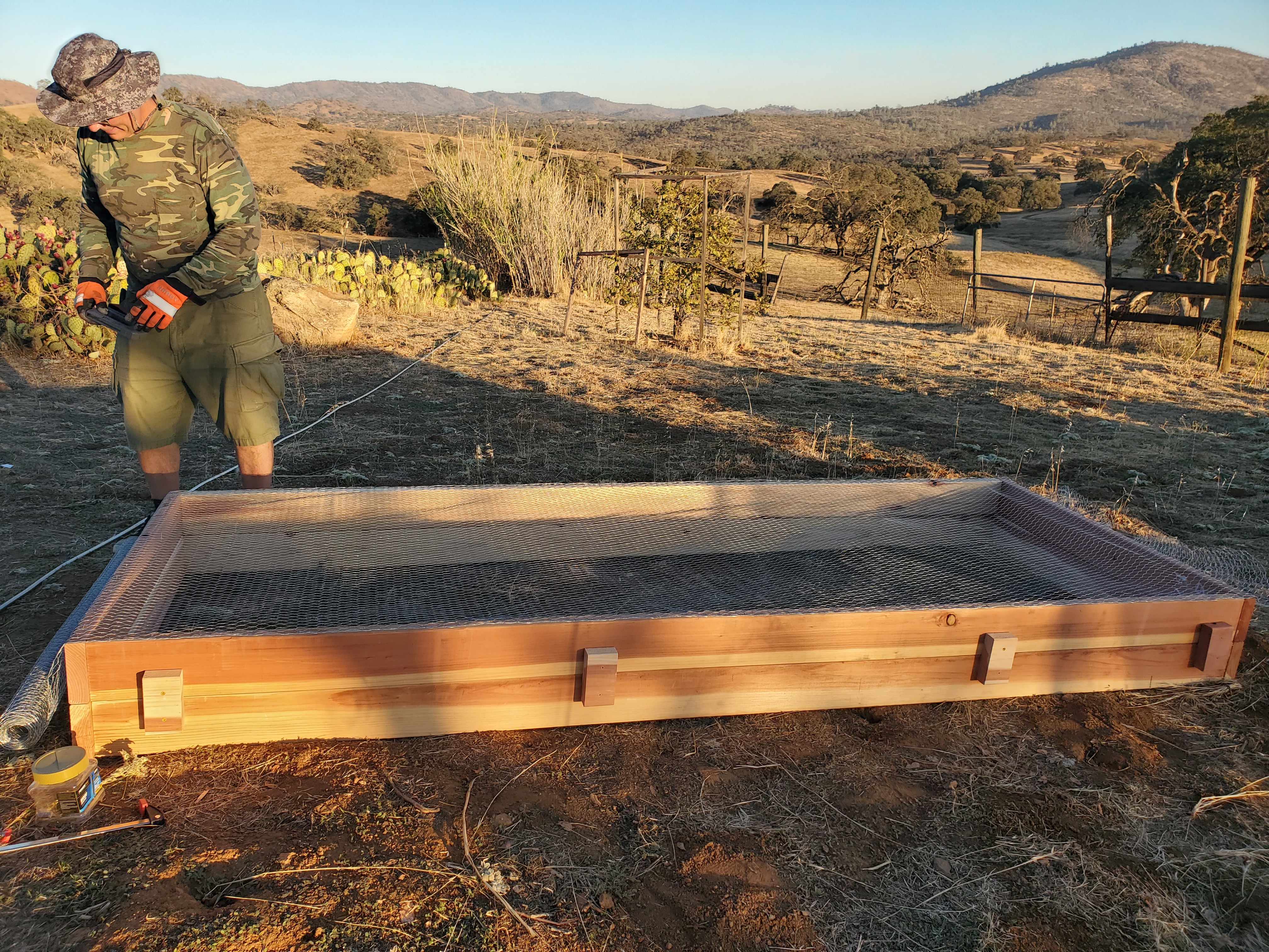 The weather has been so warm I decided to start a winter garden with plants that should have been full grown by now and producing food – like tomatoes. I am also including vegetables, herbs and flowers that should be ok late and/or over winter normally – like lettuce and spinach. I have a number of strong looking seedlings, but will not plant in my tomato tub raised bed due to the ongoing gopher intrusion. There is no other place cultivated to plant, so I asked my darling husband to build me a new raised bed. Truthfully, I can do this myself, but David loves to work with wood and is much handier than I am. So- he gets the job. David built me a gorgeous raised bed using redwood and secured it with a roll of Diggers double galvanized mesh (same company I get the speed baskets from to plant my native plants). Because I am raising vegetables, I needed richer soil and did not have time to bring my local soil up in nutrients (bad planning on my part). I had to purchase soil, which was costly. I have a couple of old french doors I salvaged, which I will use to make a greenhouse over the tomato part of the bed. I am hoping this will help bring the tomatoes to maturity. It is all an experiment.