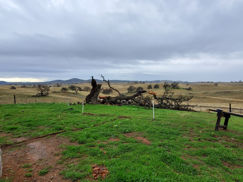 With my thumb still busted, wrist, knuckles and ankles still sprained, my job has been copilot, holding the water bucket with my good hand, carefully walking over to the tree, watering and removing the burlap and coir pad. David was doing everything else. As we went to each tree, I held my breath as I lifted the burlap shade cover, hoping I would see the healthy seedlings I had watered just 6 days prior. The two upstream on the Spring Creek…they looked great. I breathed out. The one by the lower pastures planted into the old dead oak, I lifted the cover, mostly eaten. There was one green leaf left. I’ll take it. Watered and screened. The discovery was unsettling. I became nervous for the others.