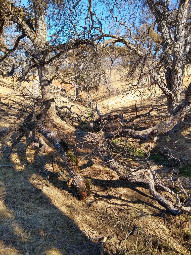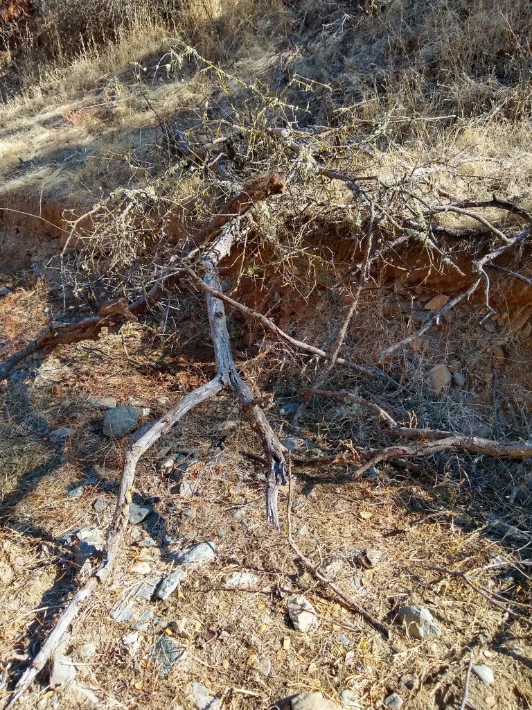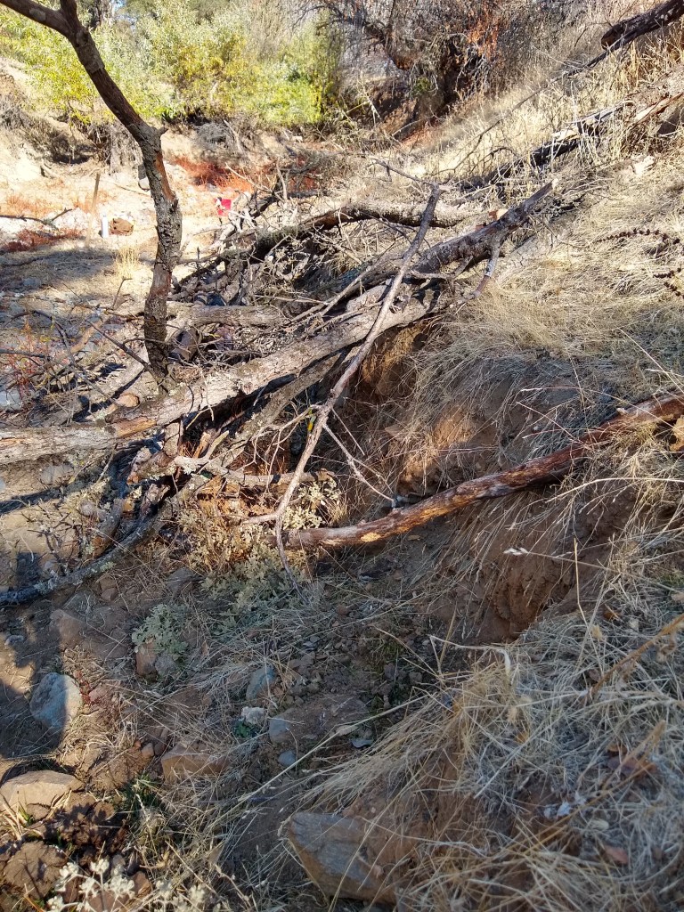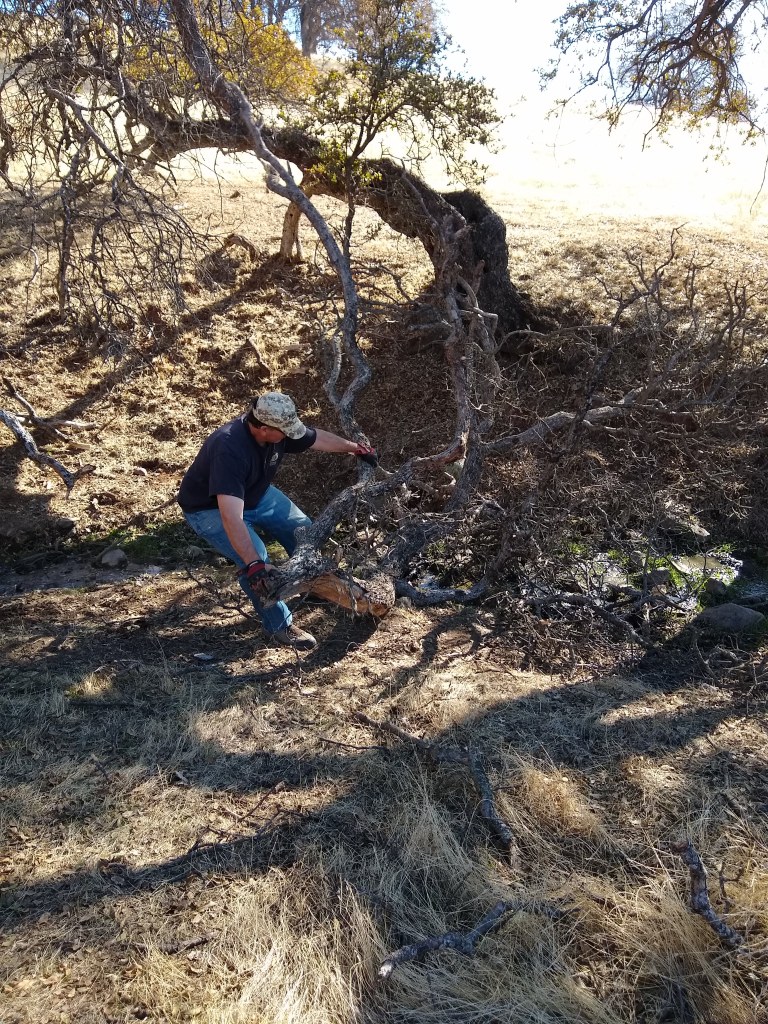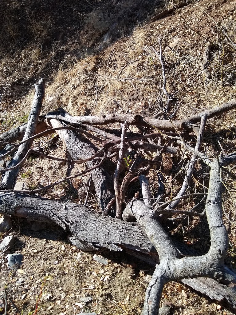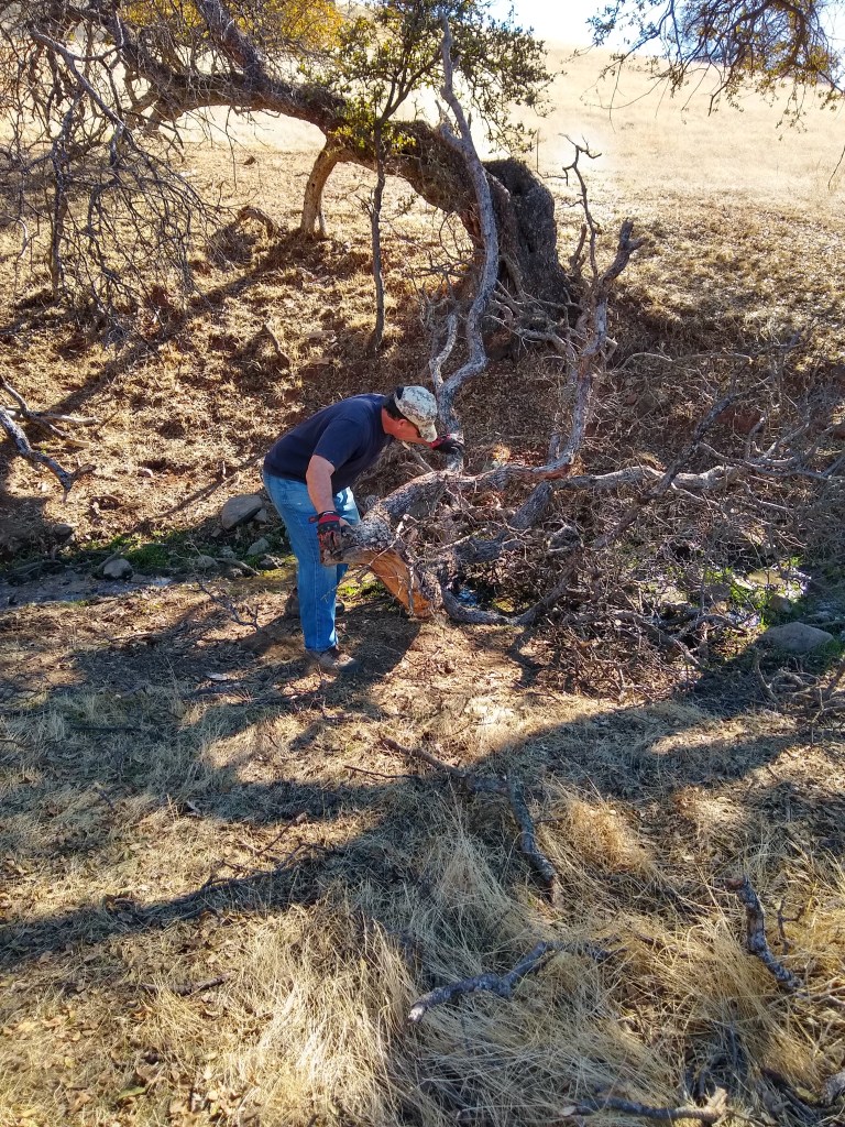 After seeing the path, I began to use rocks and other branches to block the path. Just up the hill on both sides of the creek are dead oaks with downed branches. In the last drought, we lost about 300 oaks across the ranch. It can be sad to see their ancient bodies in various states of decay. In this case, as I harvested the branches from the ground, I thanked the trees and limbs and told them that their remains will be used to promote new life so important to the health of this place. It is important to be grateful and respect all things.