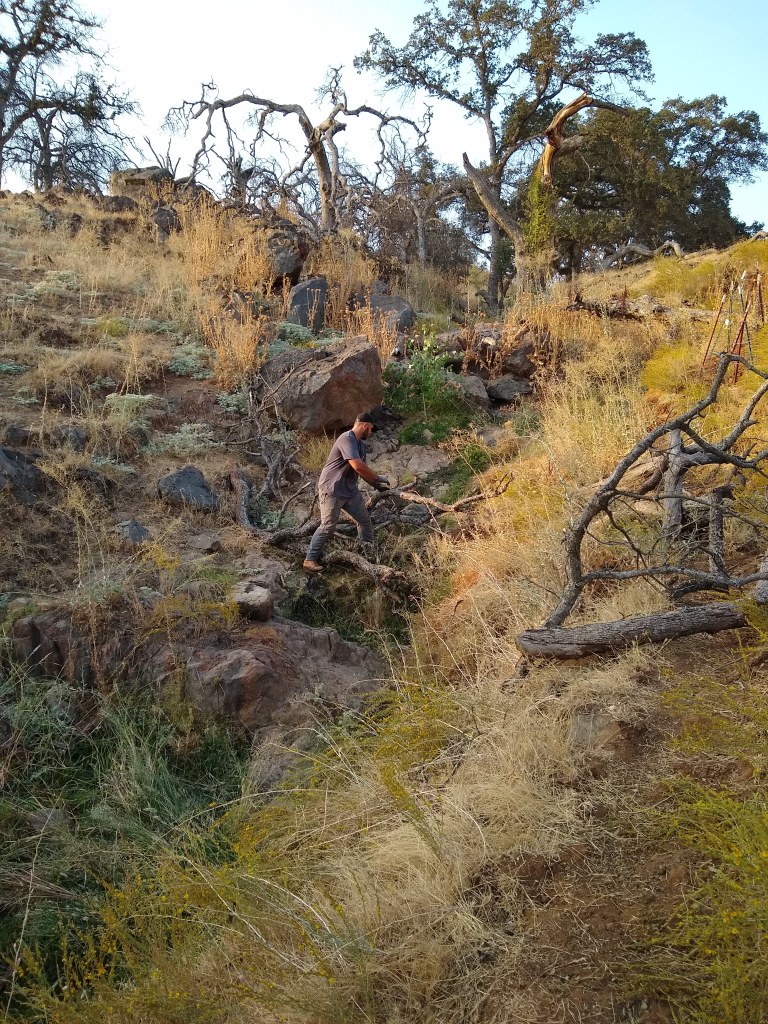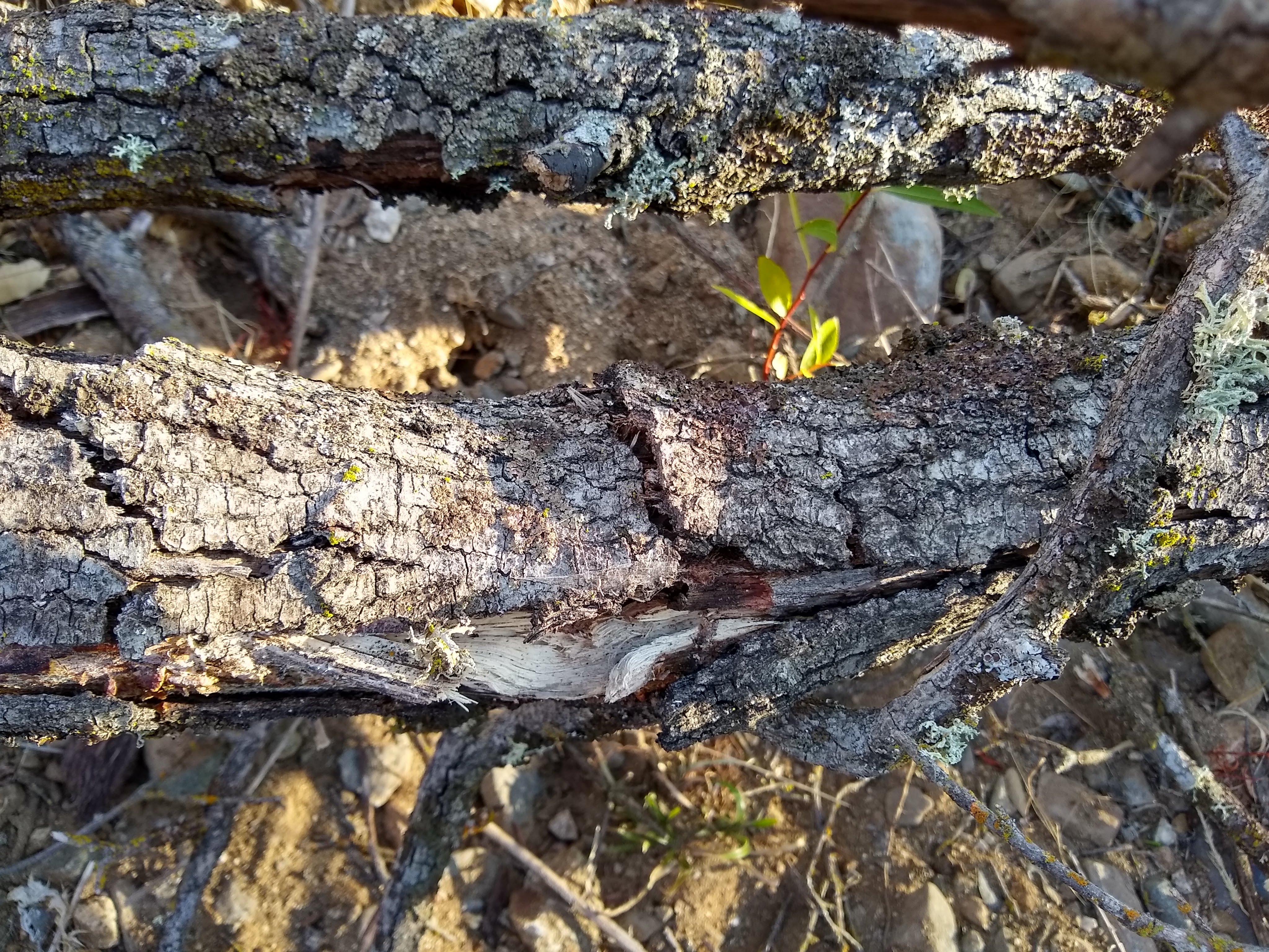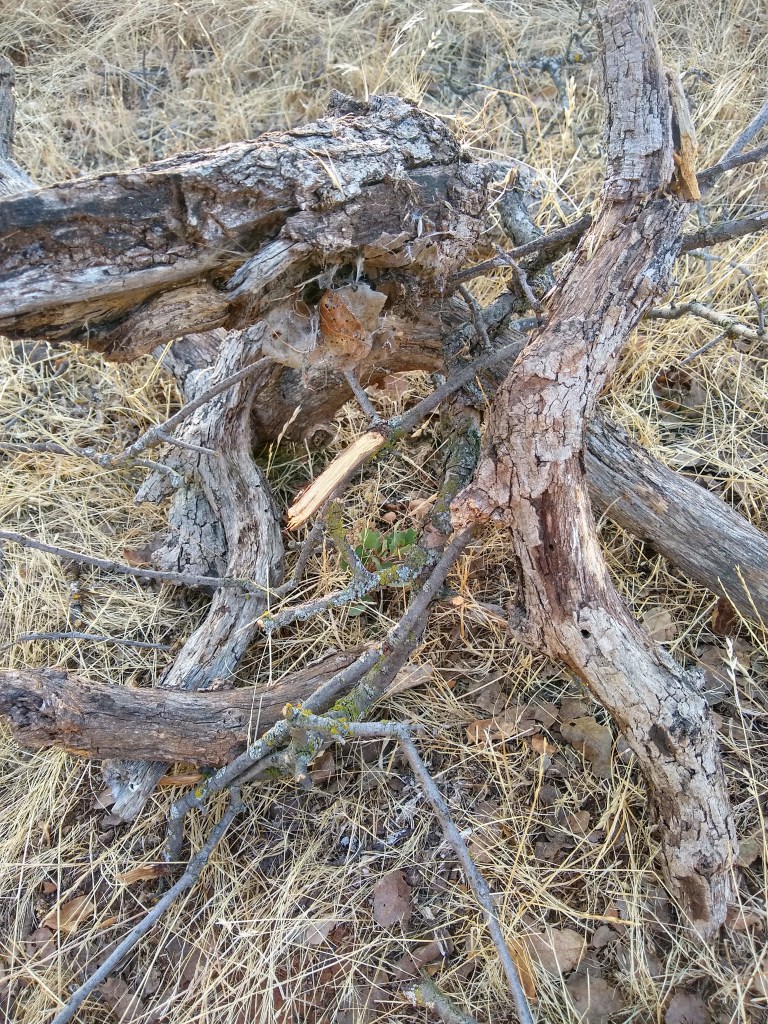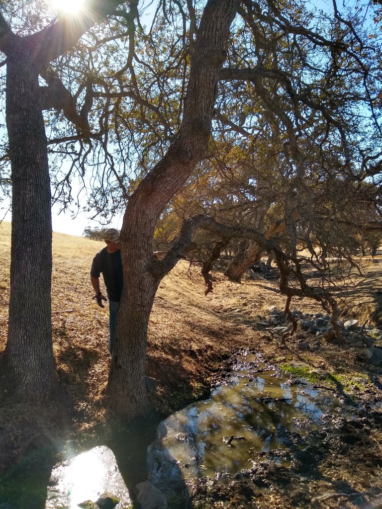 After seeing the path, I began to use rocks and other branches to block the path. Just up the hill on both sides of the creek are dead oaks with downed branches. In the last drought, we lost about 300 oaks across the ranch. It can be sad to see their ancient bodies in various states of decay. In this case, as I harvested the branches from the ground, I thanked the trees and limbs and told them that their remains will be used to promote new life so important to the health of this place. It is important to be grateful and respect all things.
