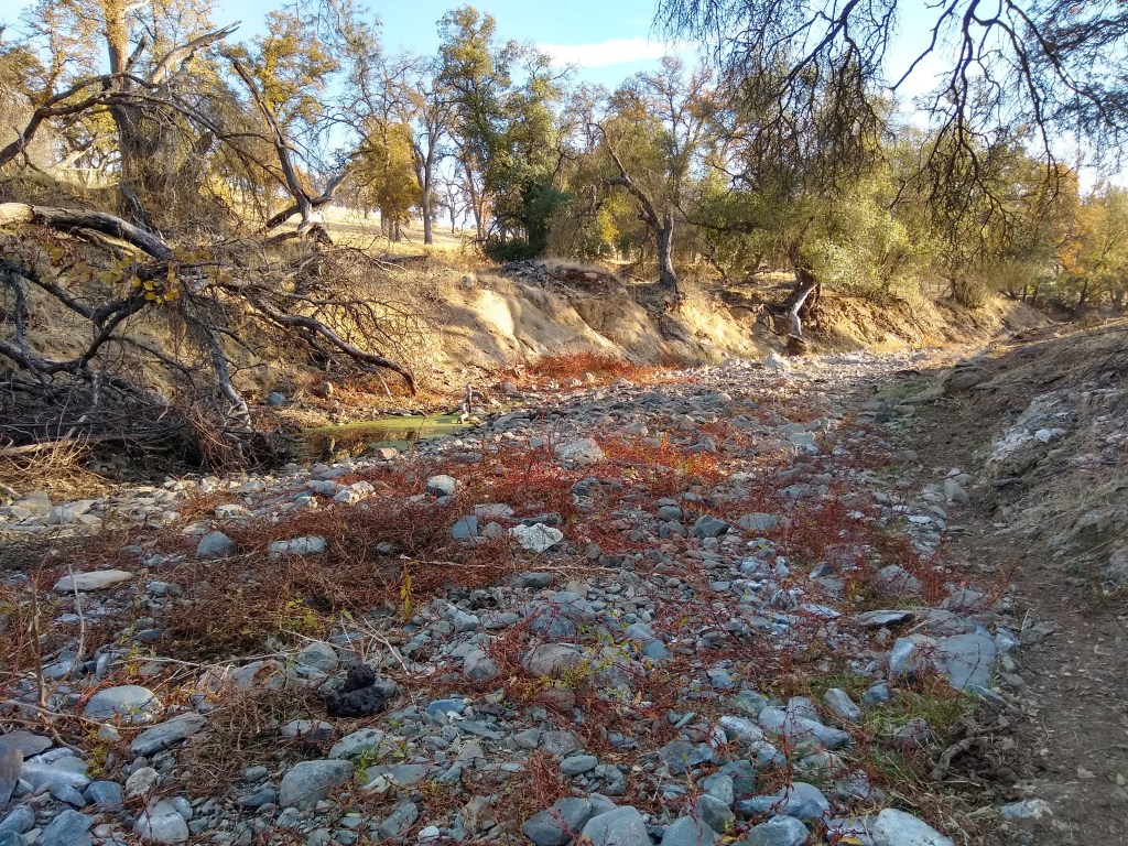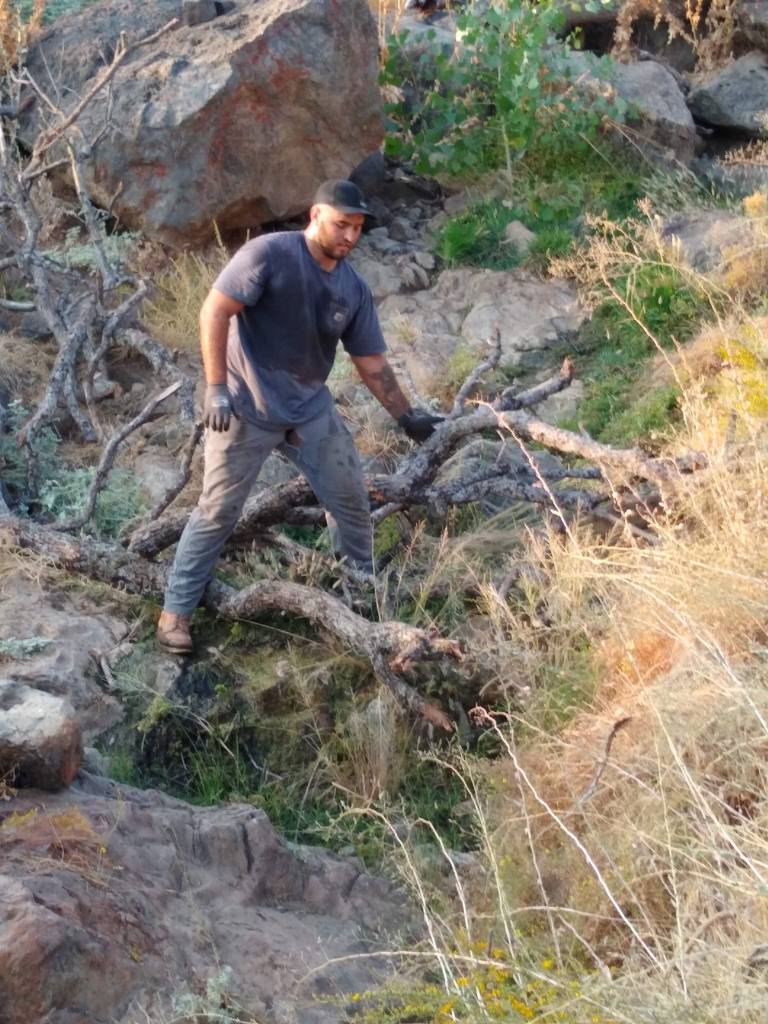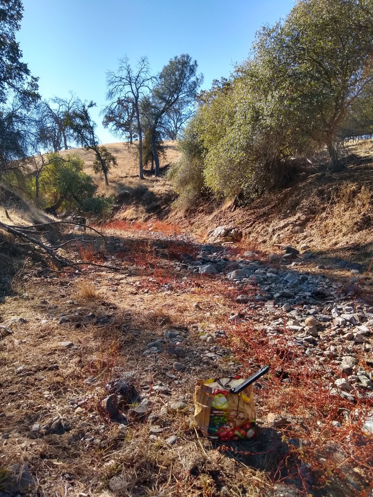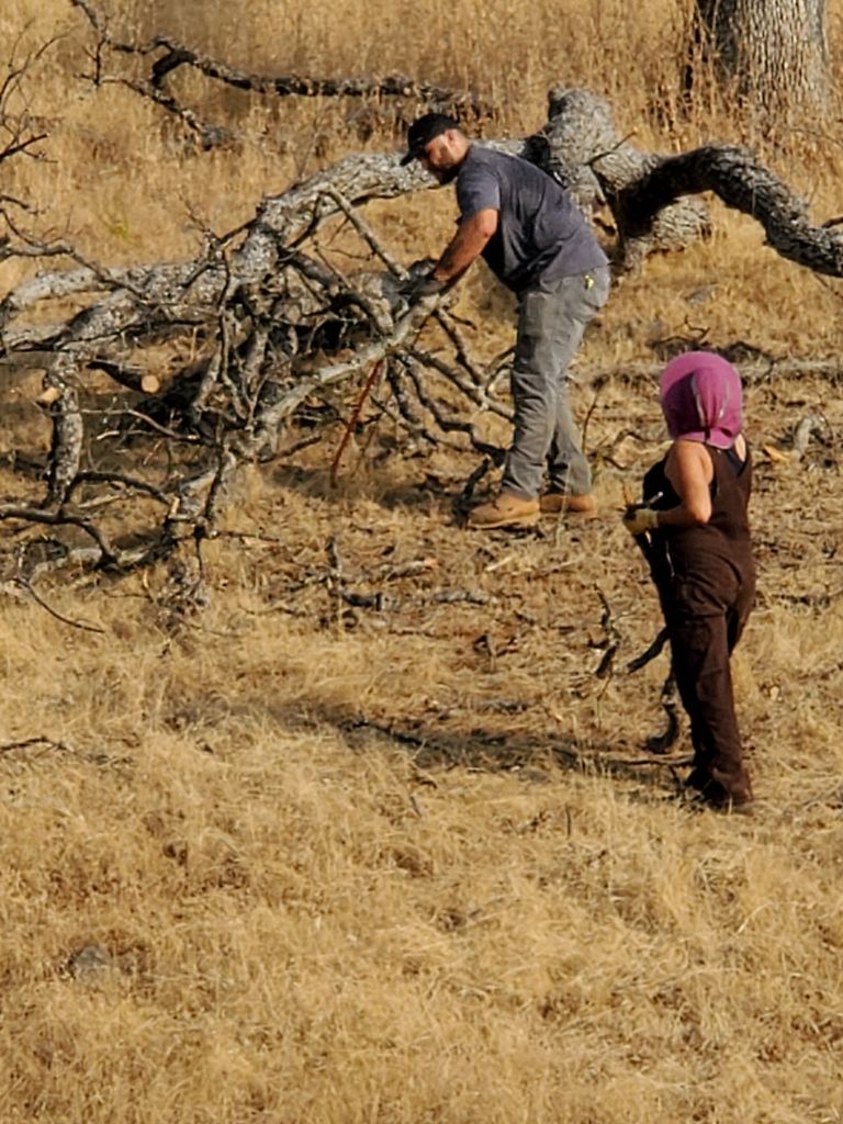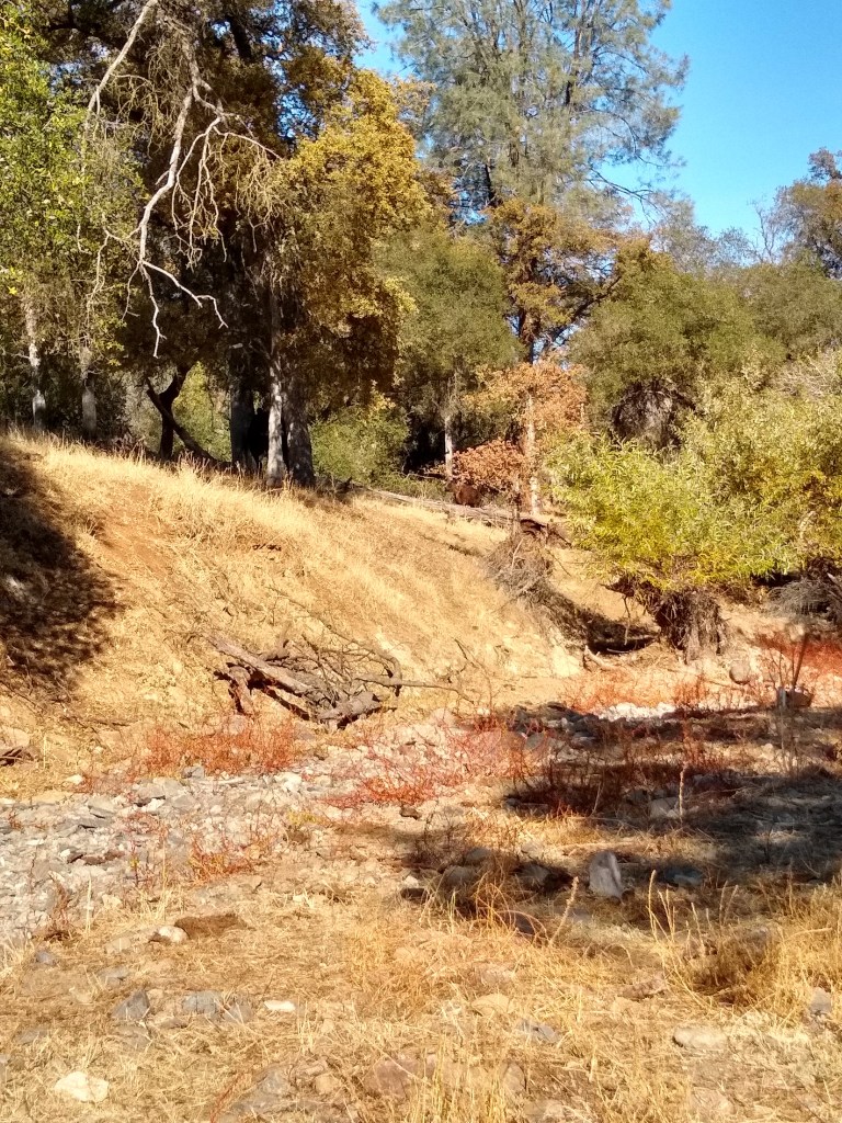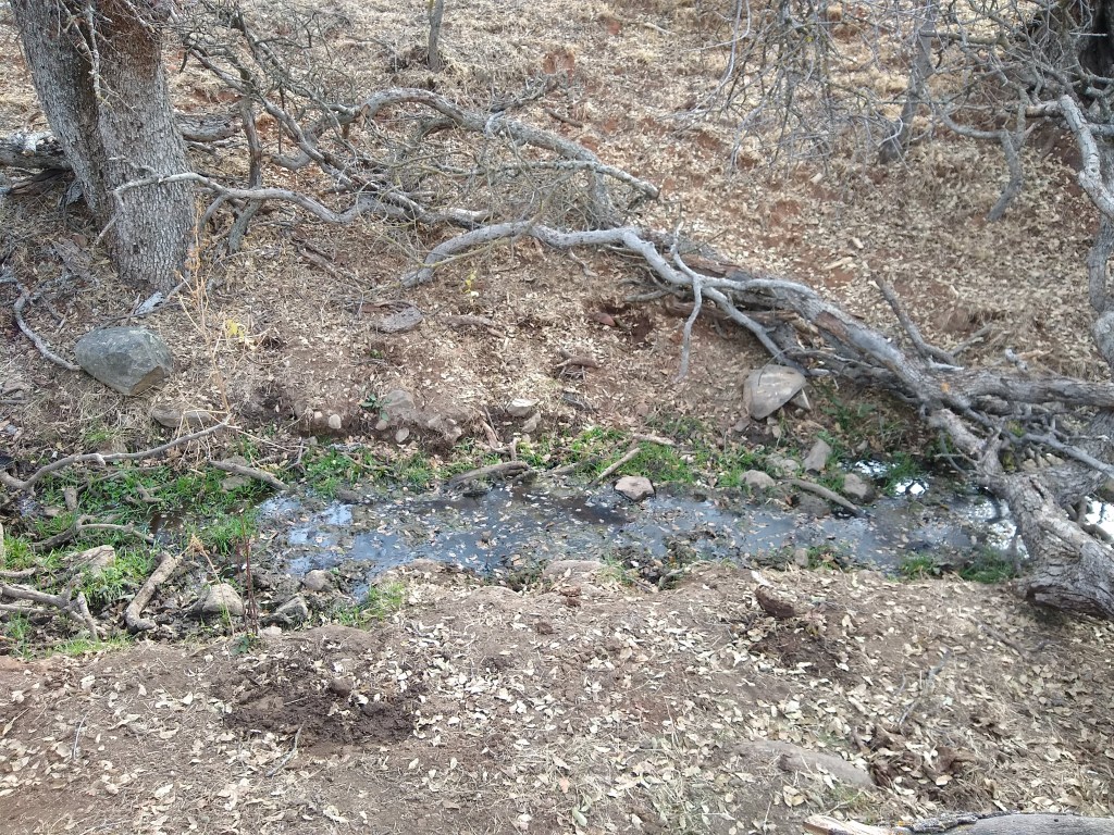 After seeing the path, I began to use rocks and other branches to block the path. Just up the hill on both sides of the creek are dead oaks with downed branches. In the last drought, we lost about 300 oaks across the ranch. It can be sad to see their ancient bodies in various states of decay. In this case, as I harvested the branches from the ground, I thanked the trees and limbs and told them that their remains will be used to promote new life so important to the health of this place. It is important to be grateful and respect all things.