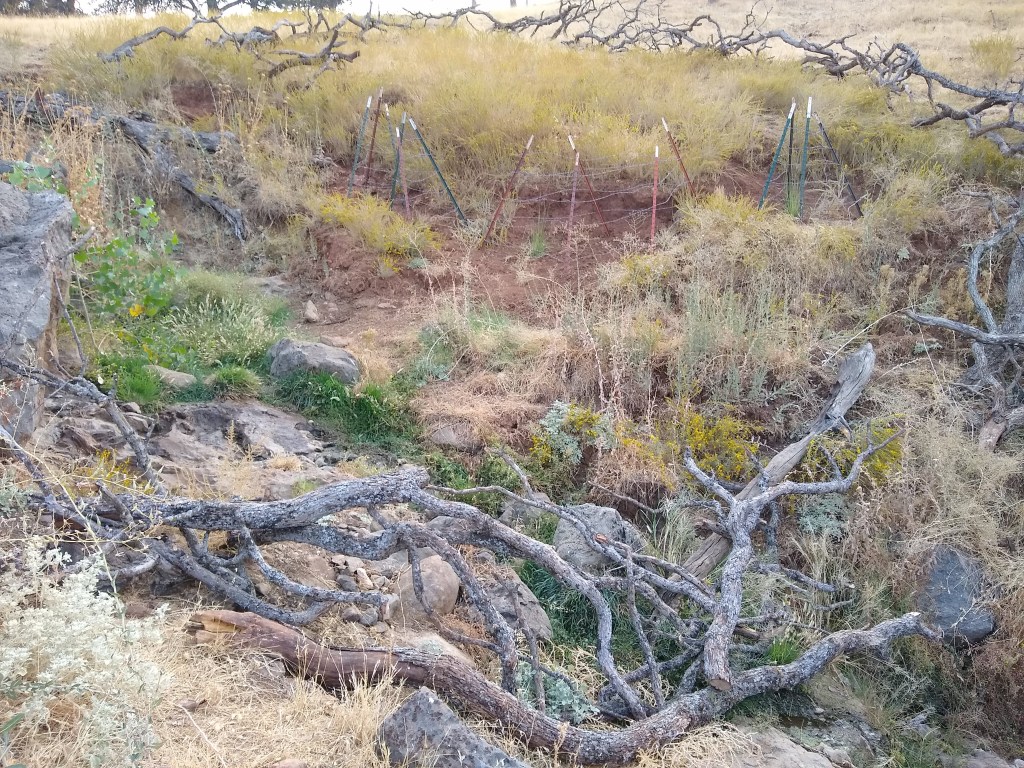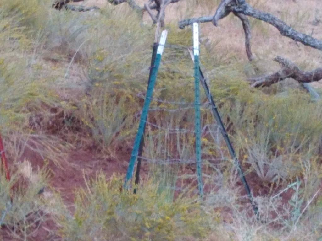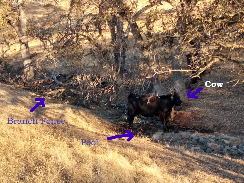 I have been checking the plantings in the branch fence (Site XR1) about every three days. Over the last six weeks, I saw that pieces of branch fence had fallen or had been tested by the cattle. The fence needed to be monitored and more branches placed every week or so. Last week, I noticed that the cattle had blazed a trail tightly alongside the enclosure. Hummm. This worried me. The fence had been tested just a week earlier resulting in me placing more branches on the east side. Now, it appeared that the cows were developing more than a passing interest. It makes sense that they would. With the limited precipitation, the grass is getting a bit thin on the ranch. By contrast, the creek beds are lush with growth. This is certainly true in the XR1 enclosure. More than grass is growing healthy and tall – quite an inducement to push in.