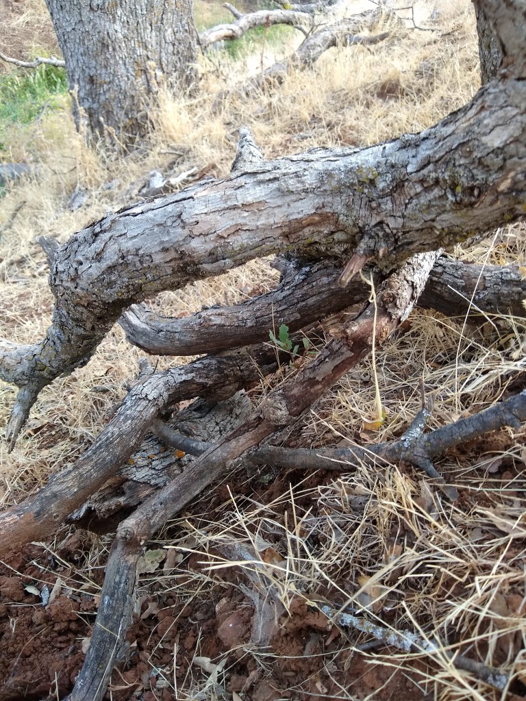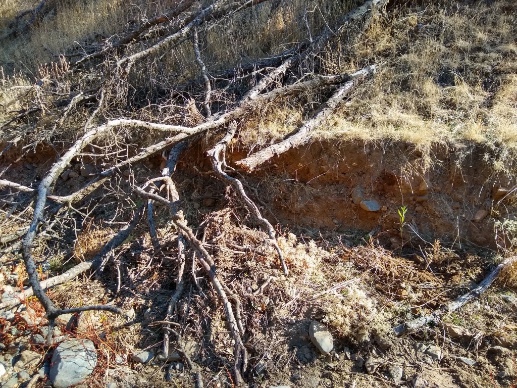 I hauled the branches down from the hills, some lifted, but if they are large, dragged. Oak branches are tortuous – twisted and gnarled. This is a good thing for the fence. The twists of the branch tangle with the others. My goal is to lock them together as much as possible to promote strength. They also create width in an attempt to keep the cattle as far a distance from the planted area.