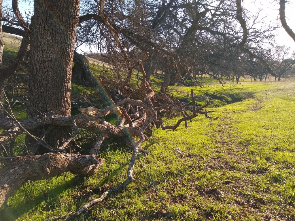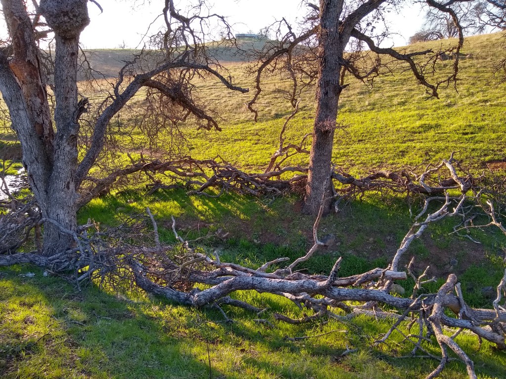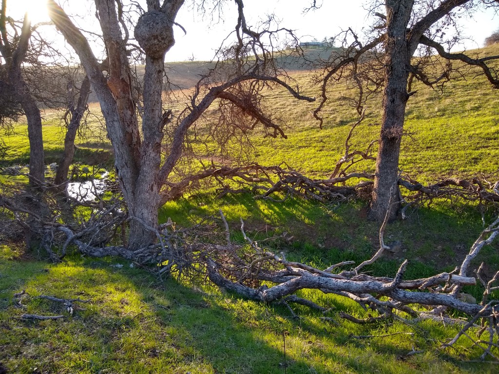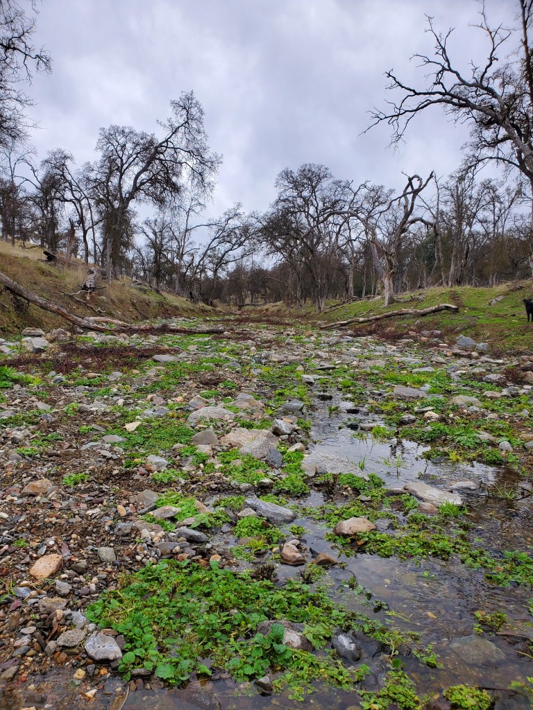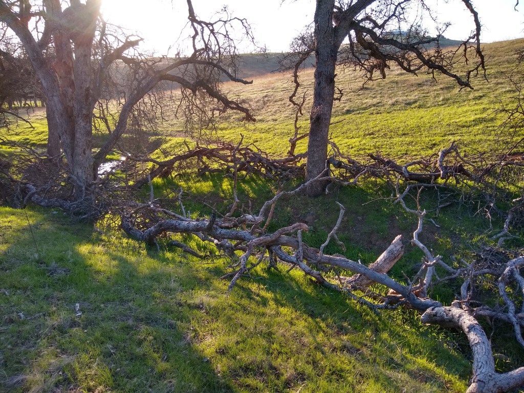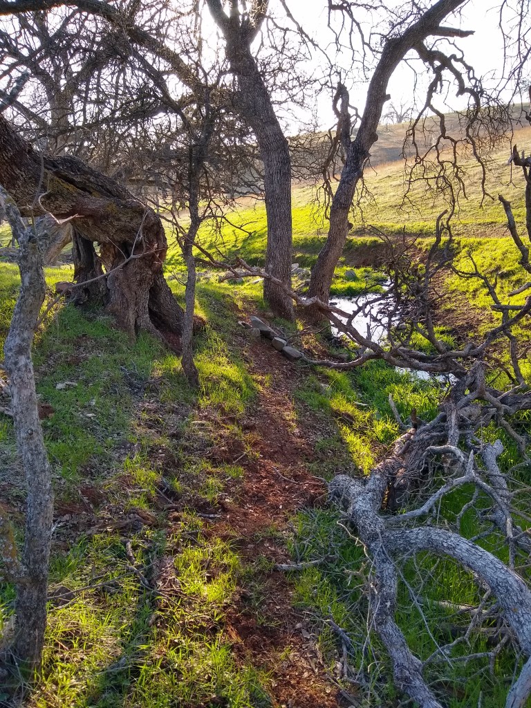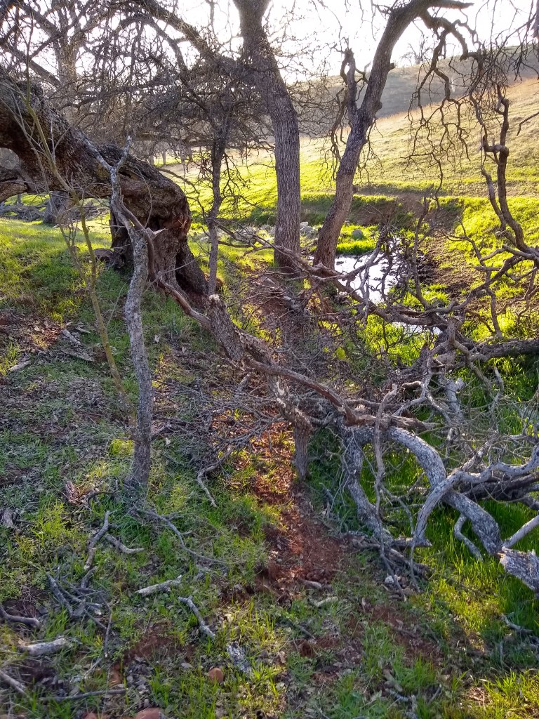 With my thumb still busted, wrist, knuckles and ankles still sprained, my job has been copilot, holding the water bucket with my good hand, carefully walking over to the tree, watering and removing the burlap and coir pad. David was doing everything else. As we went to each tree, I held my breath as I lifted the burlap shade cover, hoping I would see the healthy seedlings I had watered just 6 days prior. The two upstream on the Spring Creek…they looked great. I breathed out. The one by the lower pastures planted into the old dead oak, I lifted the cover, mostly eaten. There was one green leaf left. I’ll take it. Watered and screened. The discovery was unsettling. I became nervous for the others.