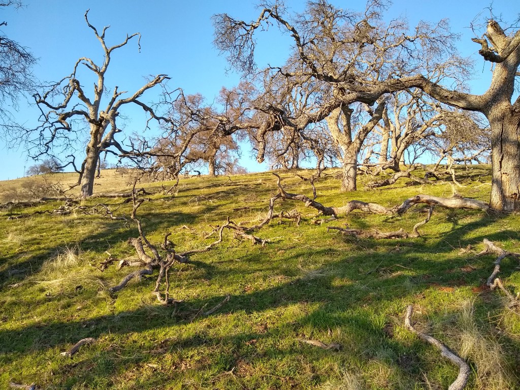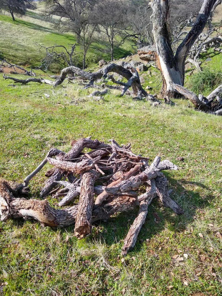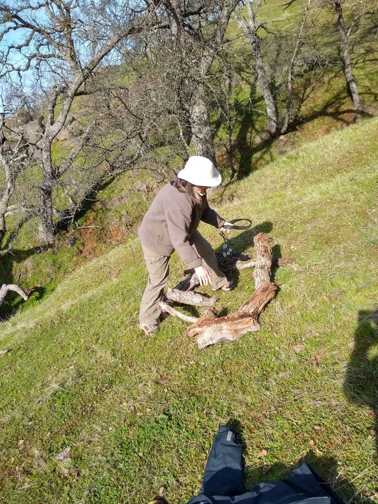 To do this takes time. The trees by the house got their boxes first. Then more needed to be built. Sam worked on the boxes while David and I placed what had been built. David could only work with me in short bursts because of his work schedule. It is laborious and very hand-oriented. You need to load water for the trees, load the boxes, the hammer, buckets and other tools to open cages or fix things. Then, you need to drive the polaris to the locations — no power steering. Next, you unload what you need, pull the huge, heavy tub with water toward the tailgate, unscrew the cap, hold onto the cap despite the pressure of the water in the large container, hold the watering can with the other hand or place on the ground, close the cap just right to prevent leakage (since you must have enough water for all the trees on your route.), haul the water, remove the shade burlap from the gopher cage, and water the tree. You need to pull up the coir pad so the screen box stakes can hit the dirt. Then, you go back to the cart, grab the screen box, lift it over the side of the cage. You need to alternate your hands through the openings in the cage, grabbing the screen box with one hand while placing your next hand through the next level of holes to grab the box, gently lowering it down over the oak in its gopher cage. This takes time. It is a gentle operation because you don’t want to risk dropping the screen box in the cage out of reach or breaking a branch on the seedling. Next, you carefully fit the screen over the gopher cage. They are designed to just fit. You don’t want to be too strong with it or the screen may pull off the staples or wood crack. You pull it over the gopher cage like a condom, then take your hammer and pound the wood stakes into the moist ground with the hammer. You then squish dirt up against the screen so there is no entry point for the hoppers. You place the coir pad back around the blended unit, grab the discarded hammer, walk back to the polaris and do it all again. Ideally, you don’t want to have to open the cage. That takes much more time – so you have to be careful.