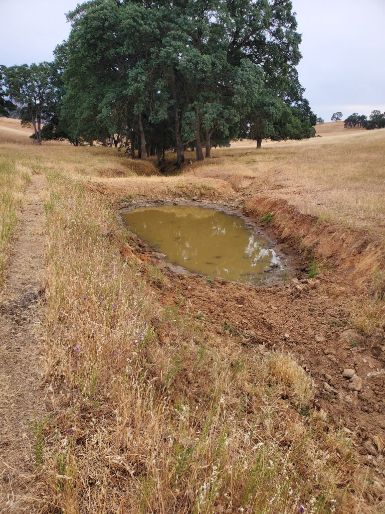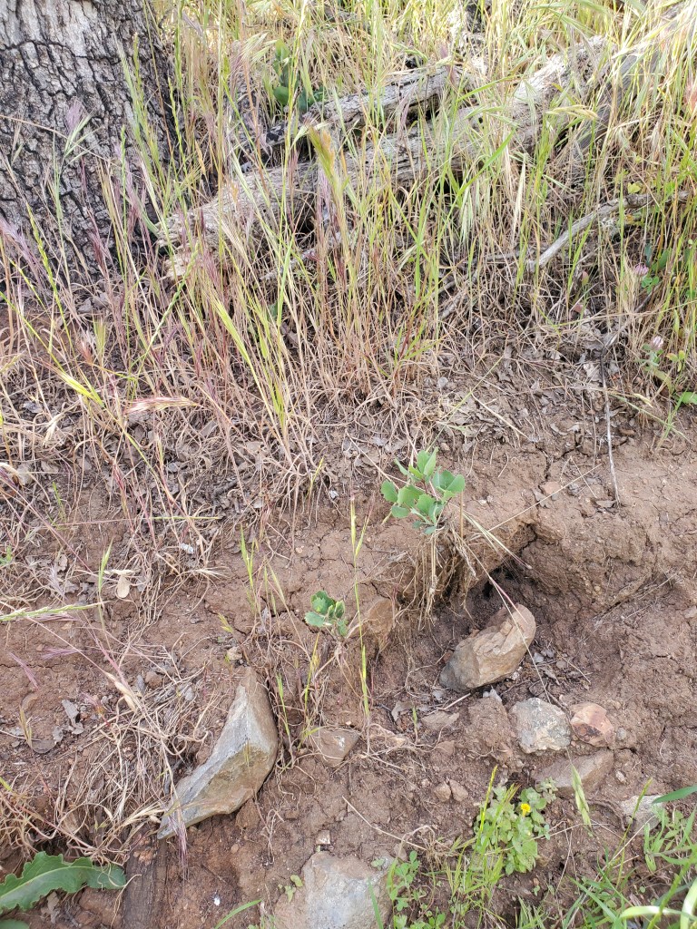 Most of the planted oaks are surviving. We lost two of the 19 seedlings. The areas with acorn plantings – none of them came up. The acorns were all taken. However, there has been a blockbuster of natural recruitment (oaks emerging naturally from acorn). While weed eating, David found one hundred emerged oaks around one of the grandmother blue oak trees. We have looked at other nearby oaks and found more seedlings. Evidently, there is the right combination of moisture, acorn and soil conditions to allow for massive propagation. Don’t get too excited. Most of those babes will get eaten. With vigor, David flagged the seedlings so he could keep an eye on them and continue to pull grass as new shoots grew, but he quickly saw that these seedlings were also delicious meals for gophers. We are going to try to cage some of them and water them – especially outside of the enclosure where the cattle graze.