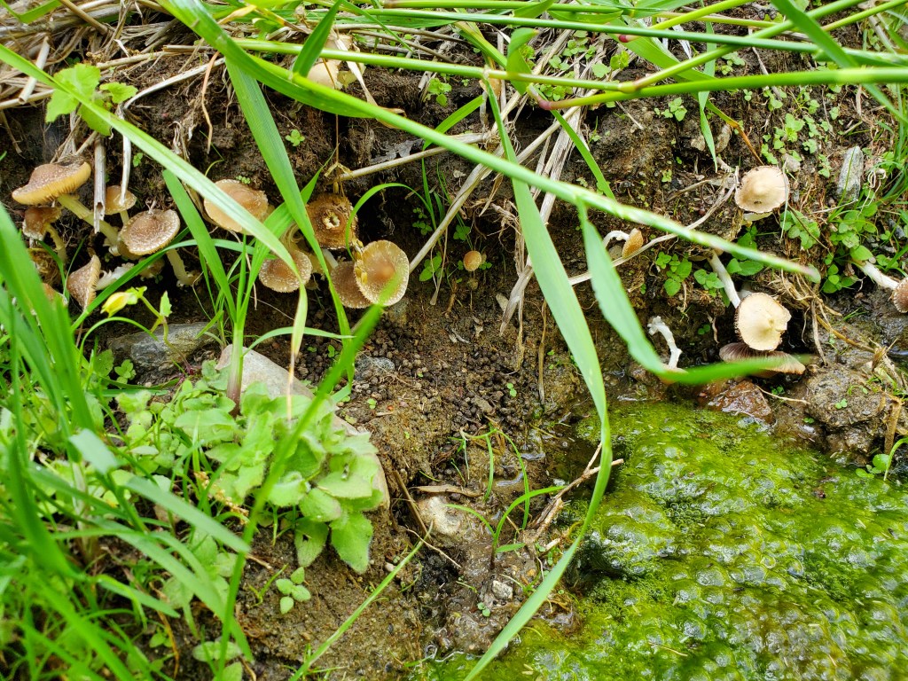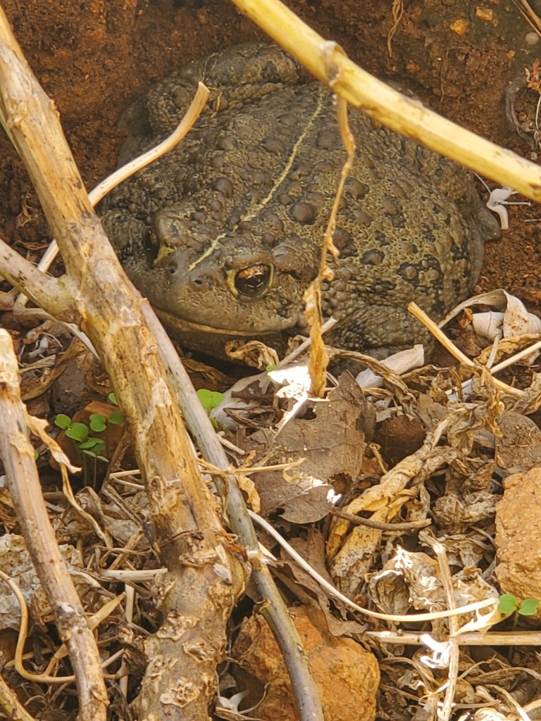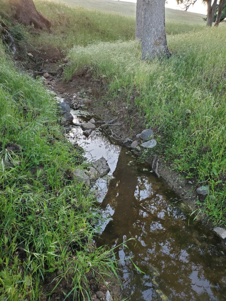 When David and I went to check on Guzzler 2 and cut up the downed tree across the road, we noticed that there were hundreds of what looked like little baby toads hopping around the Odom Creek riparian area. I had Dave stop the Polaris and keep it parked at the top of the hill, so we didn’t impact (read: squish) this incredible hatchery of hundreds of amphibians. We had to haul all the equipment by hand across the creek and up the other side, deal with the tree, then move on to the Guzzler 2 to troubleshoot the camera and weed around the guzzler. Fortunately, David is incredibly strong. He hauled all the chainsaw equipment, and I, with my bum leg and bum right hand, carefully carried the bag of game cam equipment.
