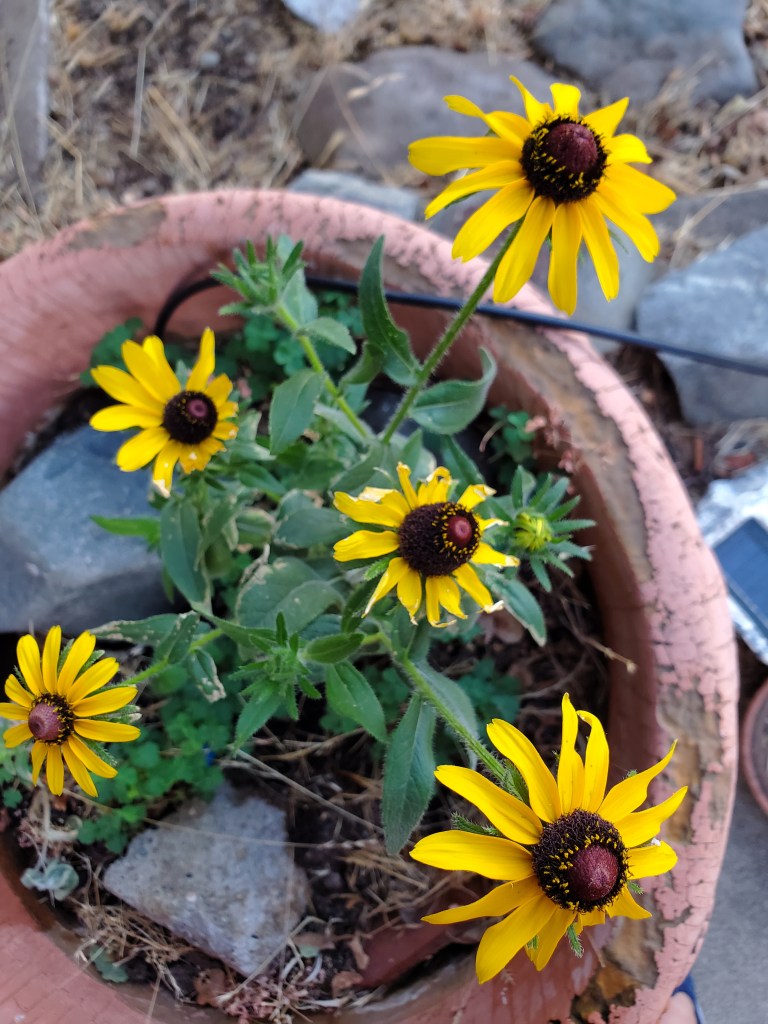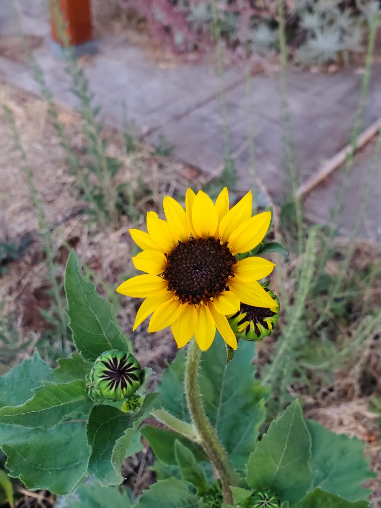 Blooming on July 13 when I began this post and mostly still blooming now are pacific asters, datura, sunflowers, matilla poppy, California poppy, narrowleaf milkweed, California fuchsia rabbit brush, black-eyed susan, marigold, sulfur buckeye, and worm wood. There were a couple small blooms on the white sage, basil and other garden items.